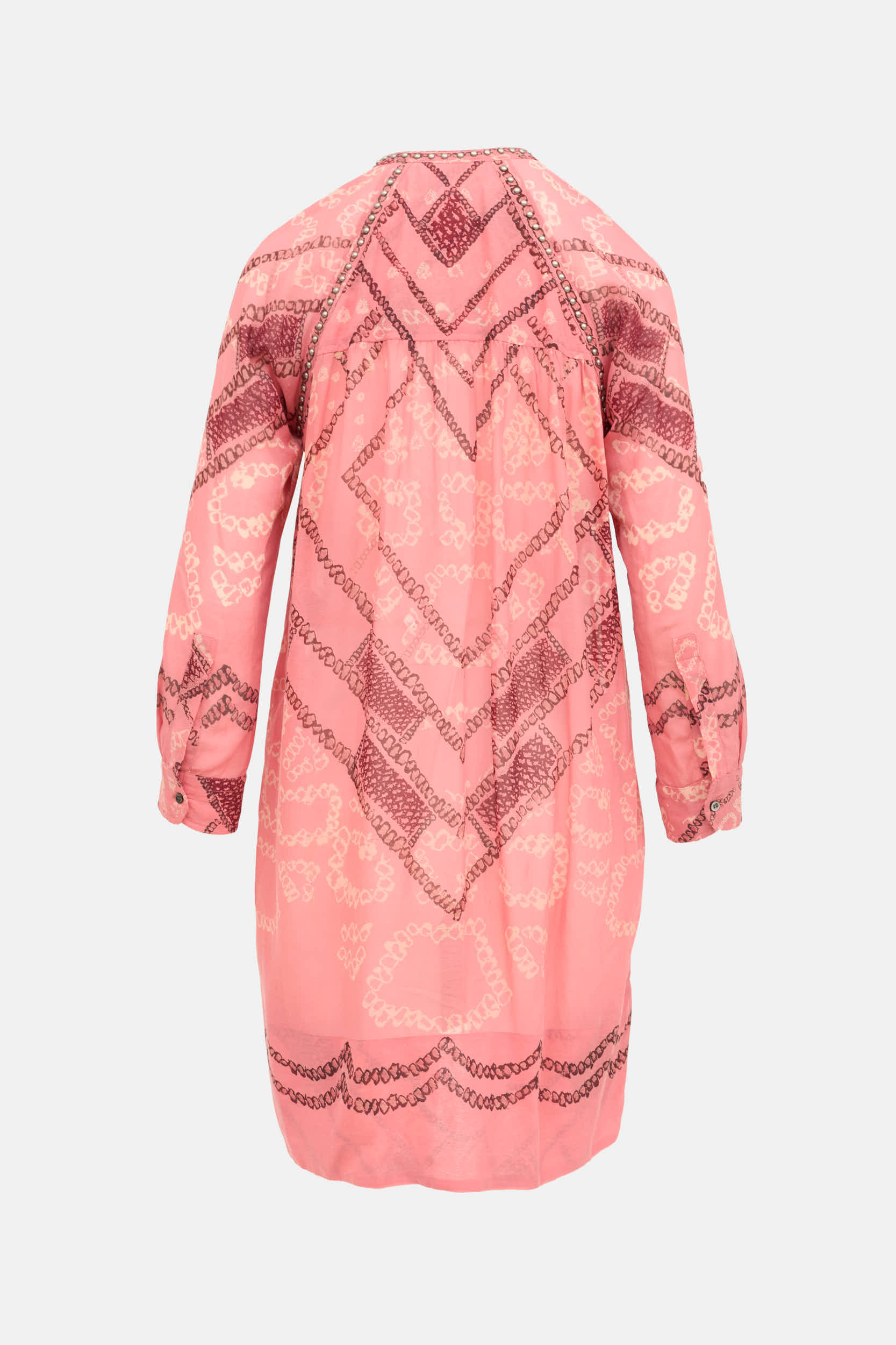 Pre-owned Isabel Marant Étoile pink dress featuring a brown pattern throughout, keyhole neckline, silver tone studded detailing, long raglan sleeves, and two slip pockets at hip.