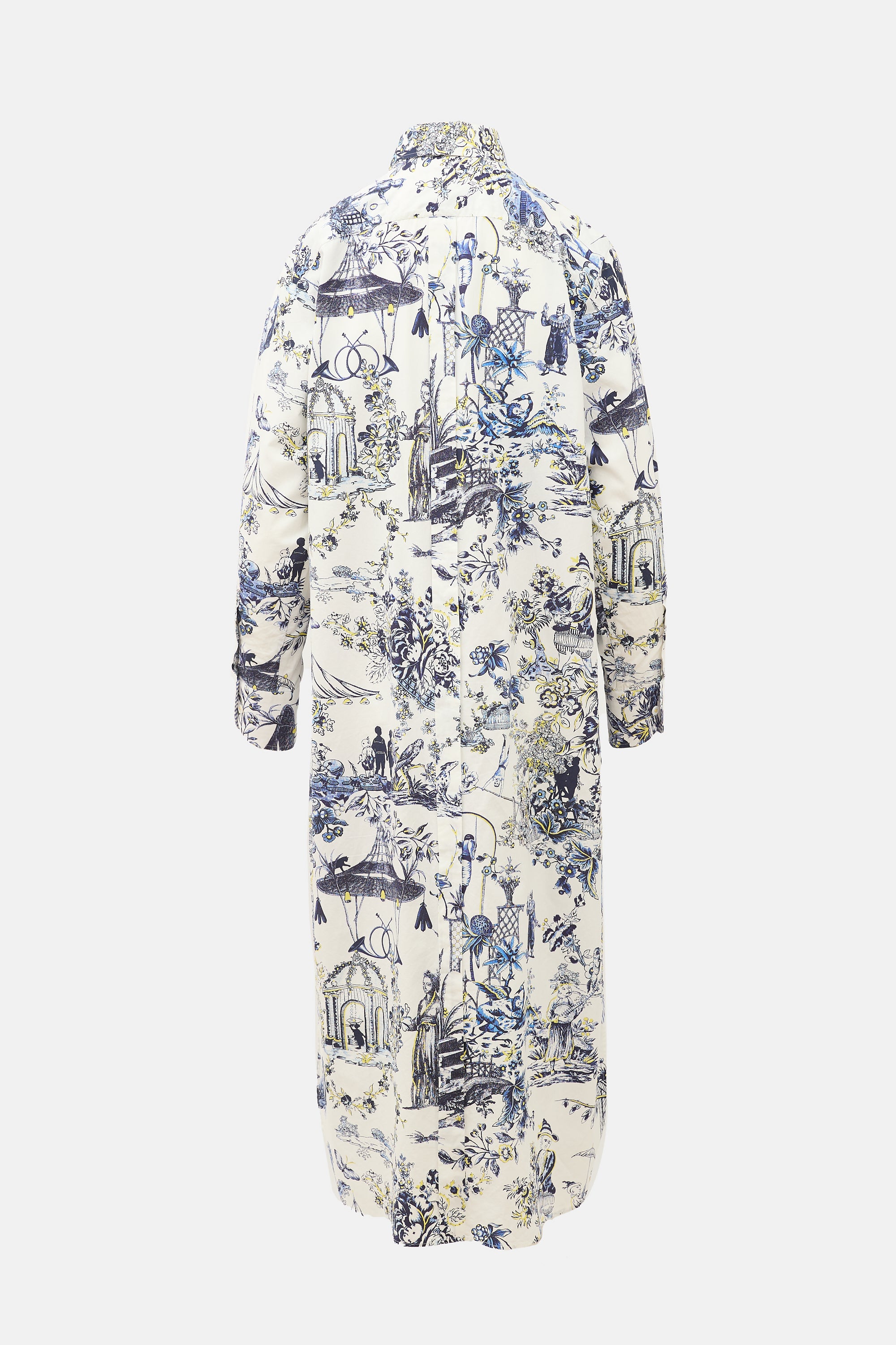 Pre-owned Laboratorio Capri white, blue, and yellow cotton maxi shirt dress featuring a point collar, character and floral print throughout, button front, one patch pocket at chest, box pleat at back, and long sleeves with buttoned cuffs.