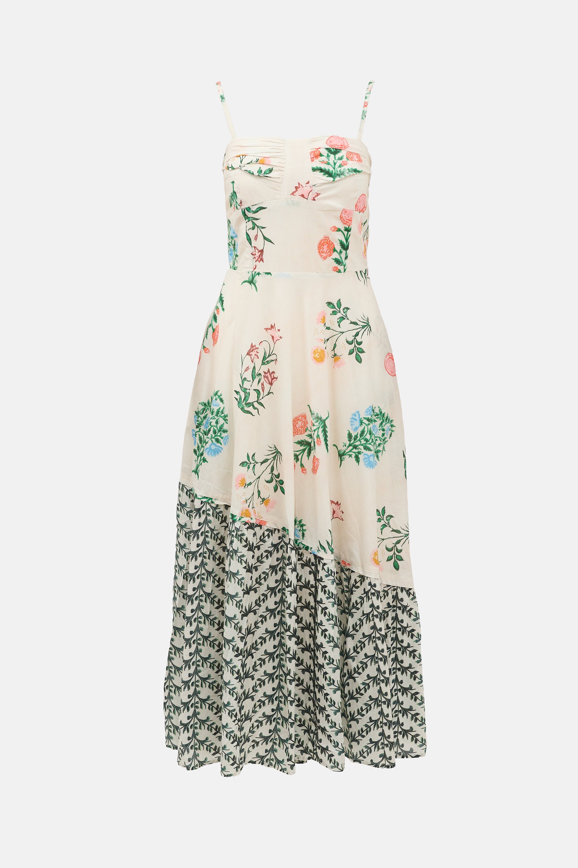 Maria Cher cream and multicolour Almirante Valery dress featuring sweetheart neckline, floral print, adjustable spaghetti straps, two inseam pockets, zip closure at side, and smocked back. Lined.
