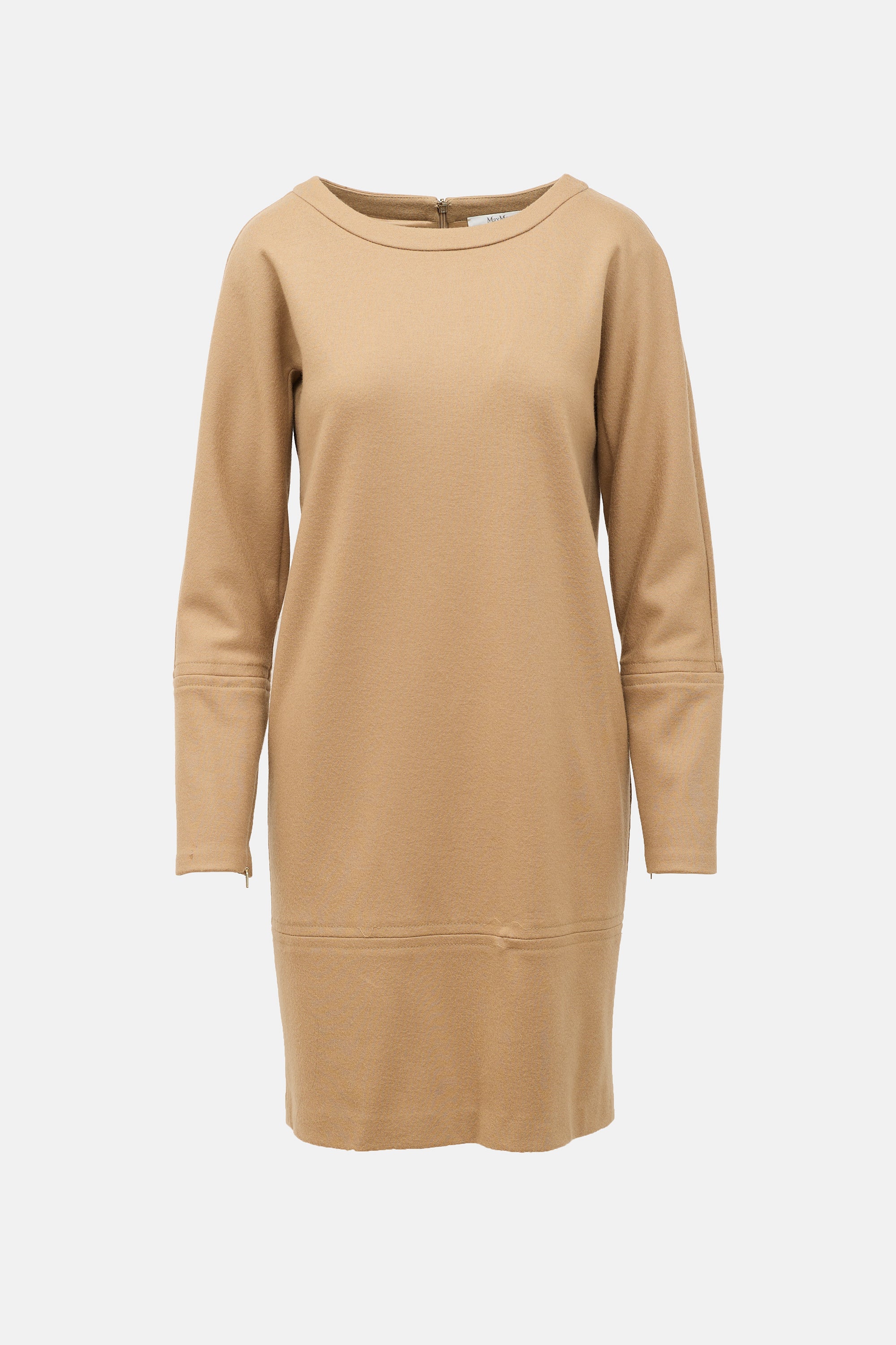 Pre-owned Max Mara beige shift dress featuring round neckline, long sleeves with zip cuffs, and zip closure at back. Lined.