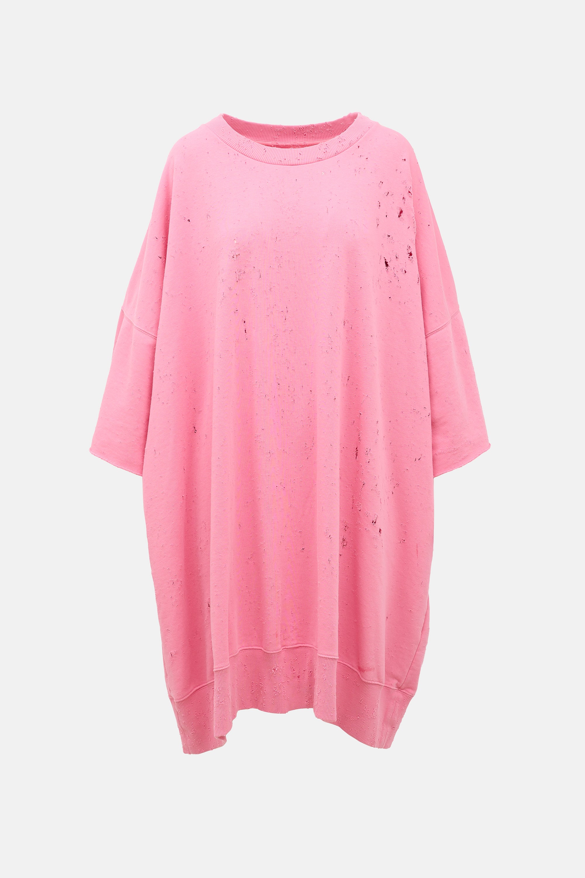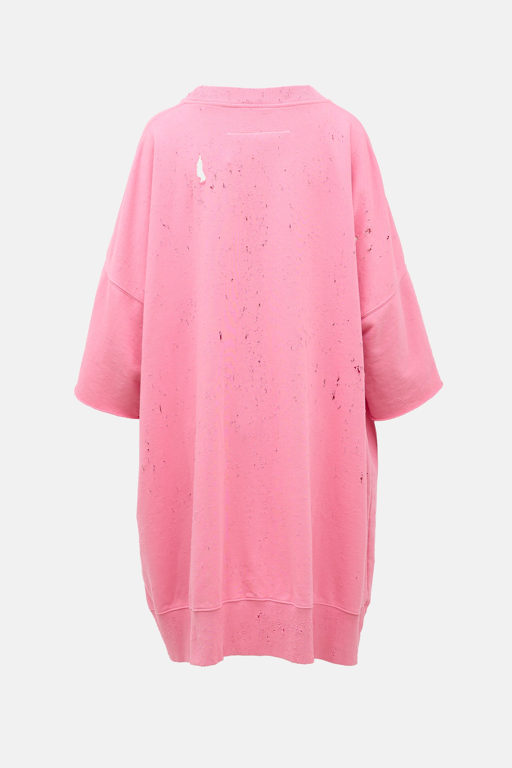 MM6 Maison Margiela pink oversized sweater dress featuring a crew neckline, intentional rips throughout, raw edge cuffs, and a ribbed hemline.