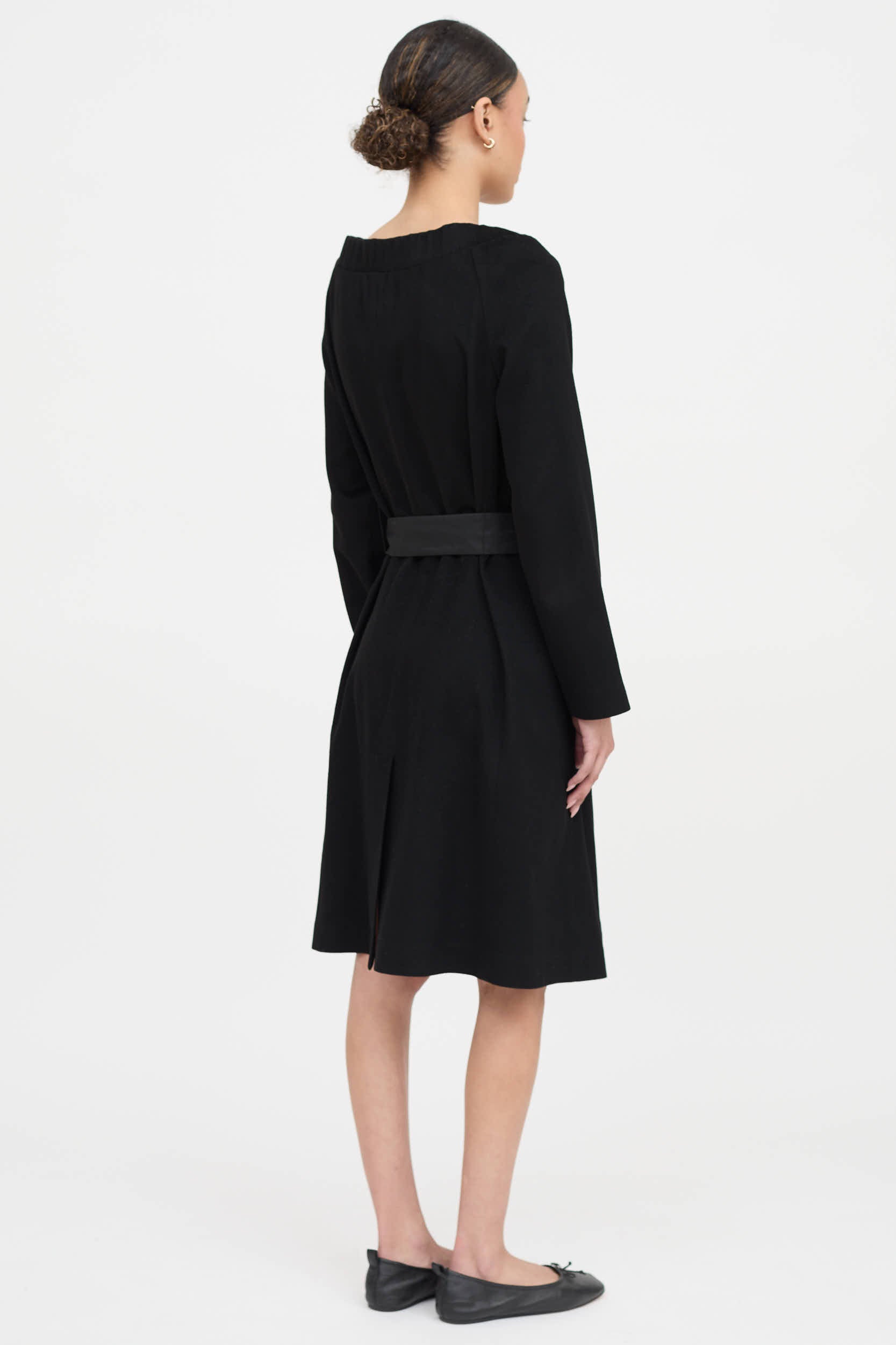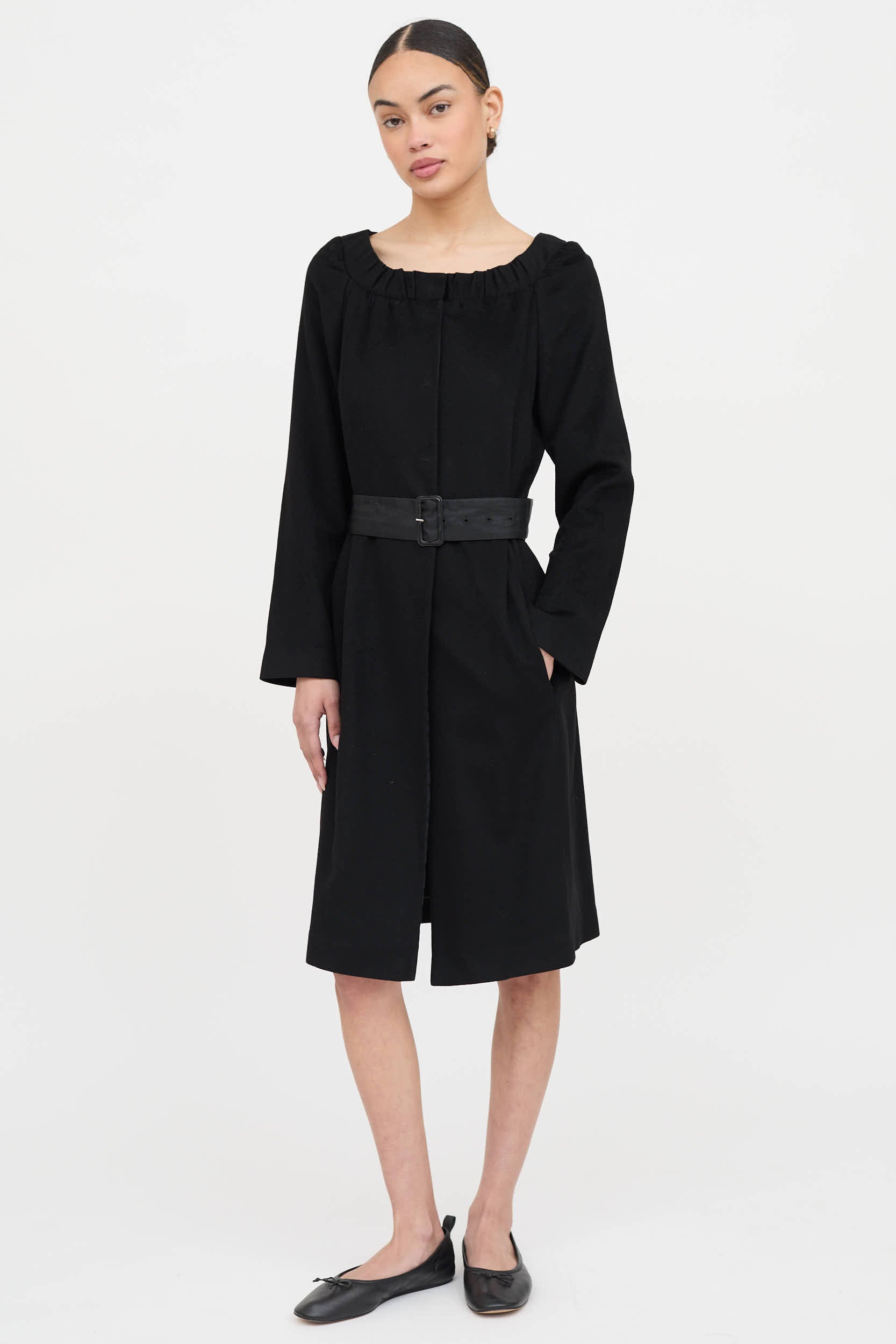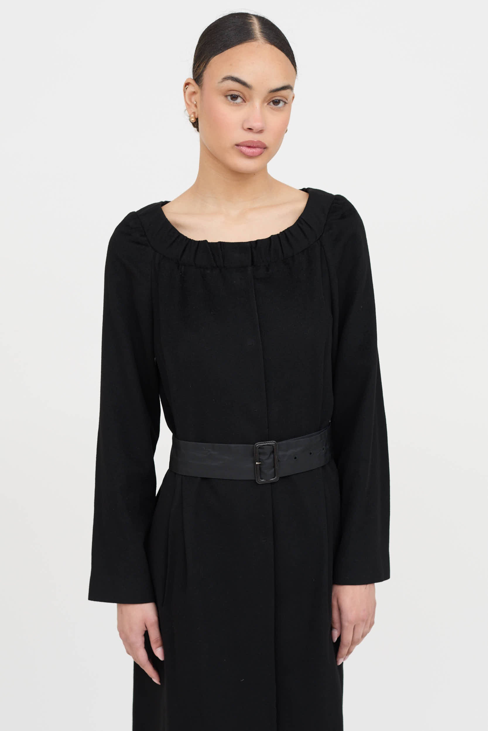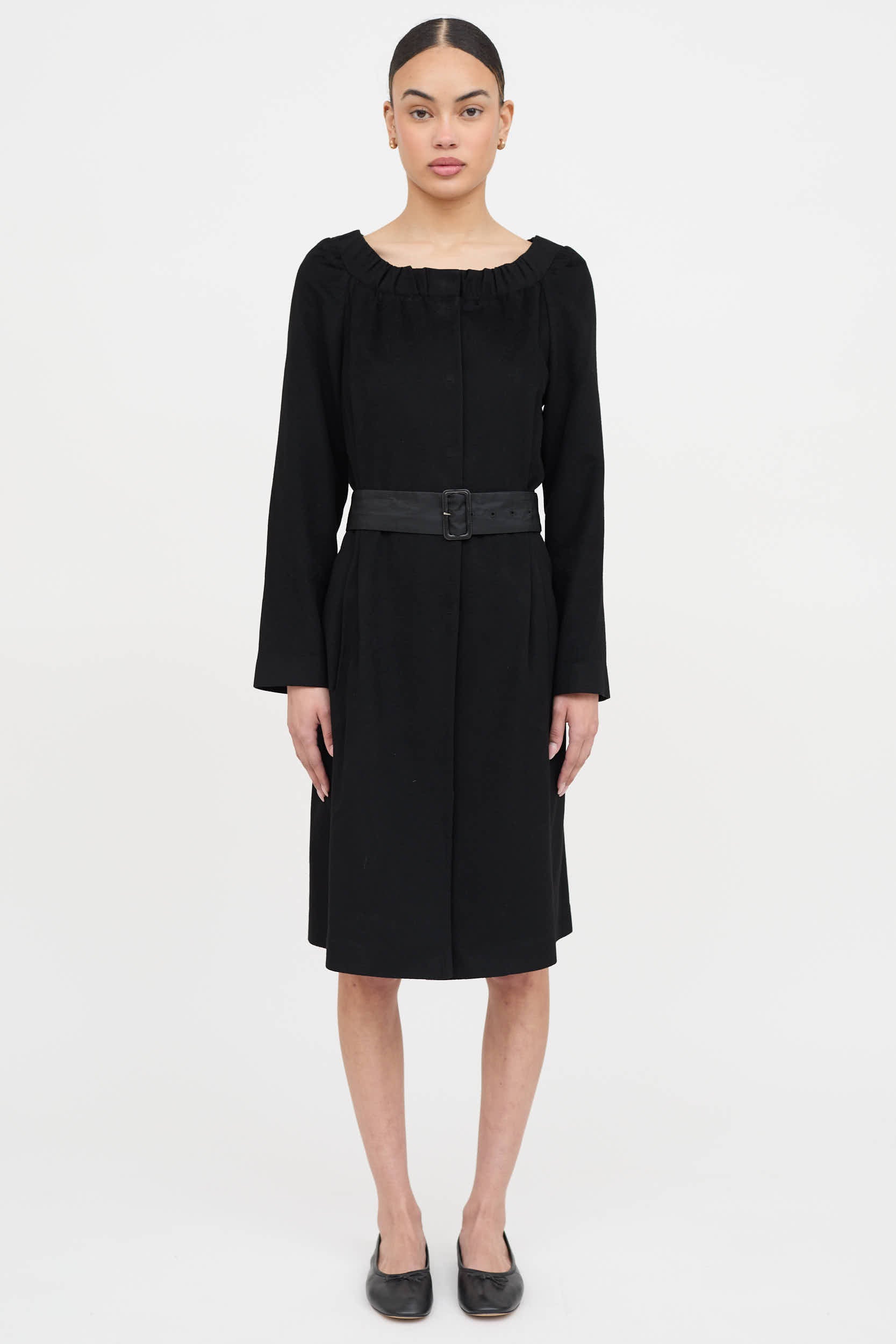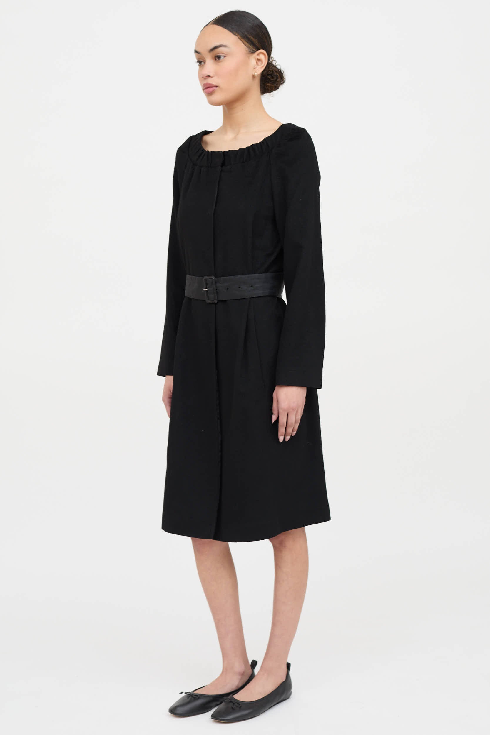Pre-owned Prada 2007 black wool dress featuring wide neckline, snap button closure, on seam pockets, long sleeves, rear vent and nylon belt. Partially lined.