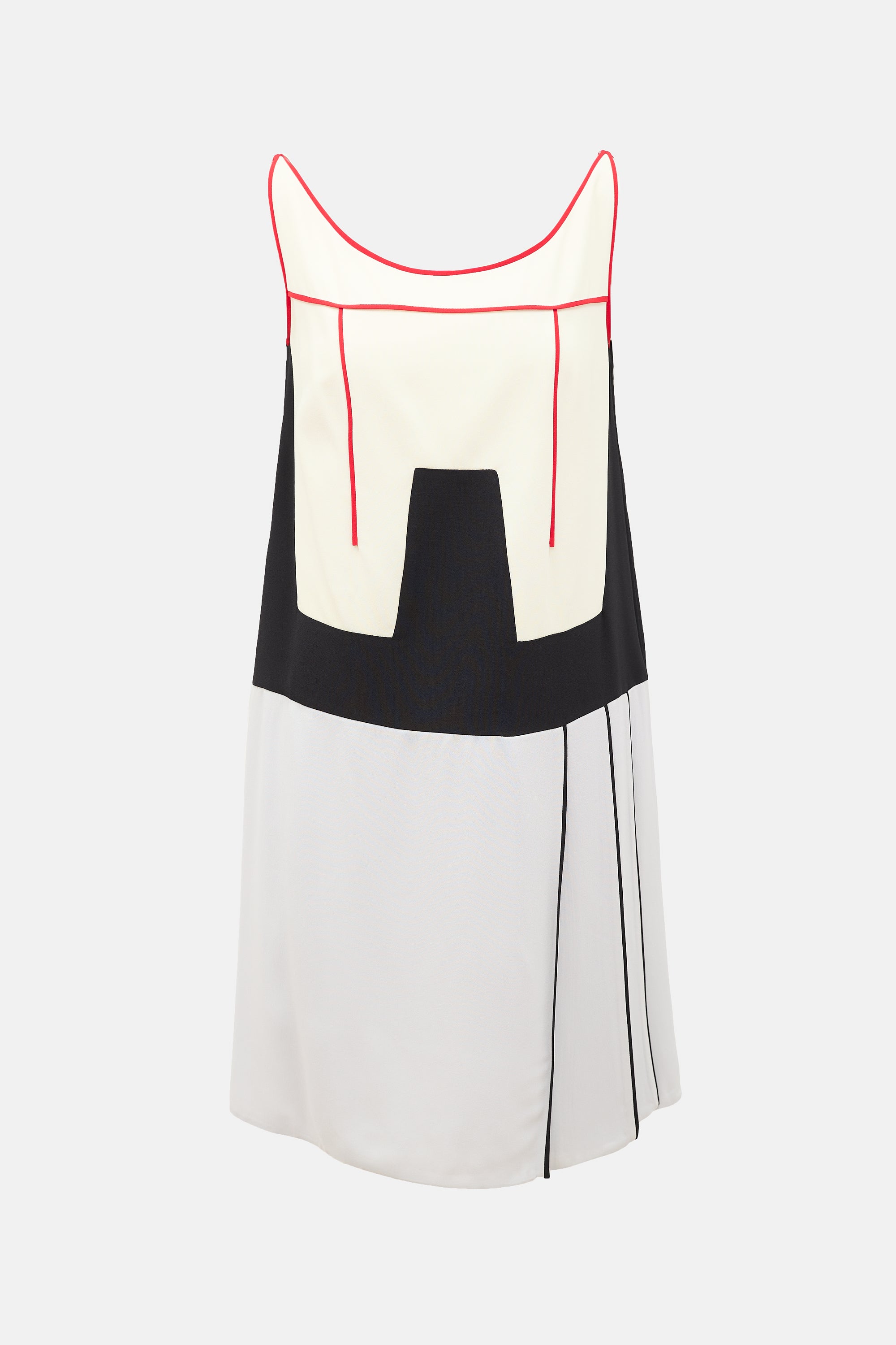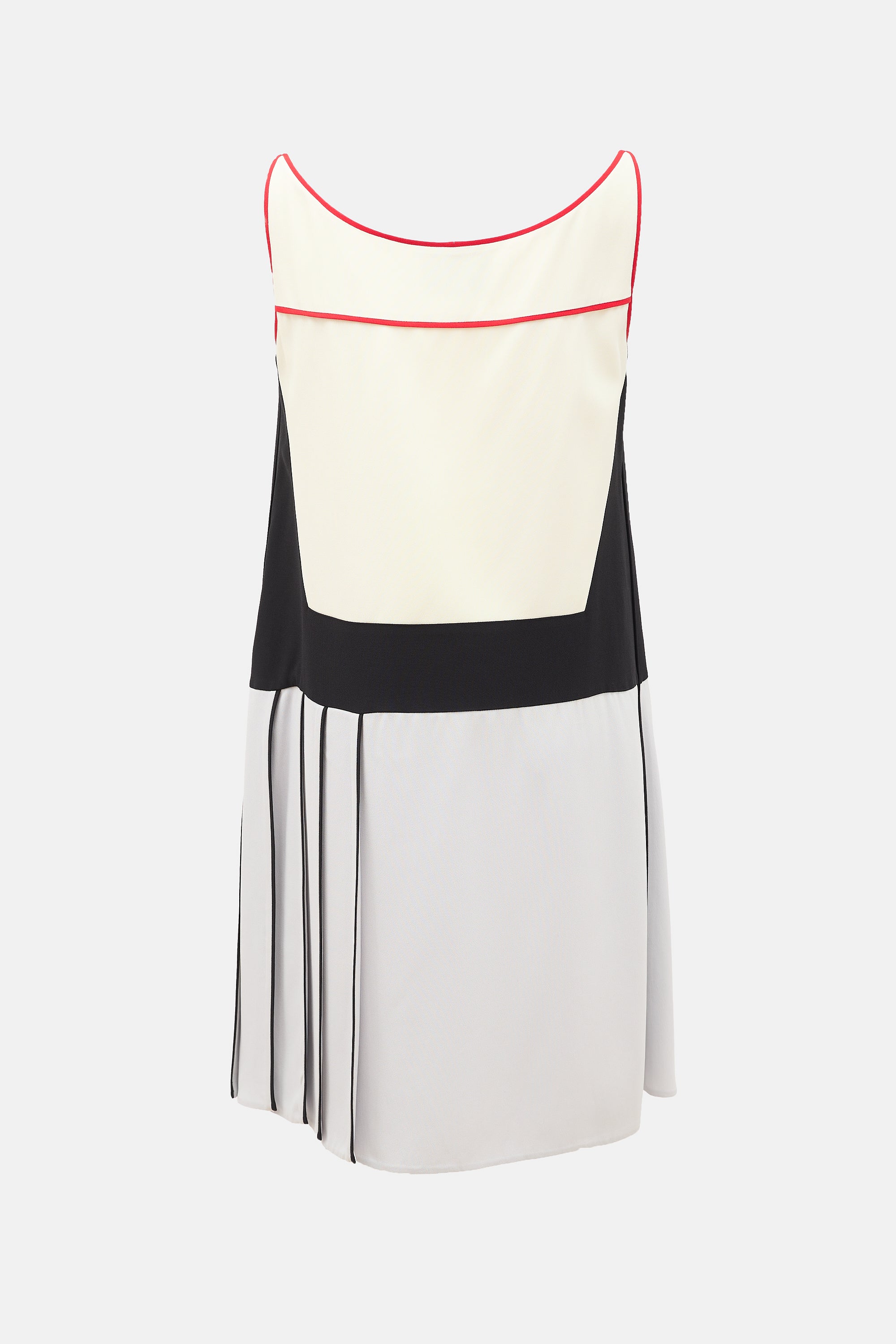 Pre-owned Prada Spring/Summer 2016 cream, black, and grey midi dress featuring bateau neckline, red trim, pleated skirt, and concealed side zip closure. Lined.