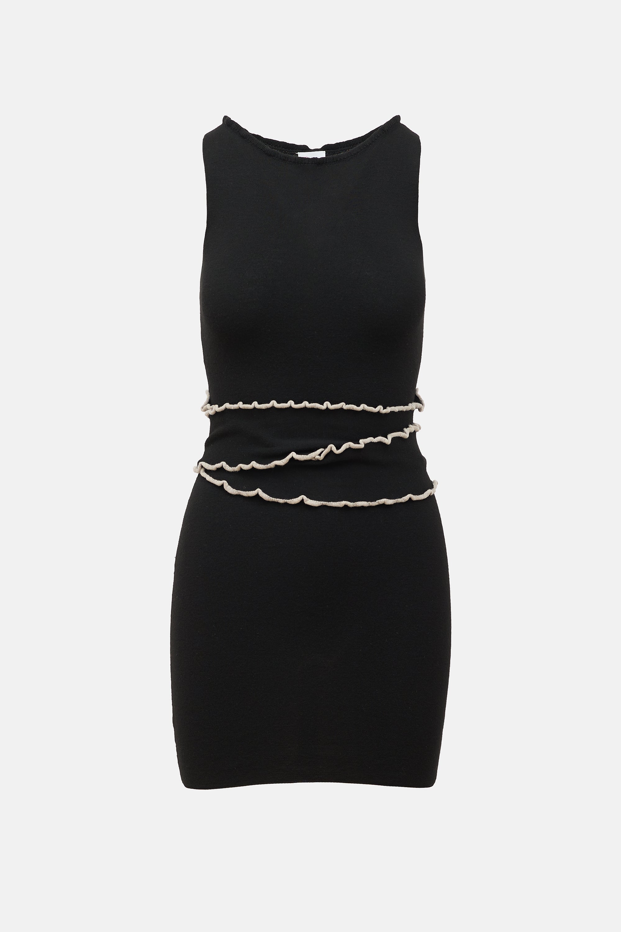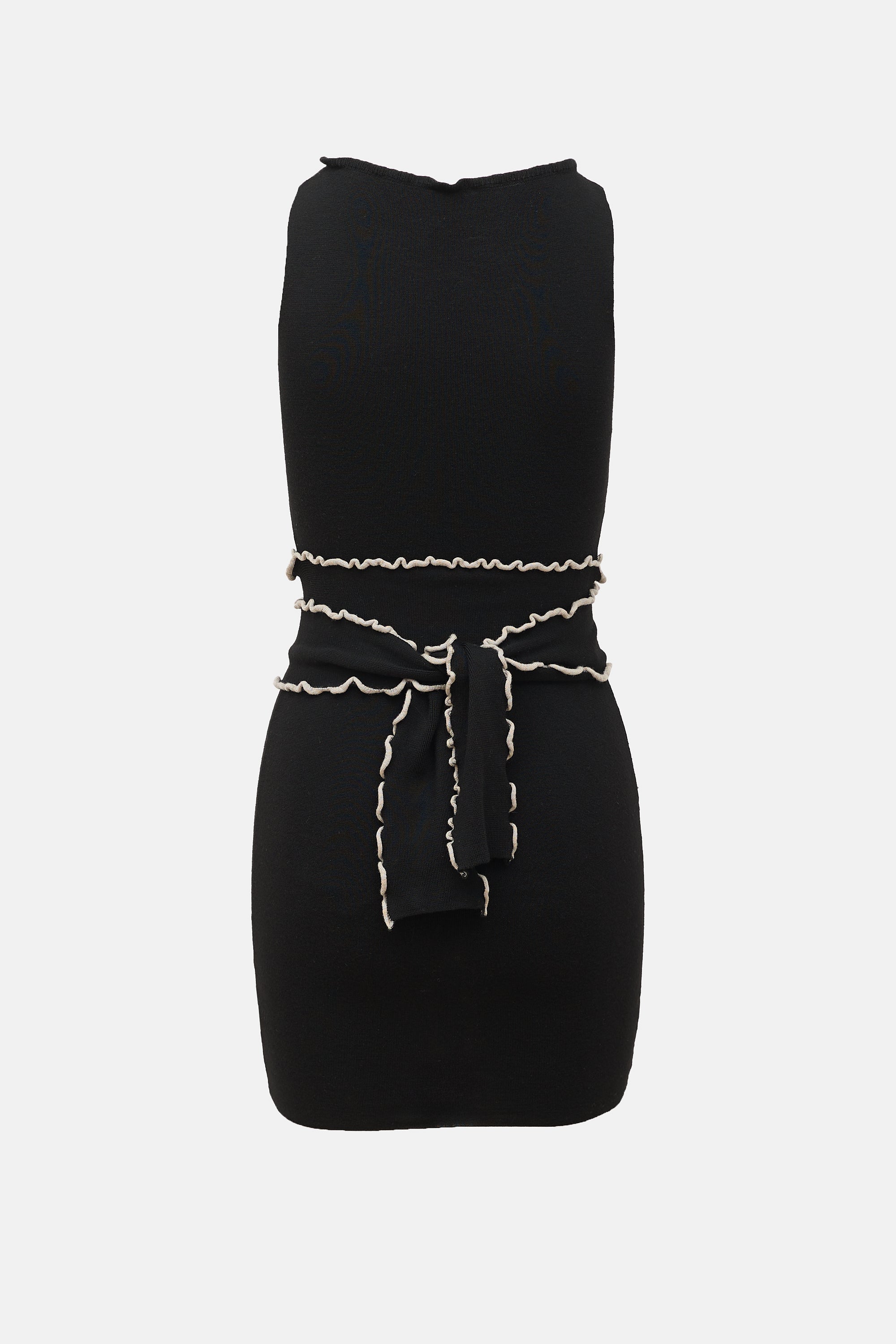 Pre-owned Red Valentino black knit dress featuring crew neckline and self tie waist belt with contrast lettuce trim.