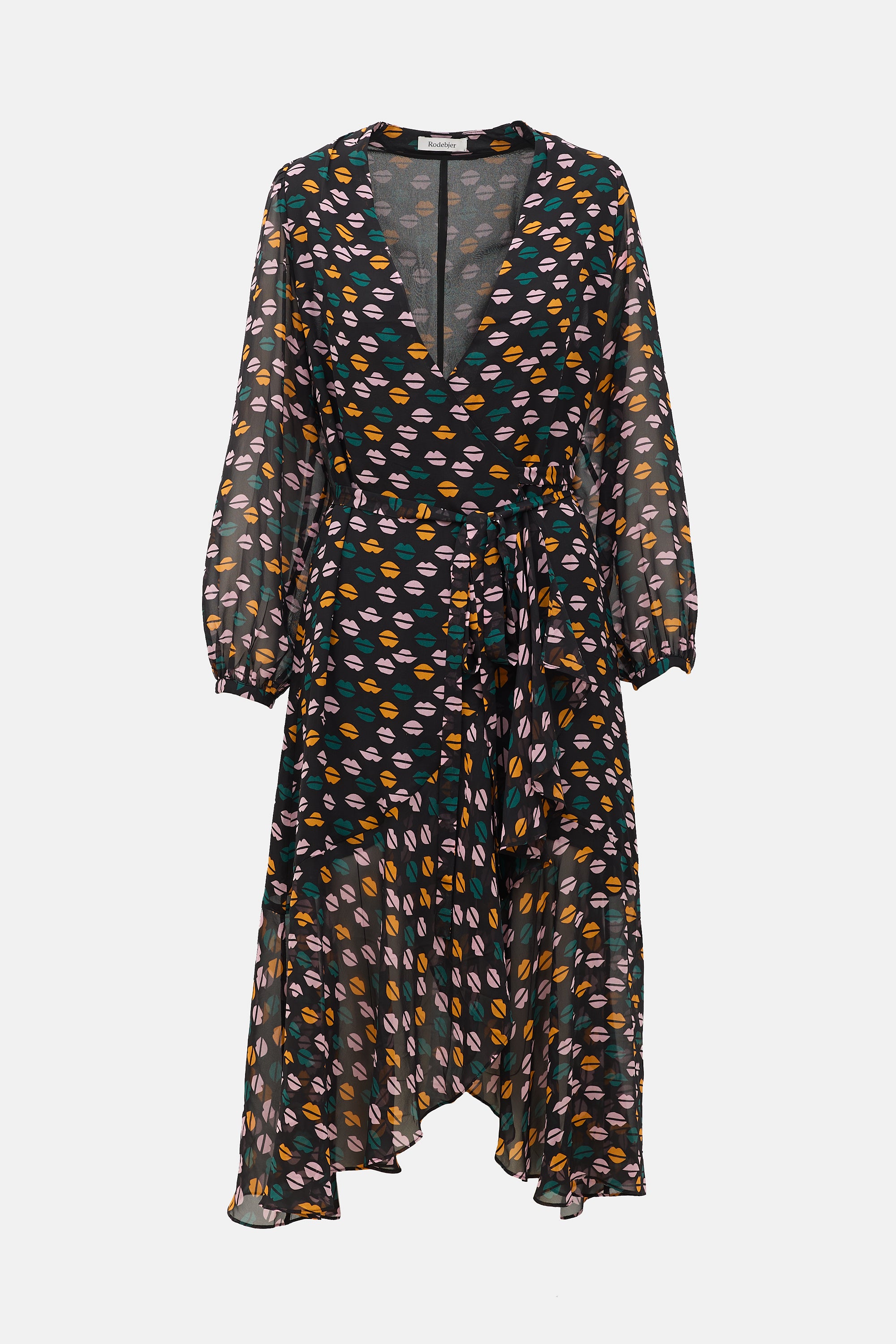 Pre-owned Rodebjer black and multicolour silk dress featuring lip print, surplice neckline, sheer bishop sleeves, ruffle skirt, and wrap closure with self tie belt. Lined.