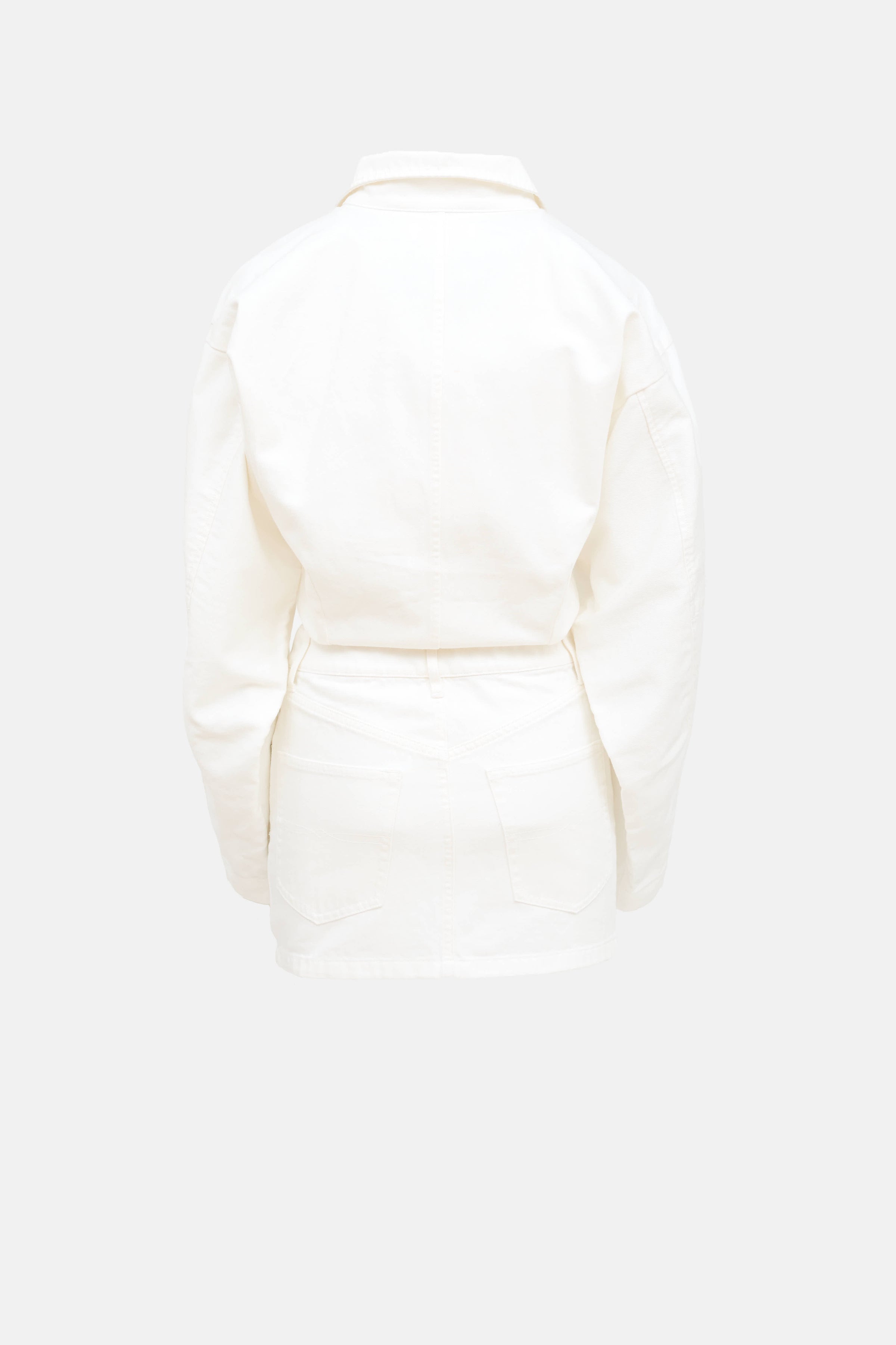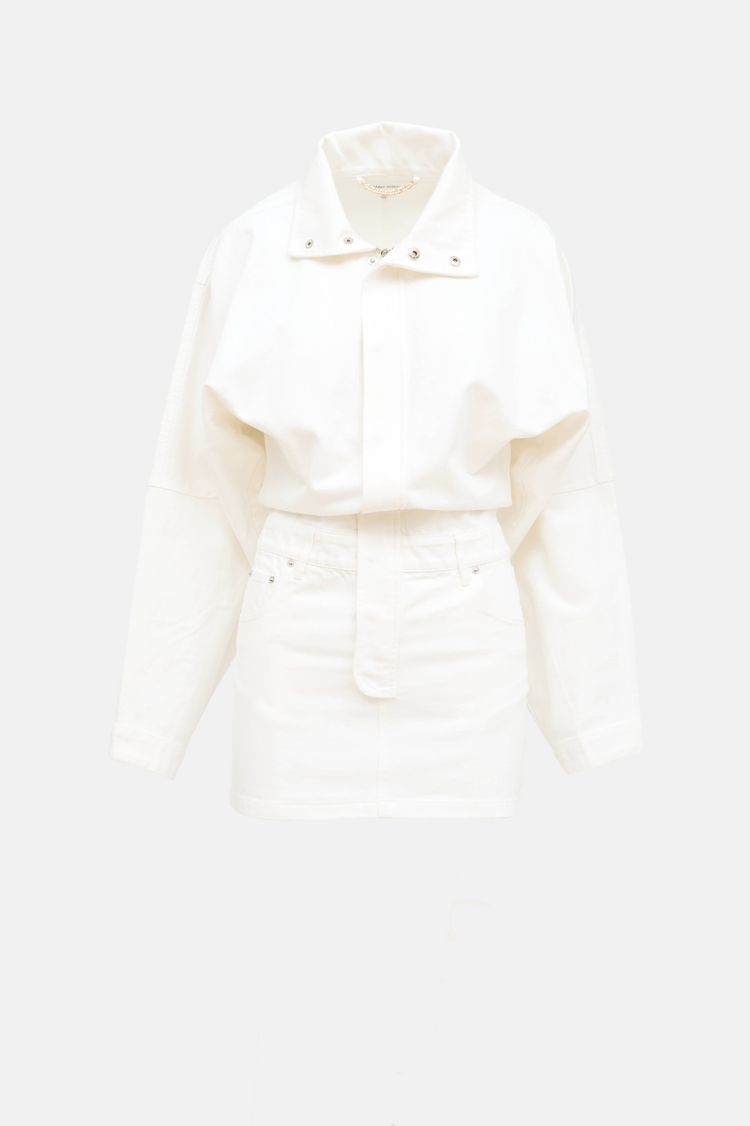 Ronny Kobo white Andy denim dress featuring a funnel neck collar, long sleeves, five pocket styling, and zip closure.
