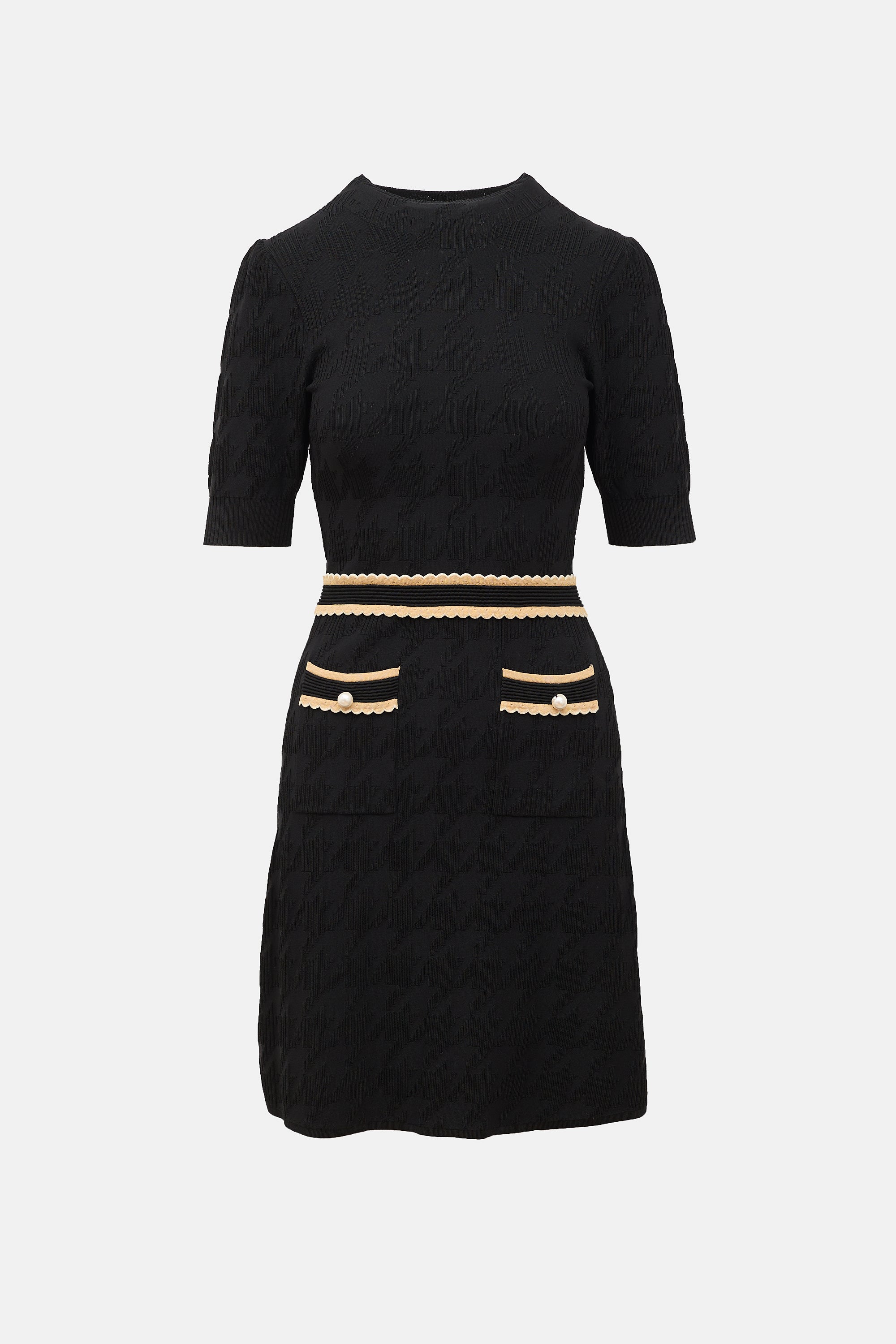 Pre-owned Sandro black knit dress featuring crew neckline, tonal houndstooth intarsia, two hip pockets, and brown scalloped knit trim.