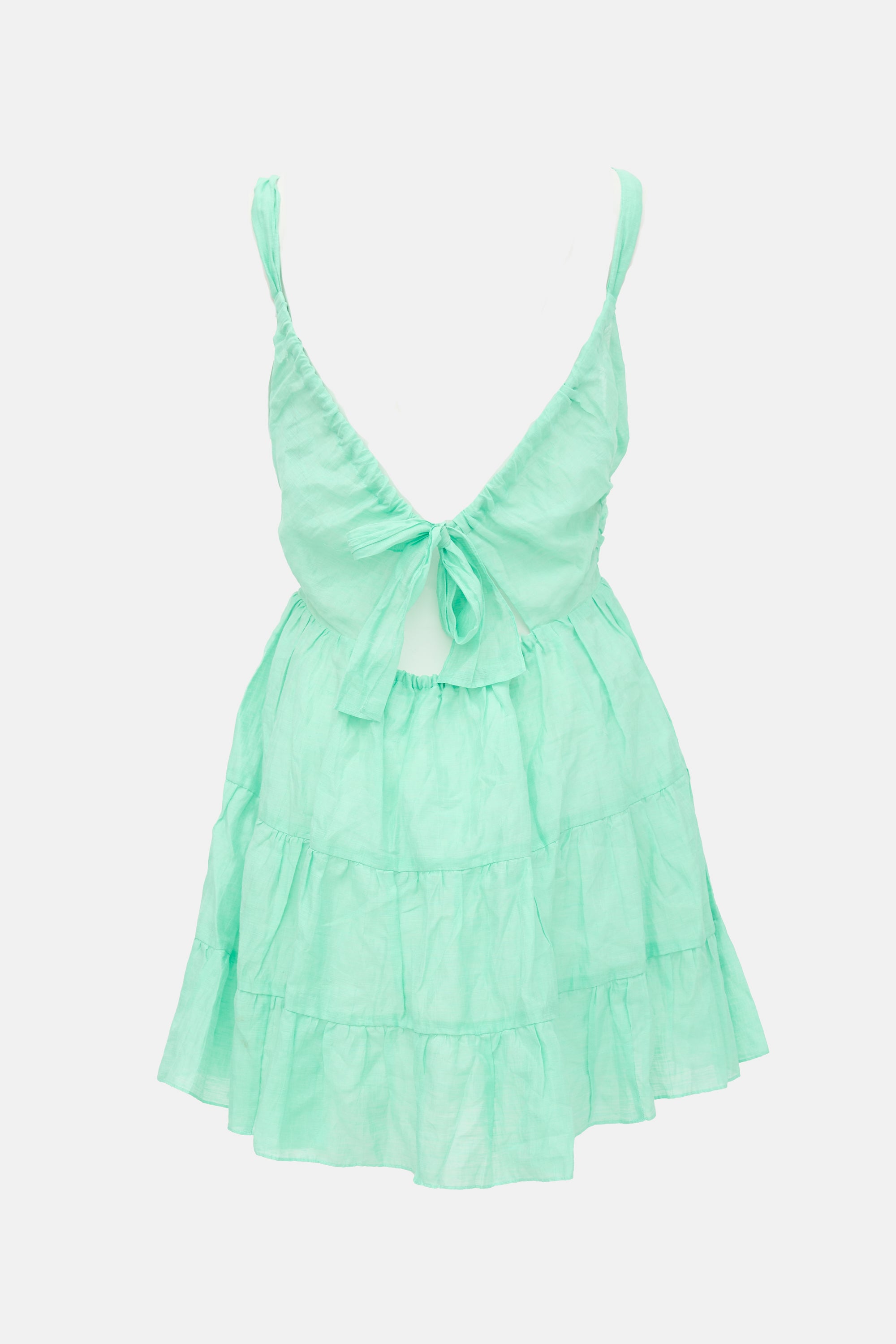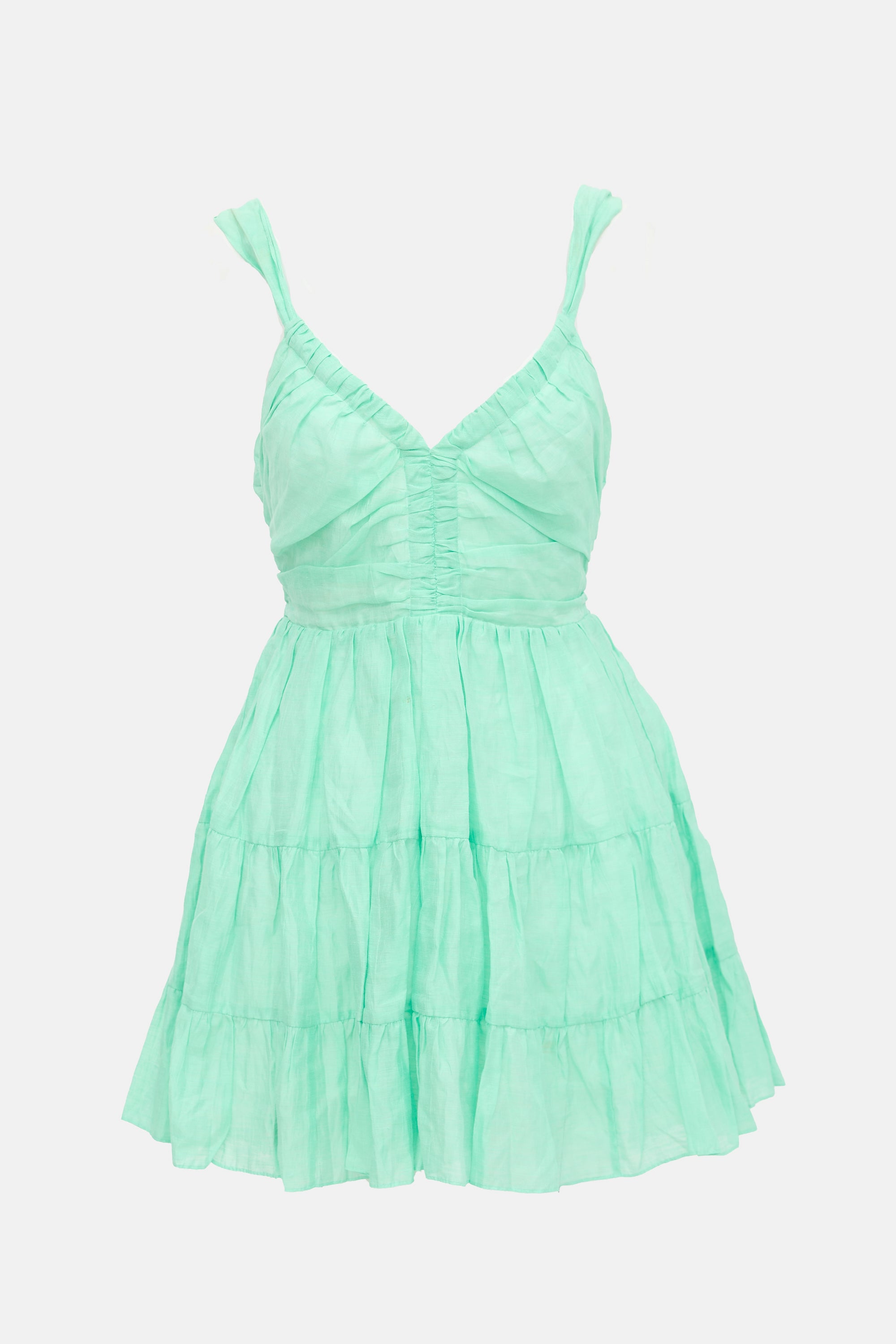 Pre-owned Sandro green linen mini dress featuring a V-neckline, open back with self-tie, ruching throughout, and tiered skirt. Lined.