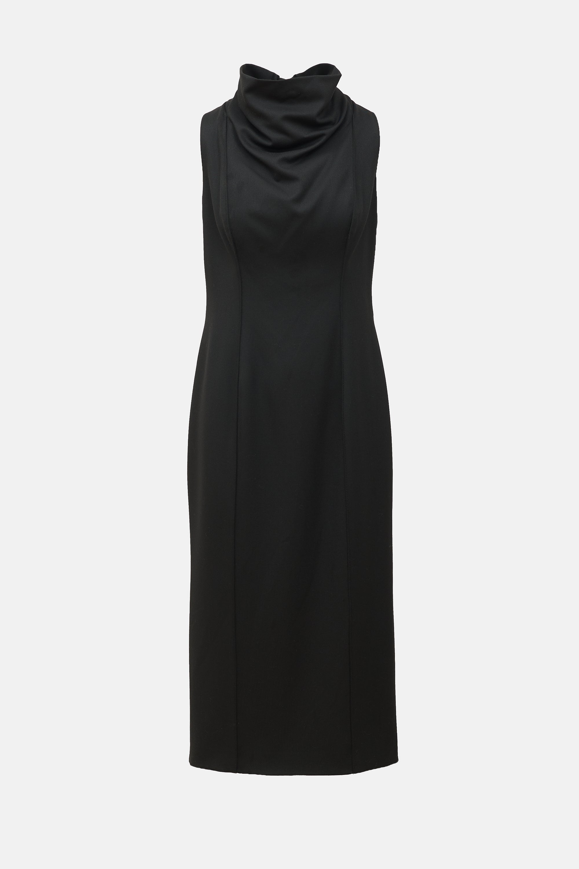 Pre-owned Smythe black shift dress featuring ruched collar, tapered seams, zip closure at back, and back vent. Lined.