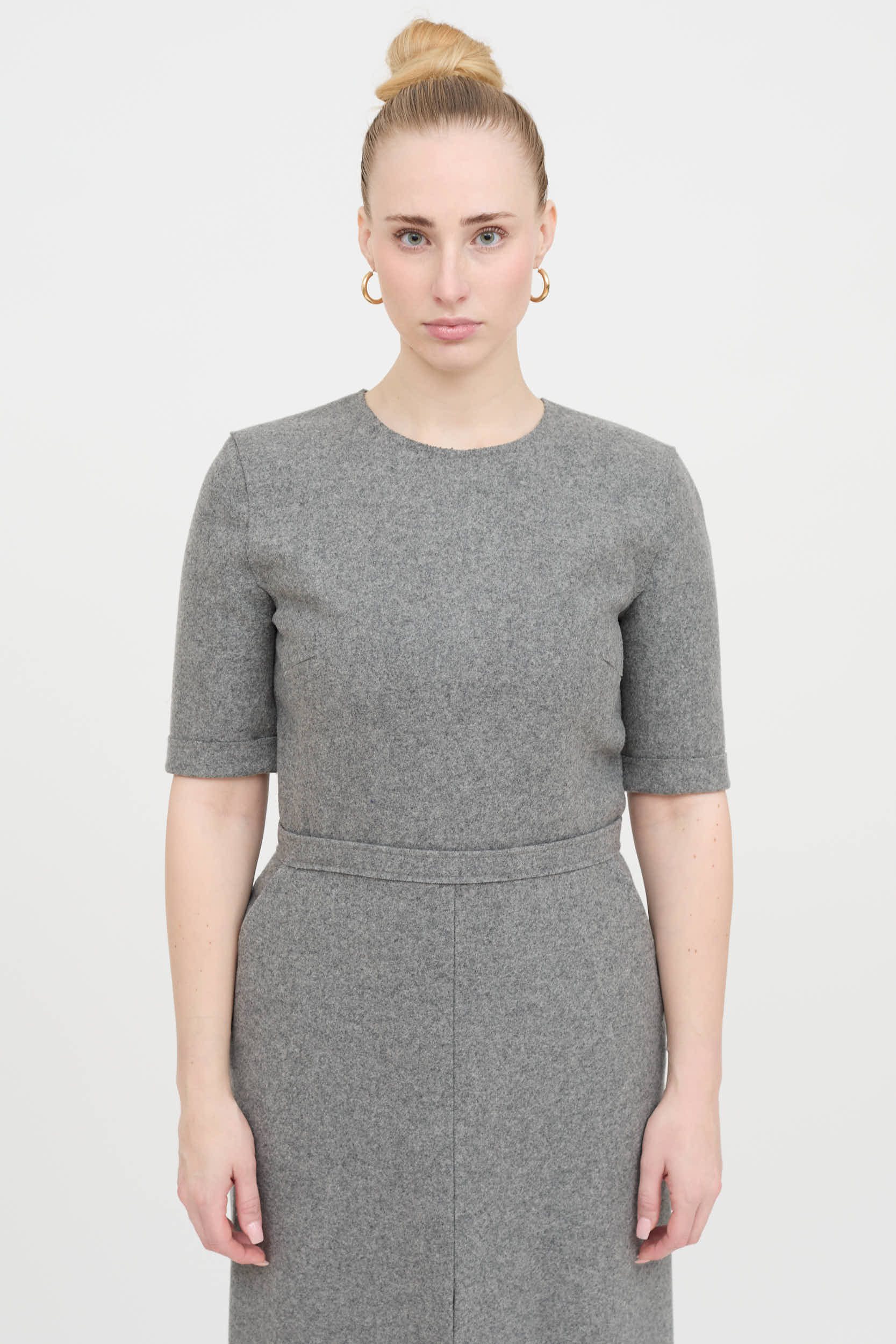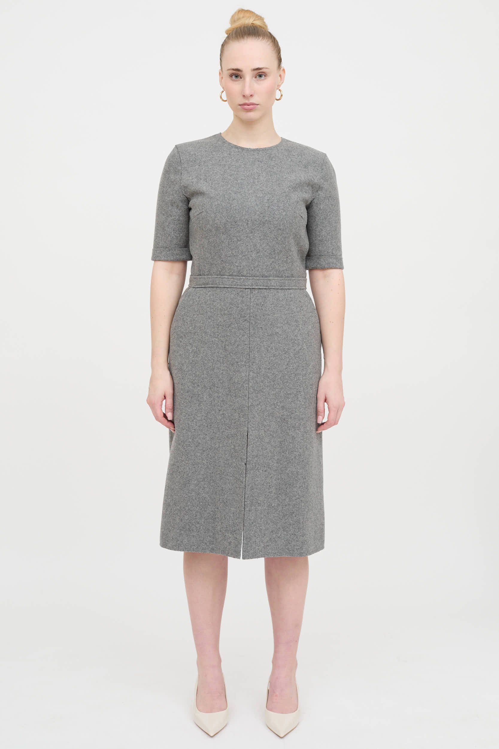 Pre-owned Victoria Beckham grey wool short sleeve dress featuring round neckline, folded cuffs, darted chest, paneling at waist, slit pockets at side, slit at hemline, and zip at back.