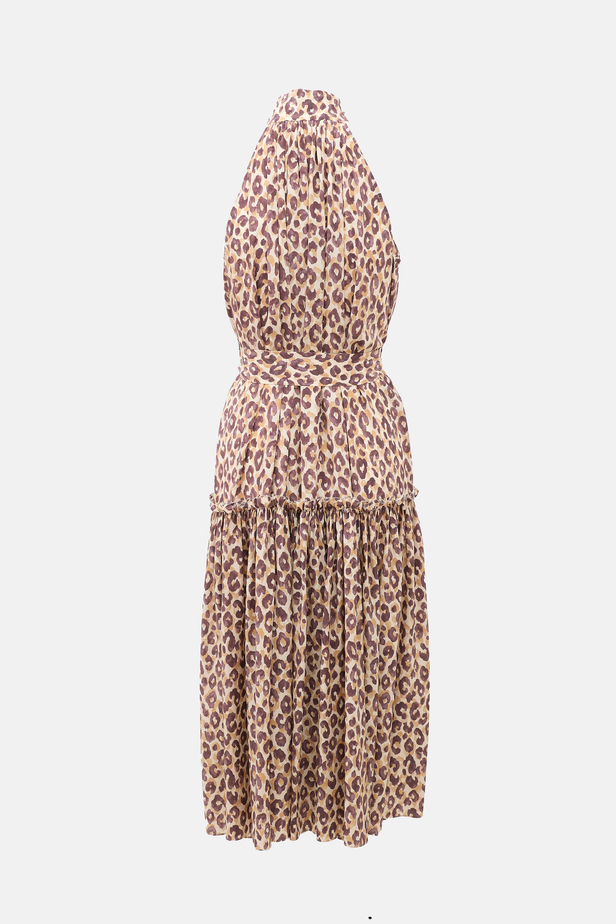 Pre-owned Zimmermann brown leopard printed silk Super Eight dress featuring a mock neck, button front, self-tie belt at waist, and tiered skirt.