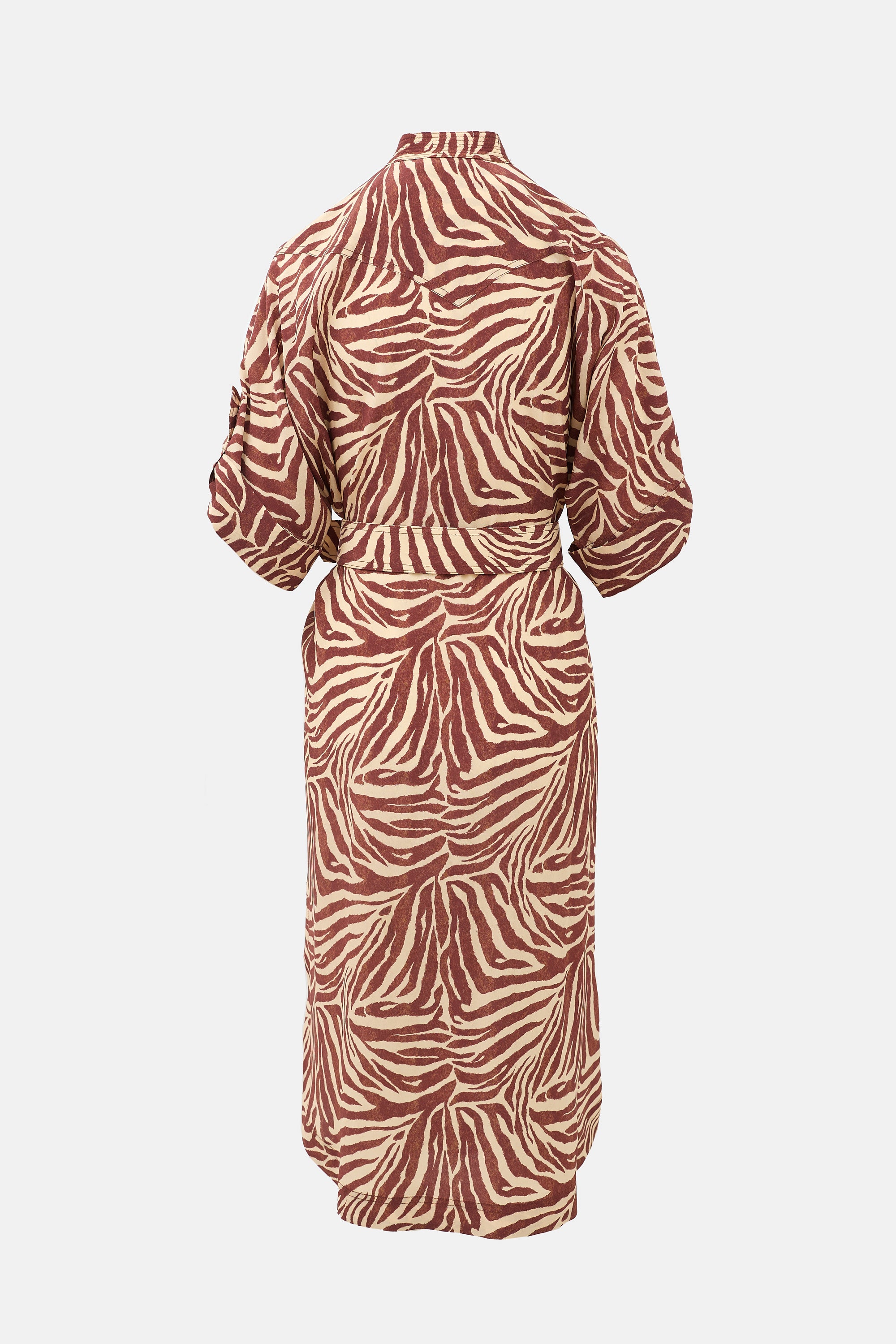Pre-owned Zimmermann cream and brown silk zebra printed dress featuring a stand collar, button front, two buttoned flap pockets at chest, button front, pin buckle belt at waist, and short sleeves with buttoned cuffs.
