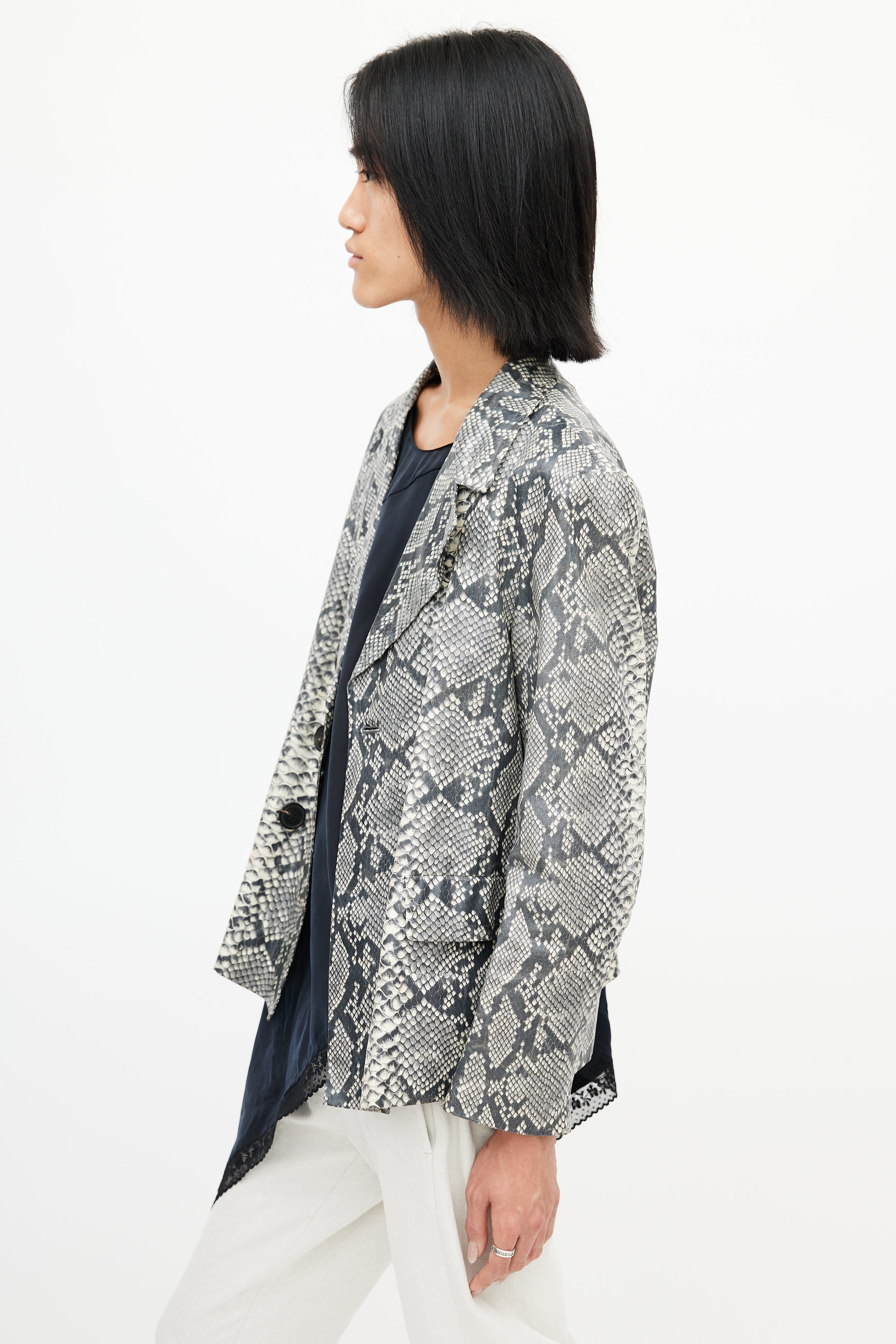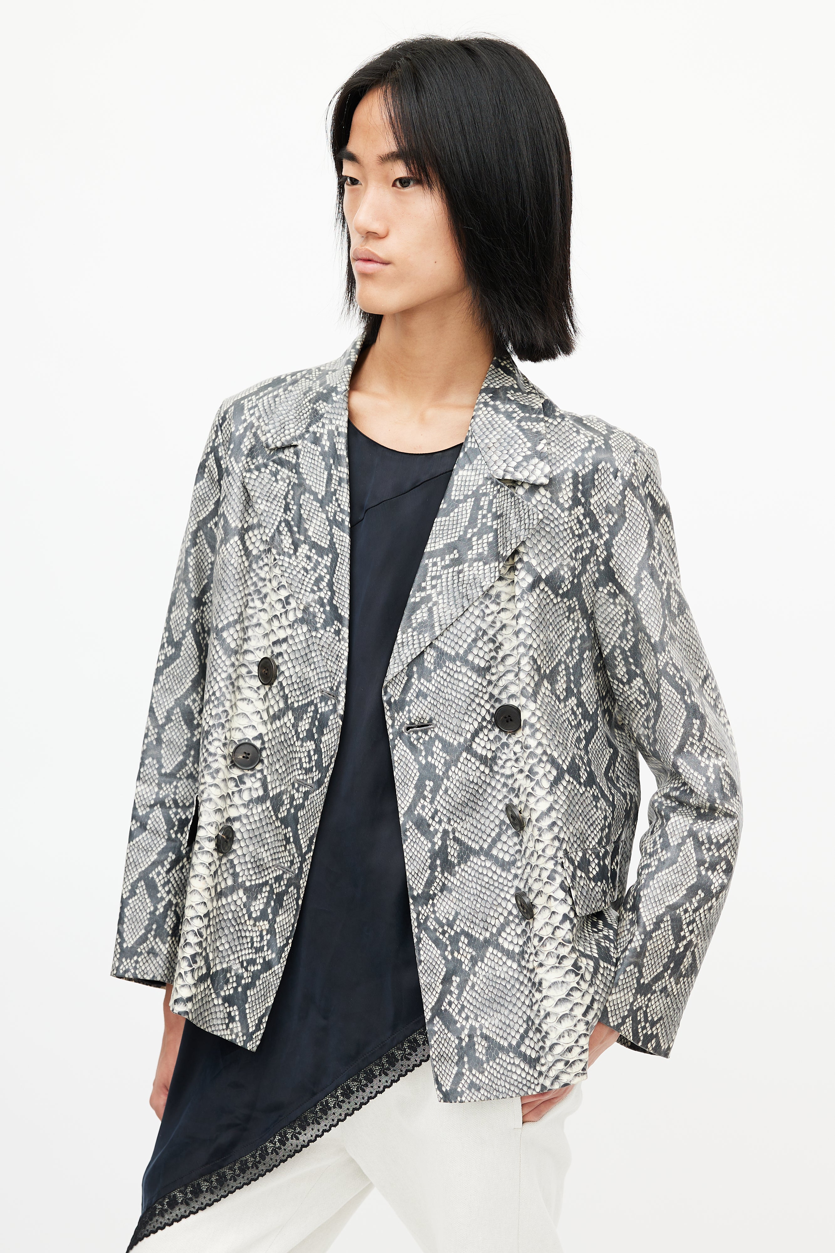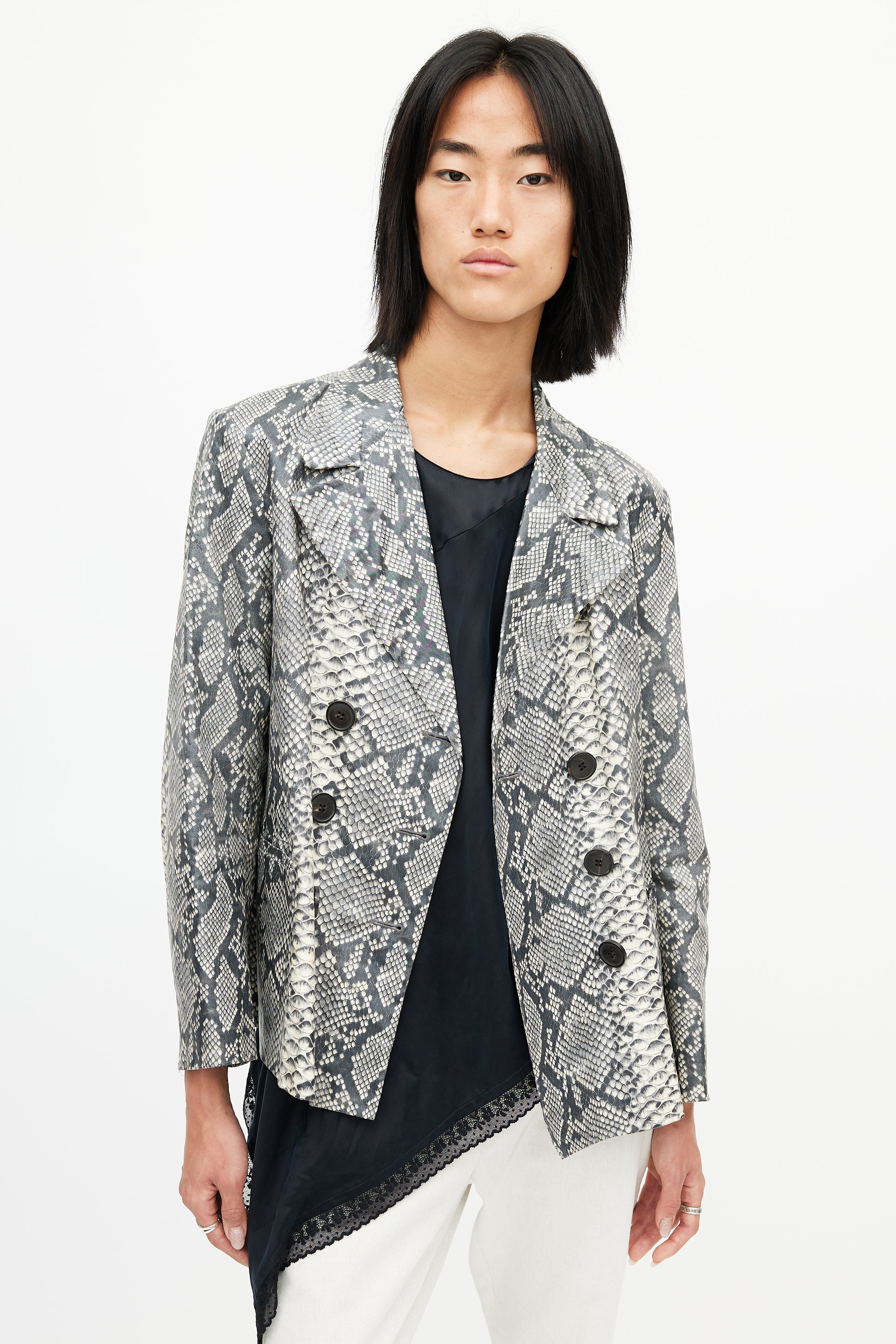 Pre-owned Dries Van Noten beige blazer featuring a multicolour snakeskin print throughout, peak lapel, two flap pockets at hip, and double breasted button up front. Lined.