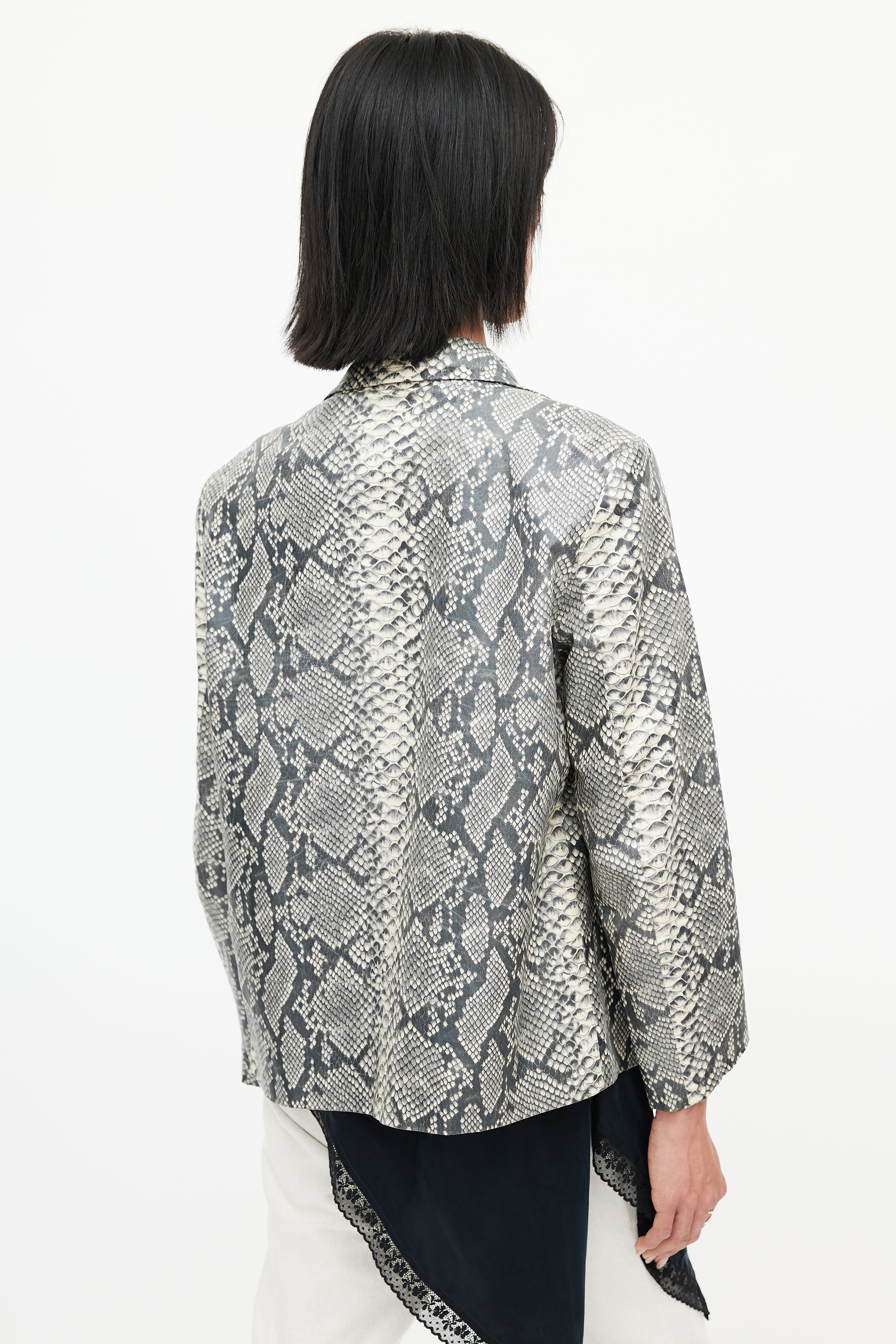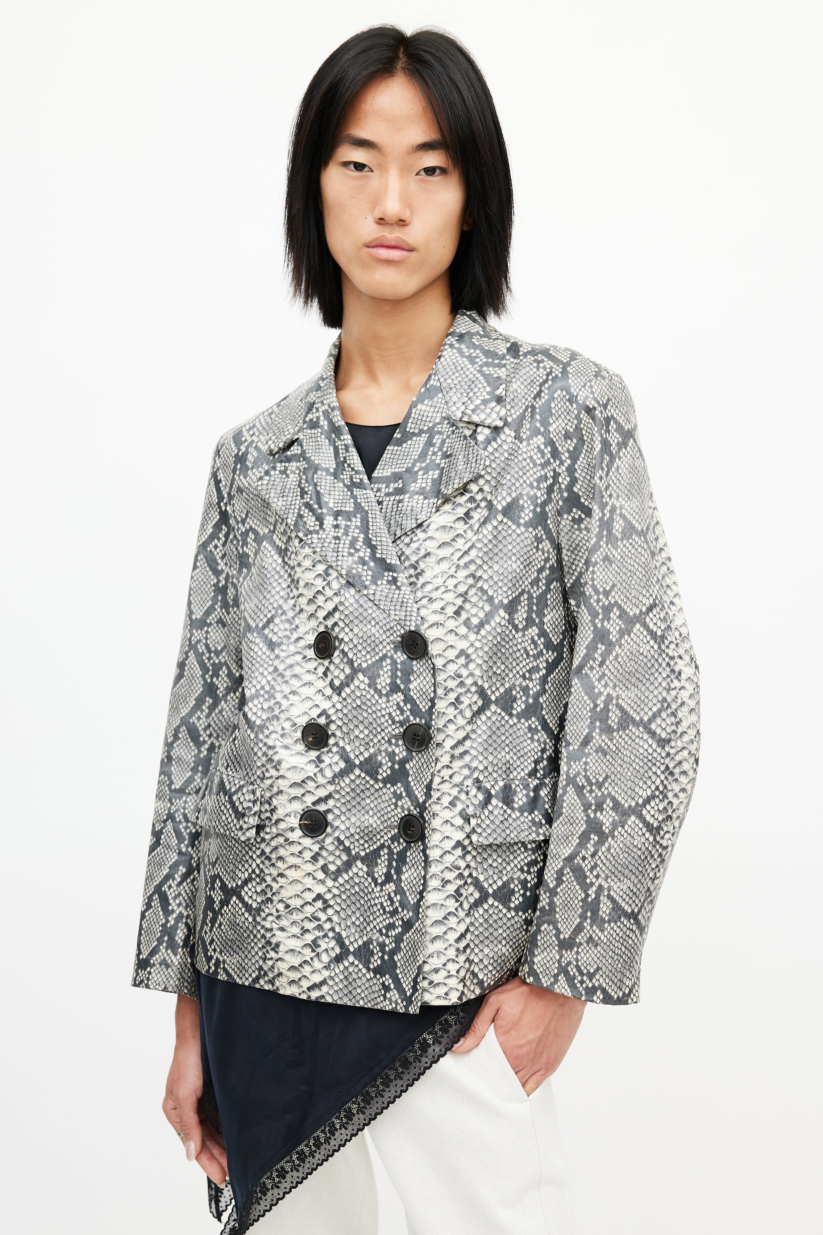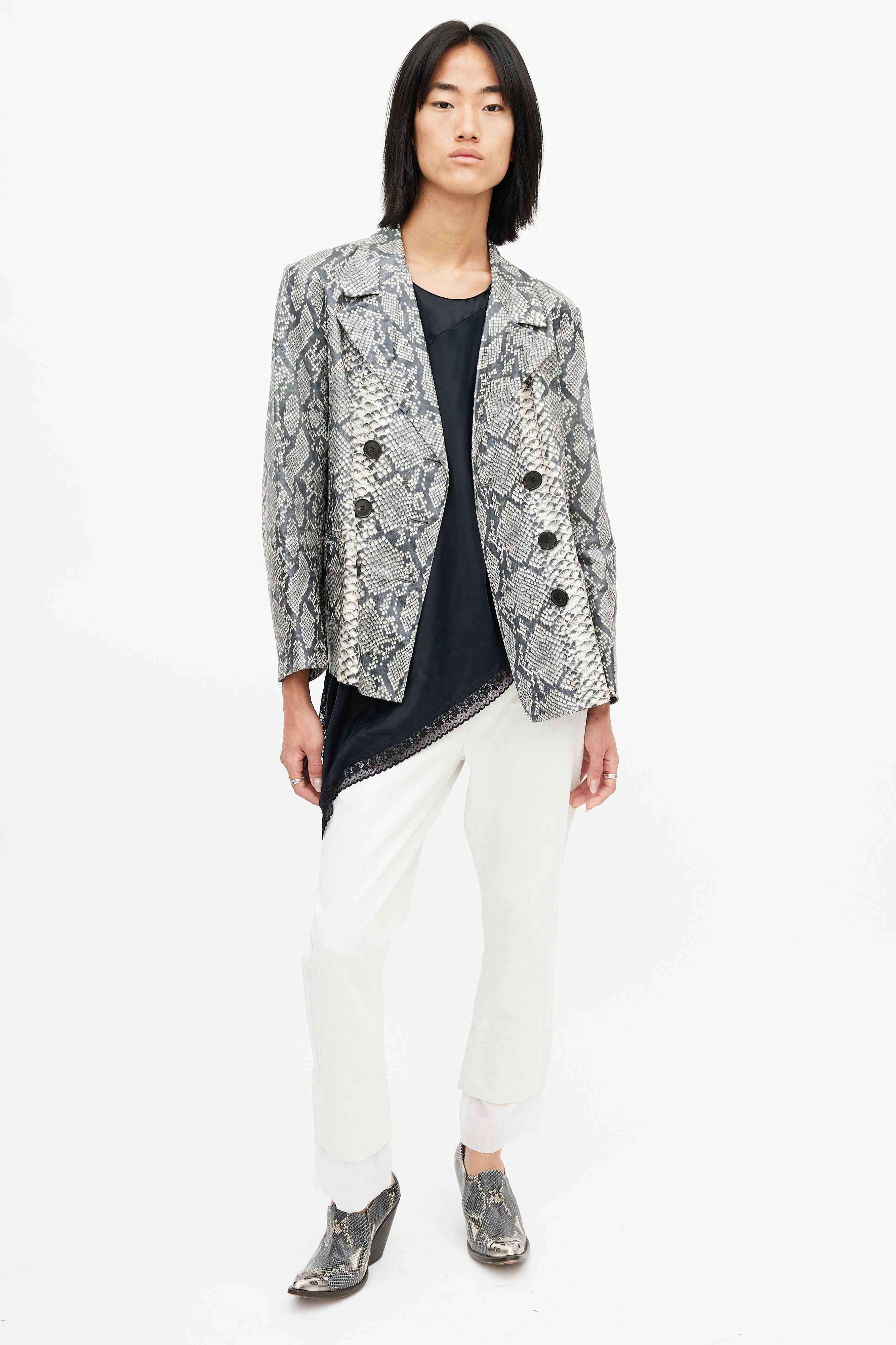 Pre-owned Dries Van Noten beige blazer featuring a multicolour snakeskin print throughout, peak lapel, two flap pockets at hip, and double breasted button up front. Lined.
