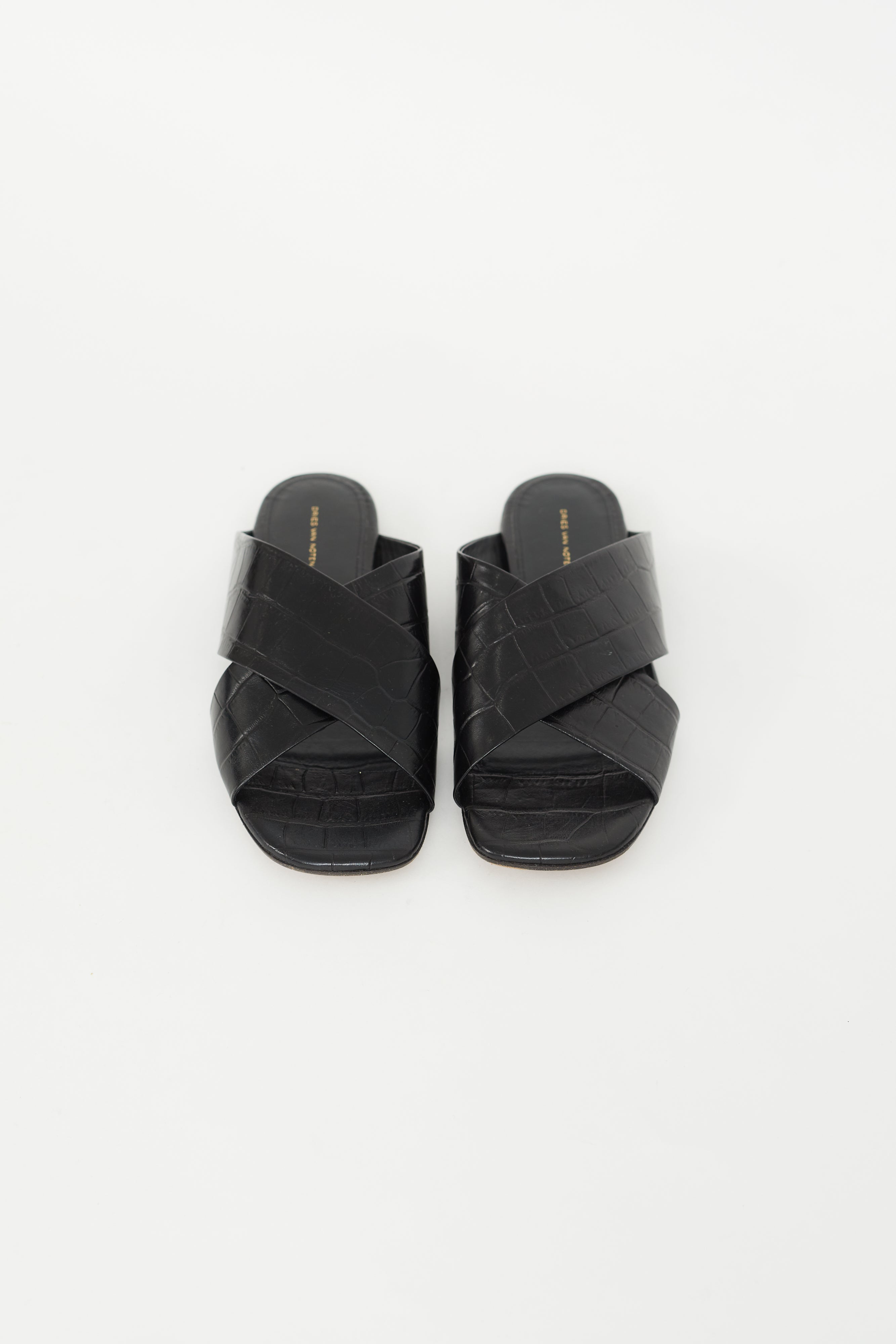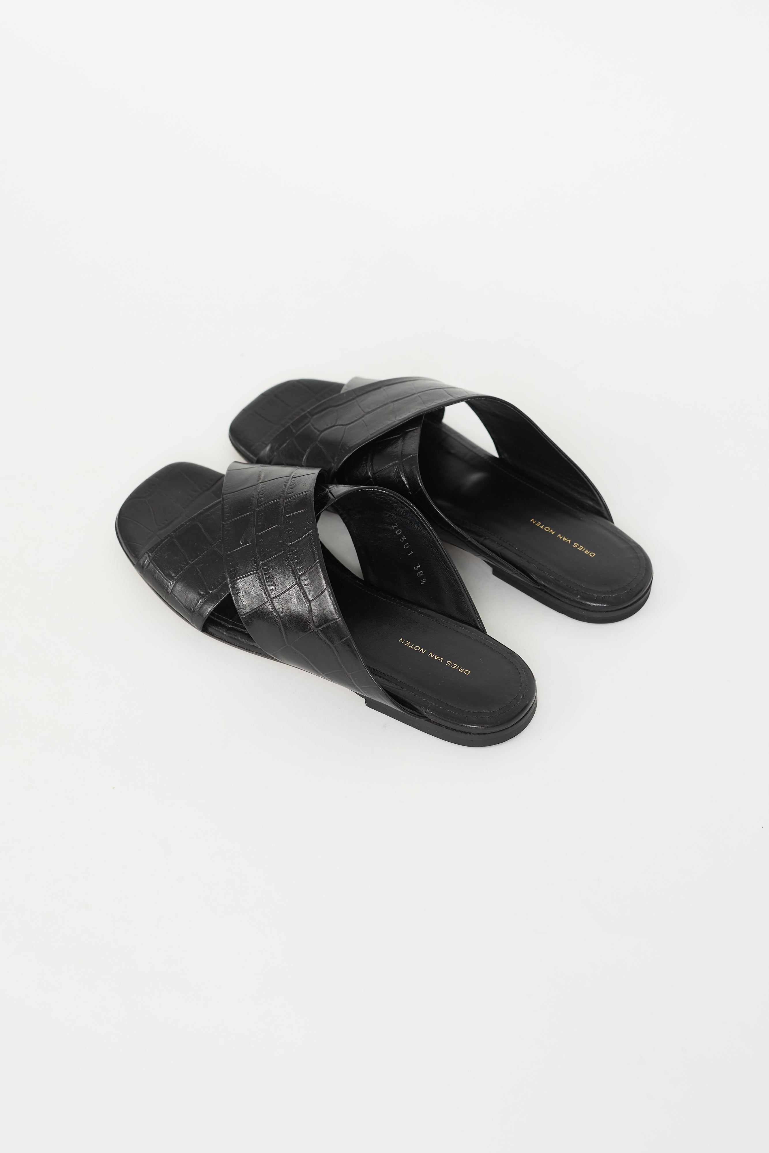 Pre-owned Dries Van Noten black croc leather sandals featuring open square toe, criss cross strap at vamp, and leather insole. Comes with original dust bag.