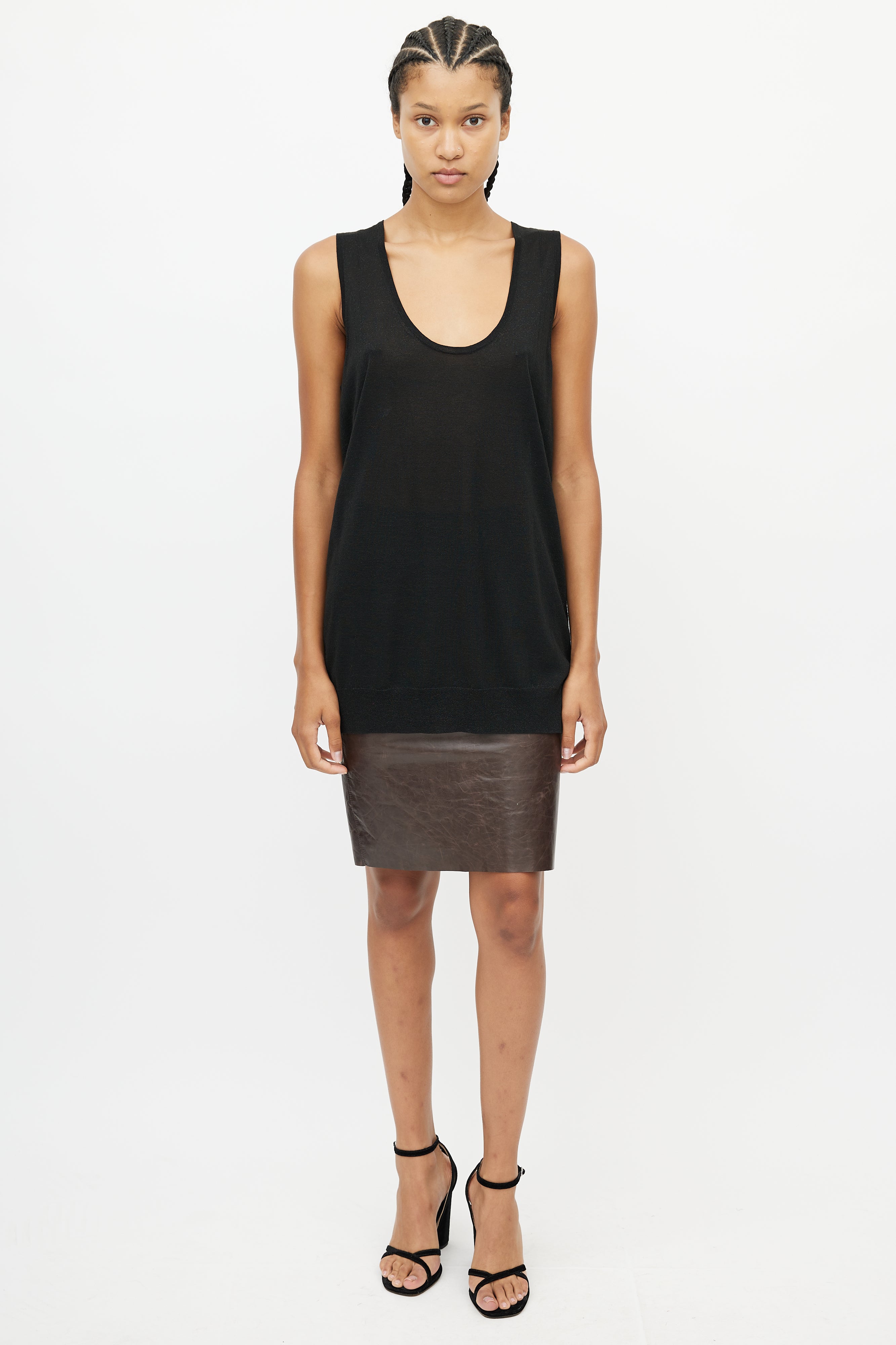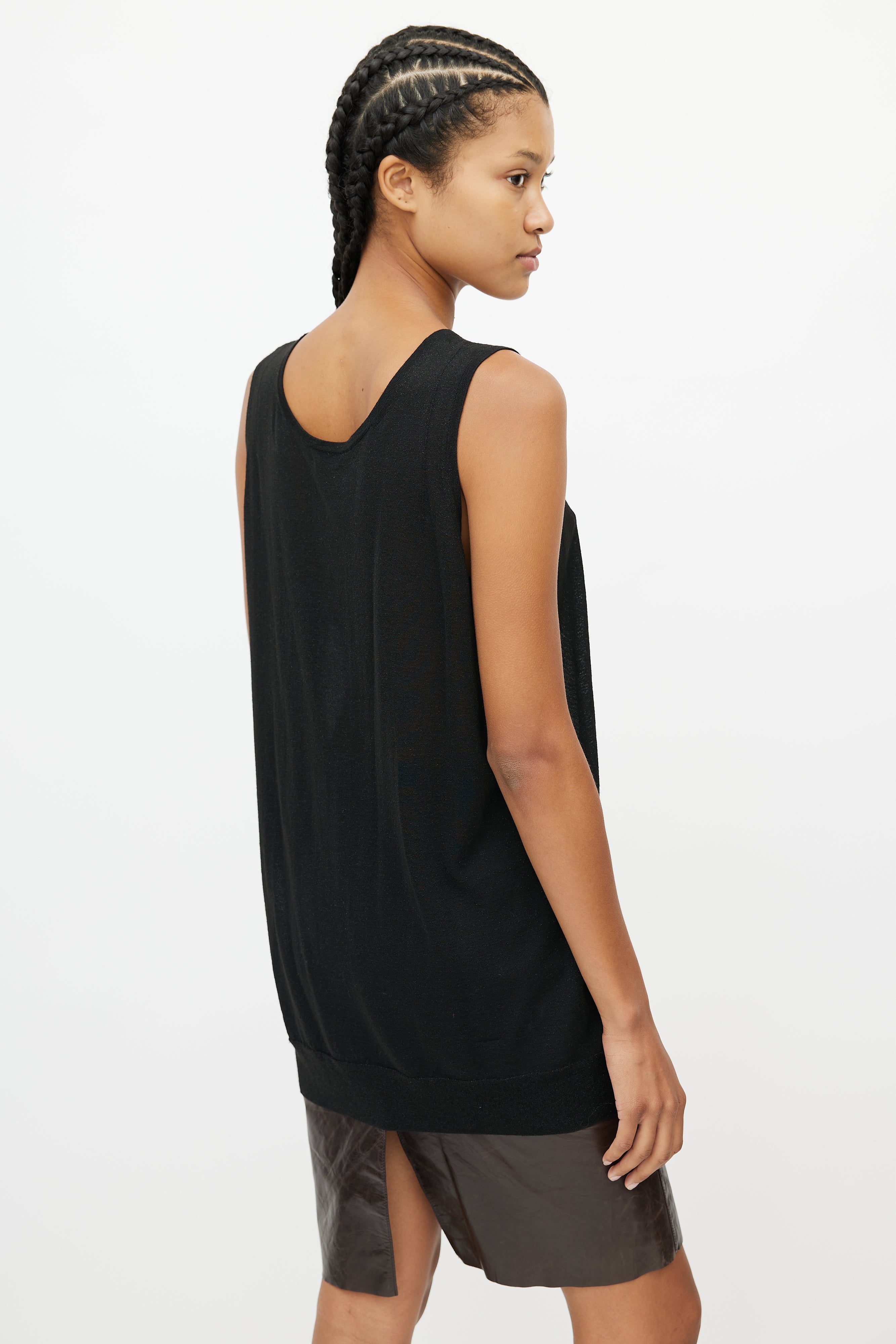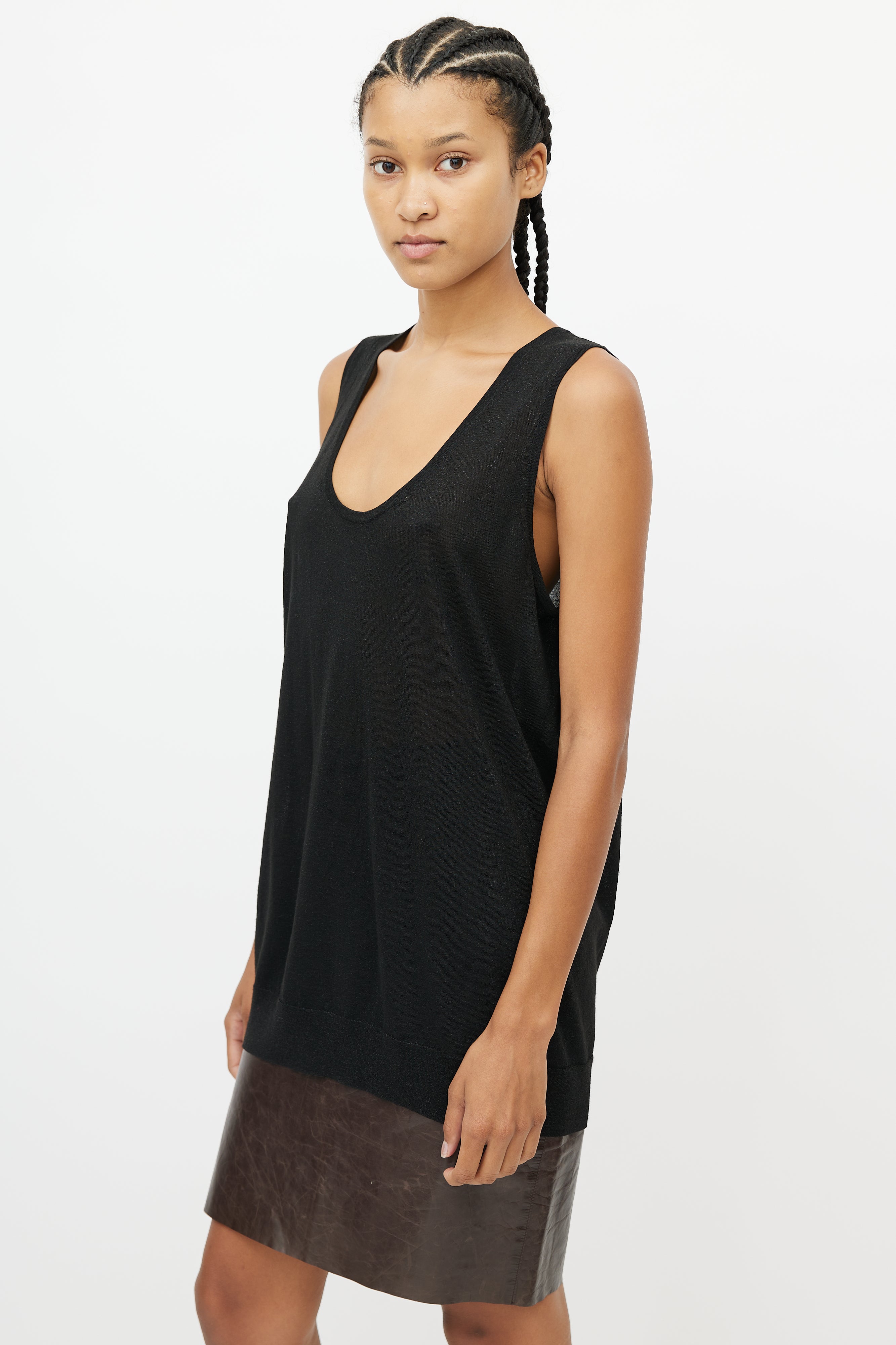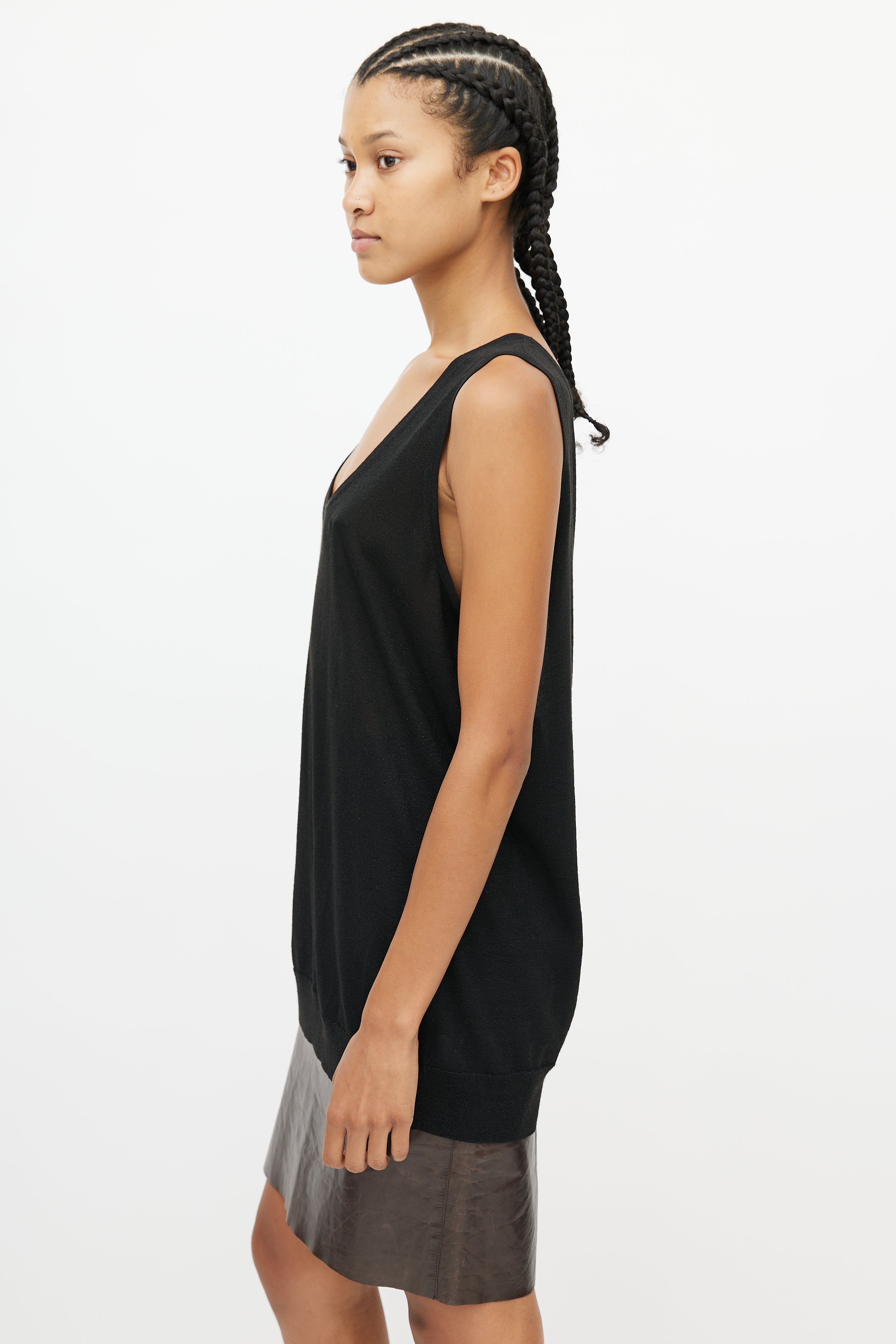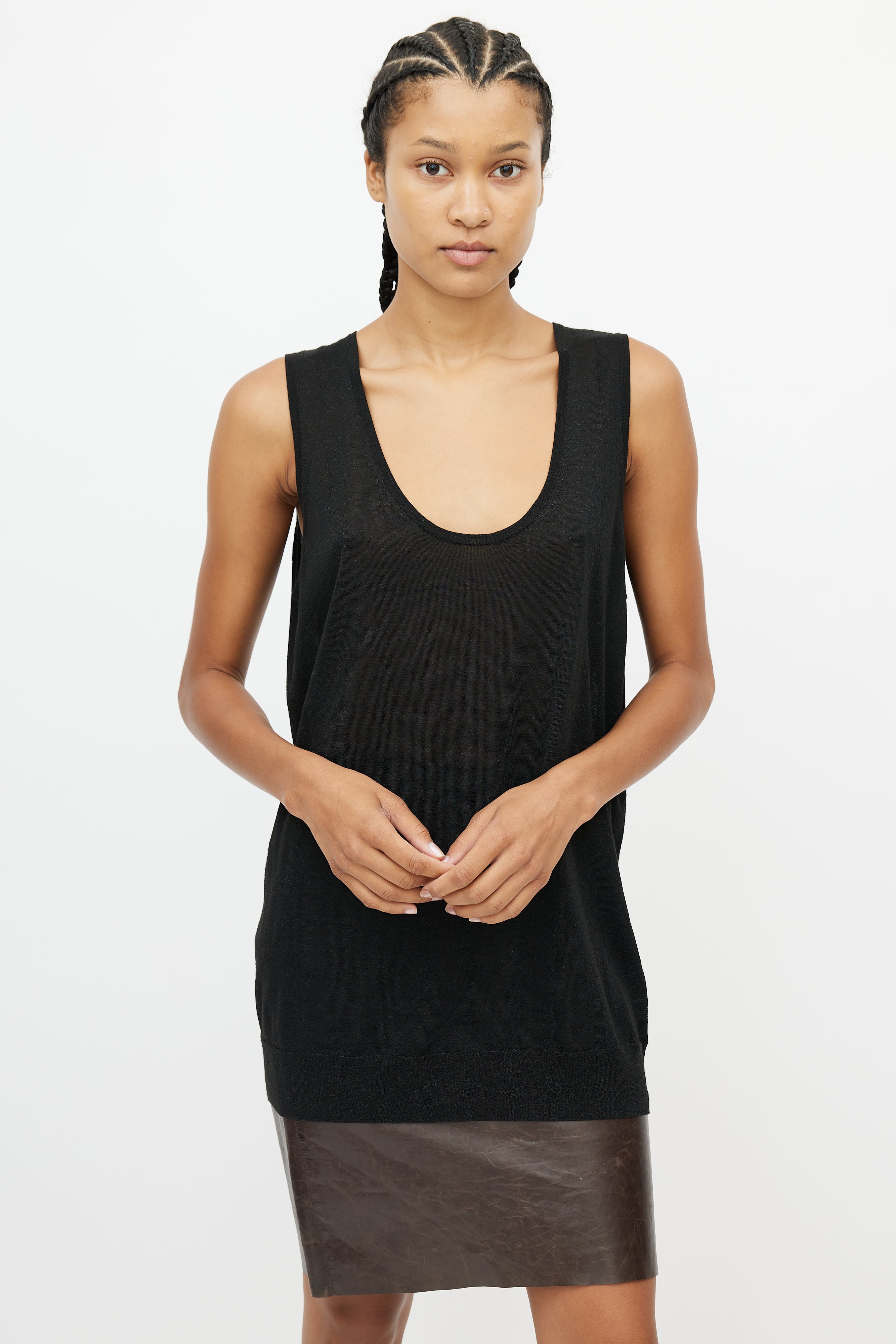 Pre-owned Dries Van Noten black metallic knit tank featuring a scoop neckline, and ribbed hem.