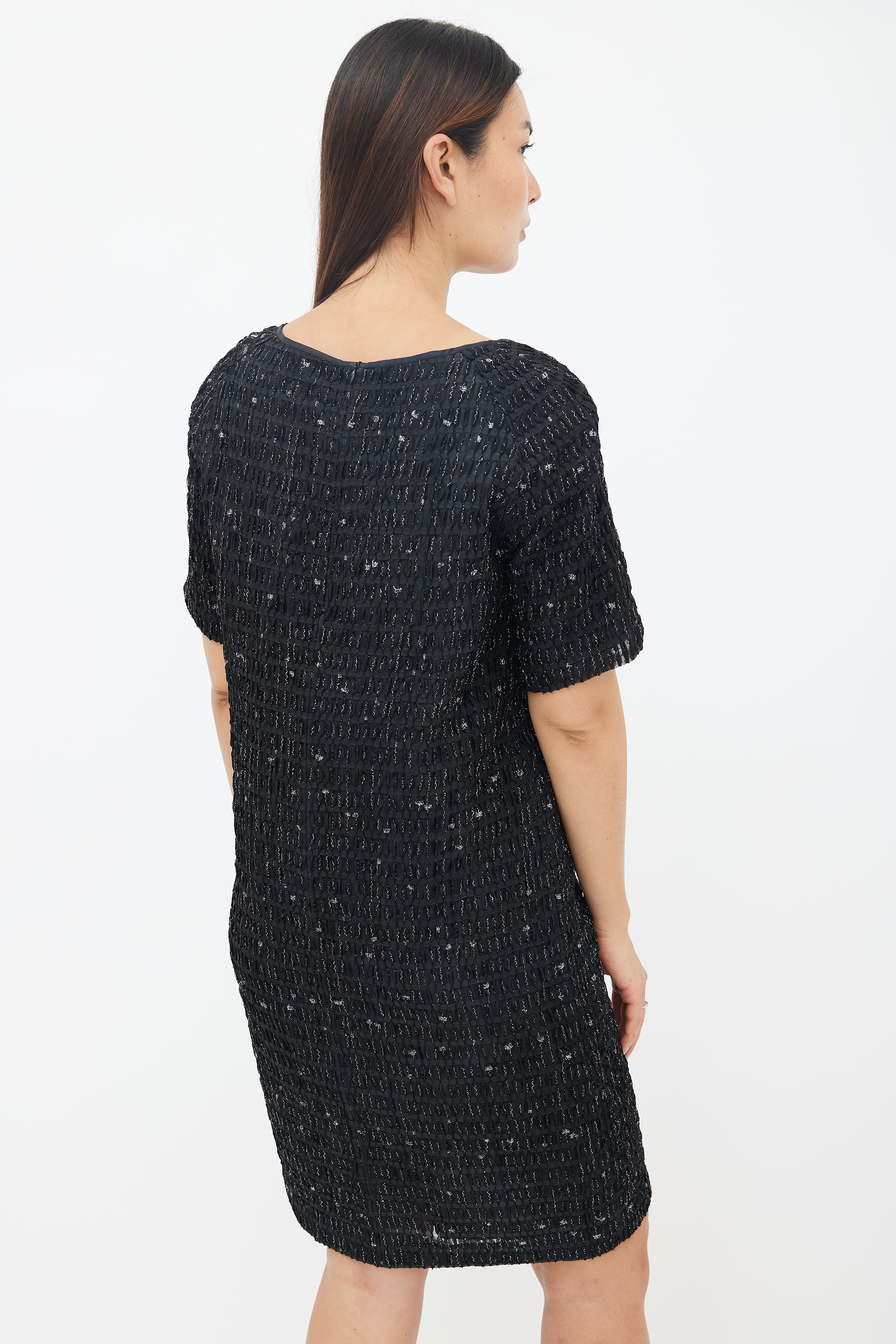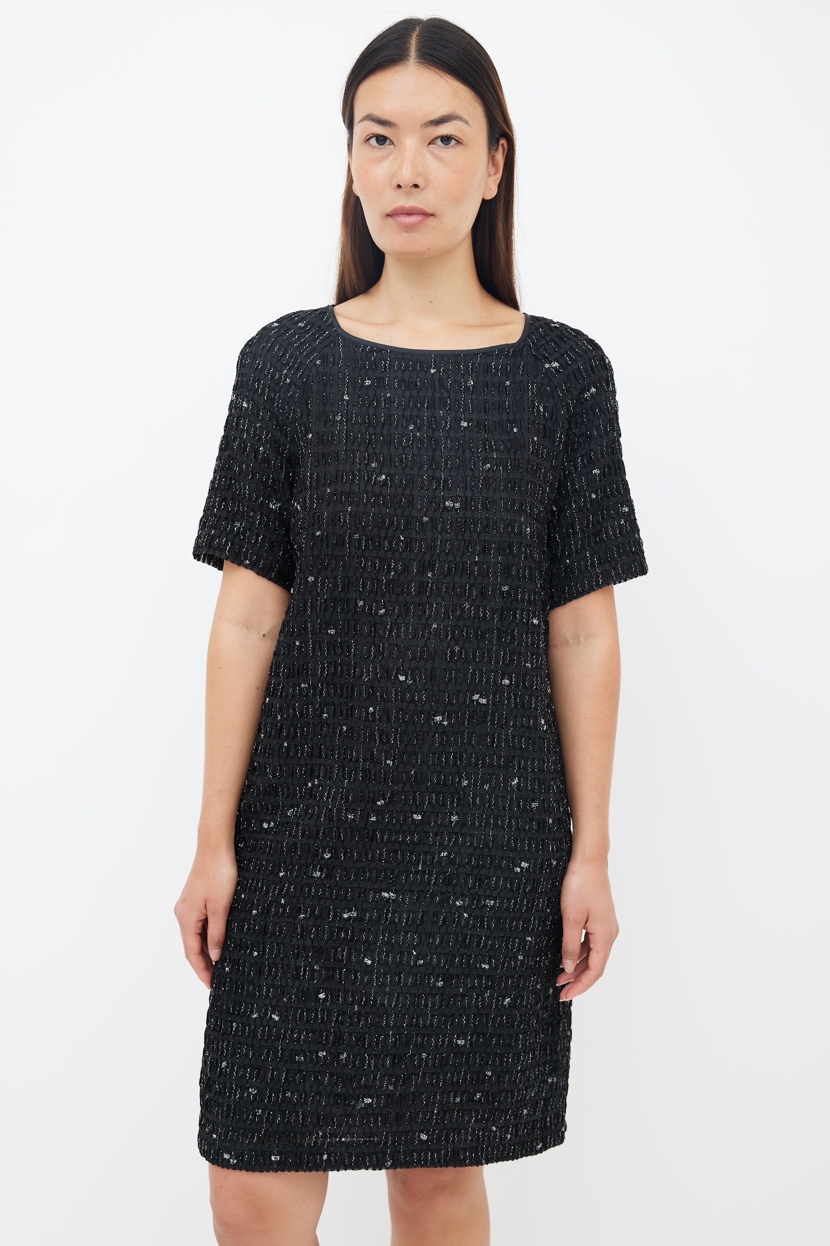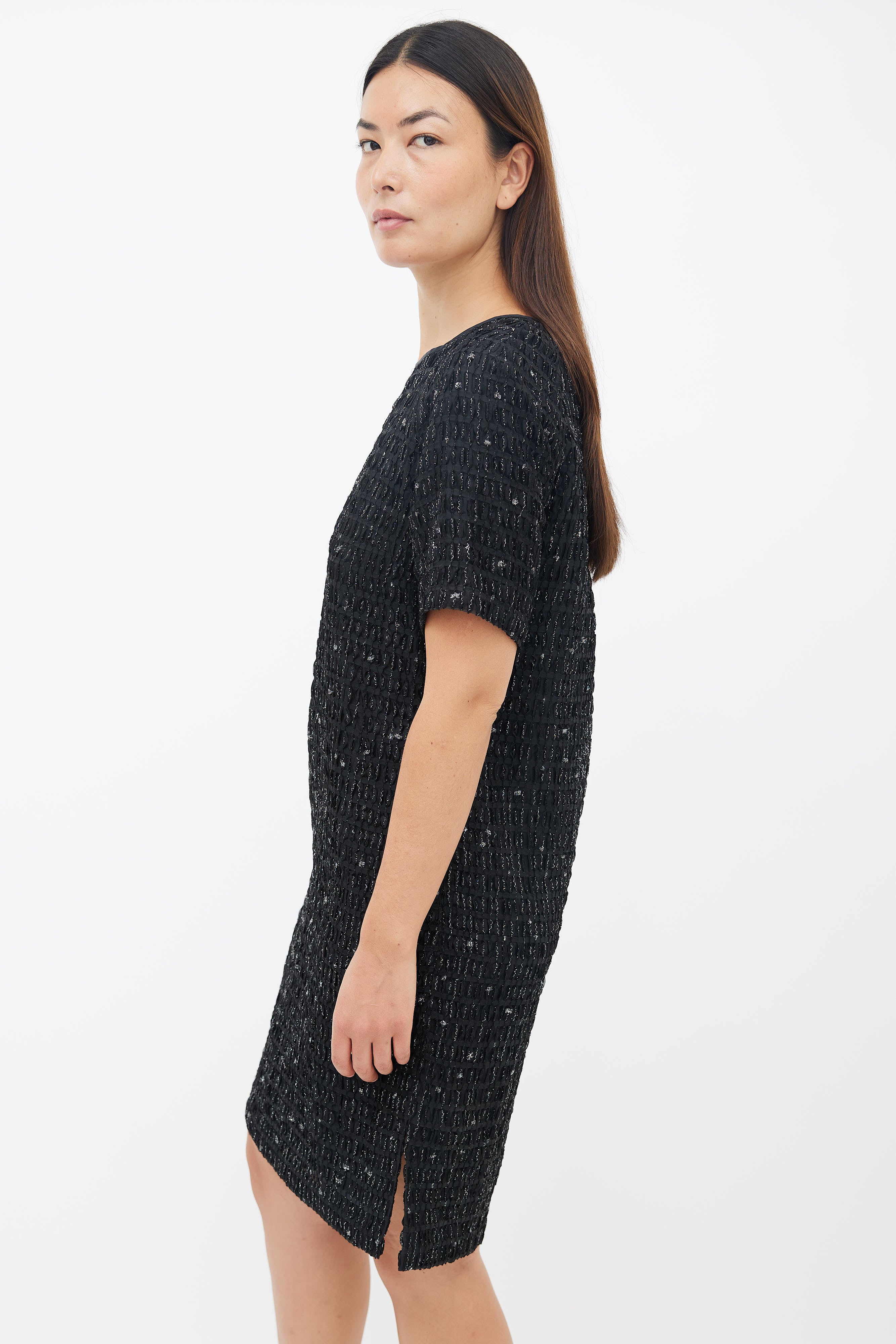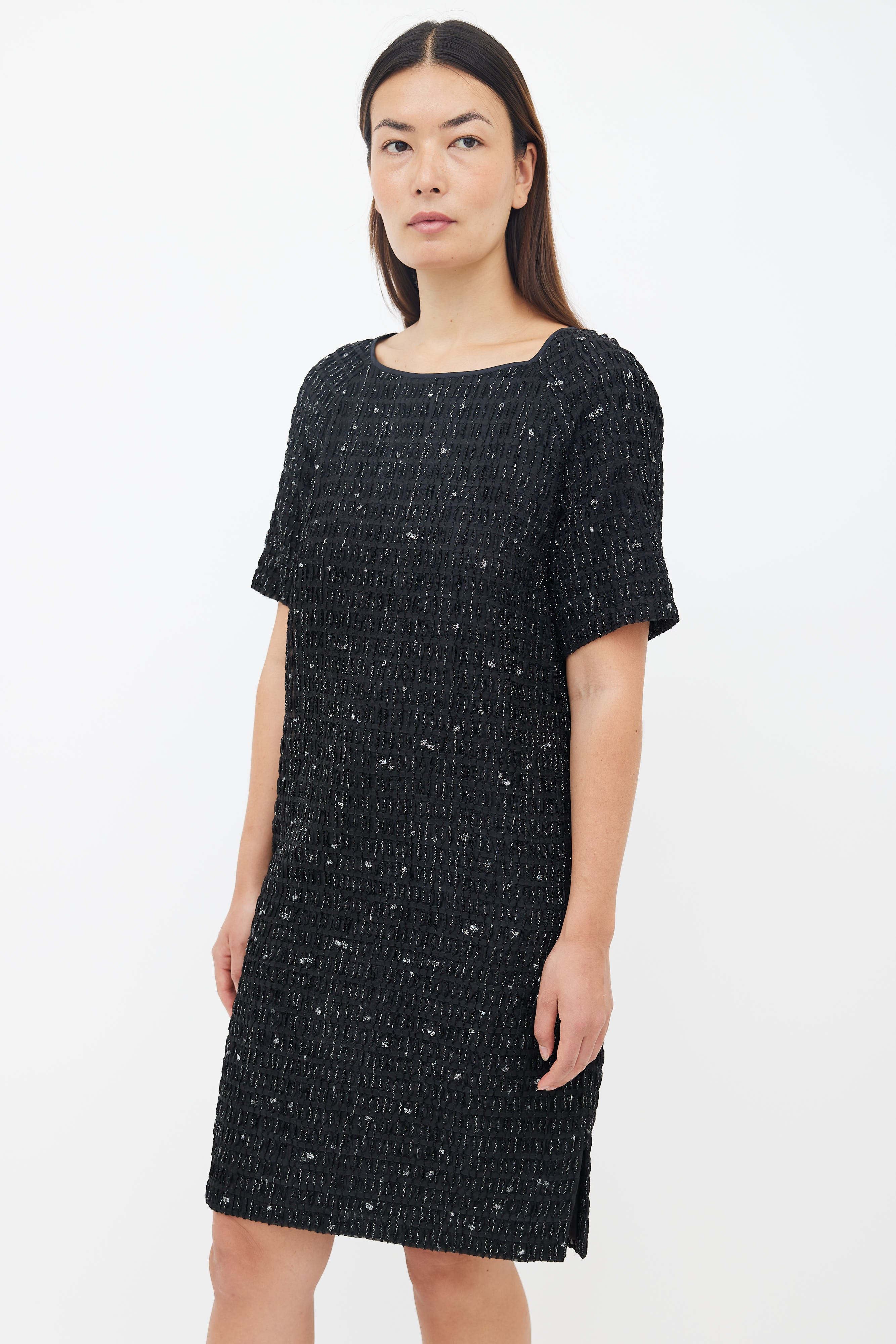 Pre-owned Dries Van Noten black metallic textured shift dress featuring a wide neckline, short sleeves, slit at left hem, concealed zip at back, straight fit, textured outer layer with woven metallic threads throughout and a fully lined interior.