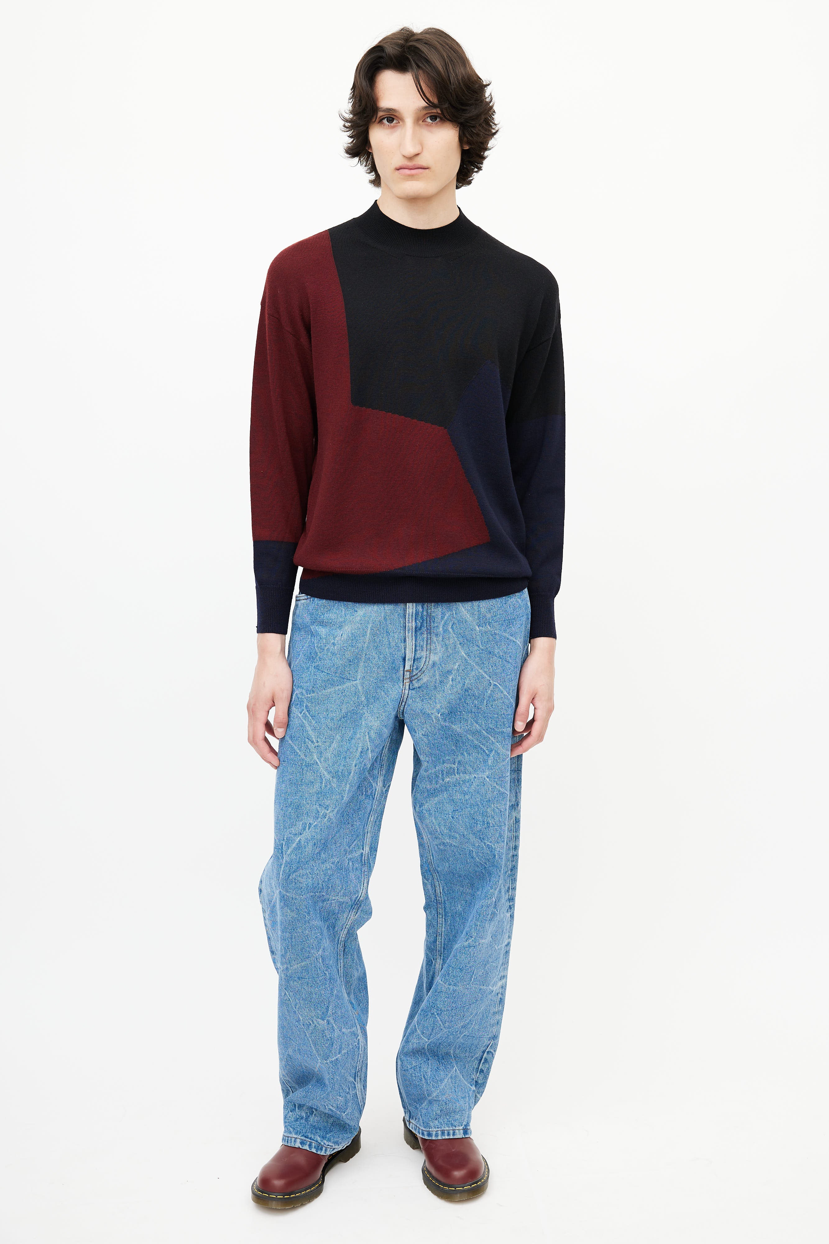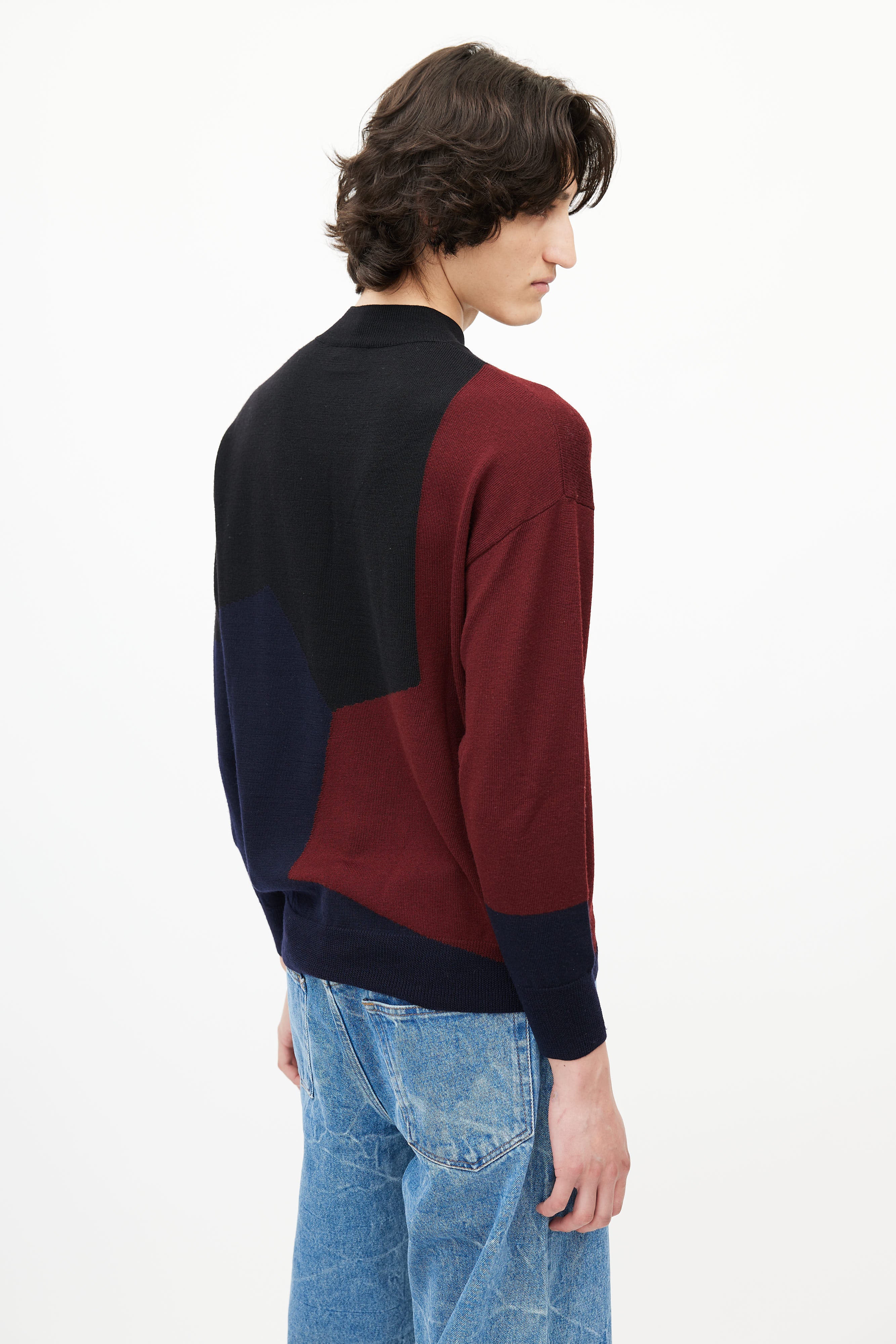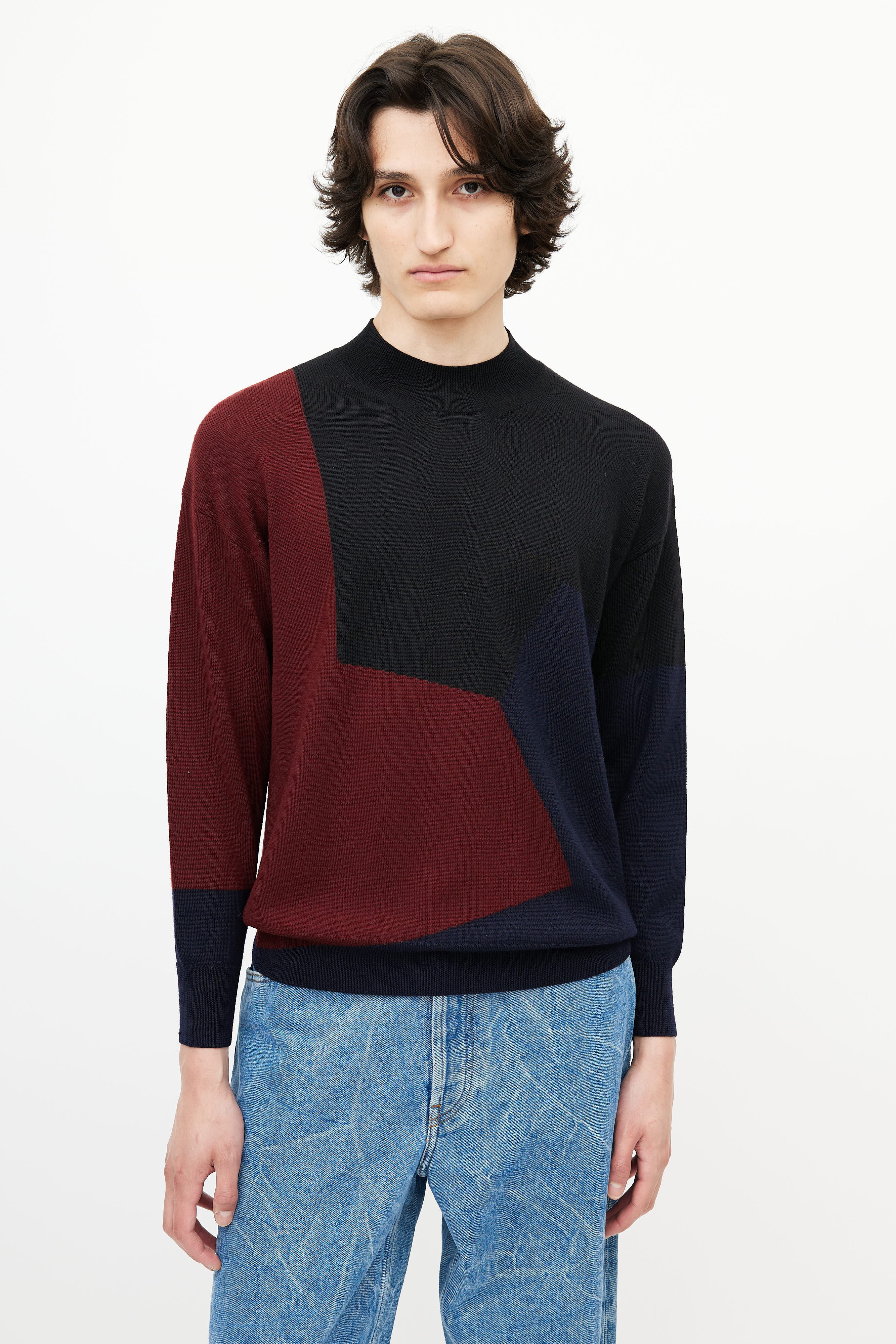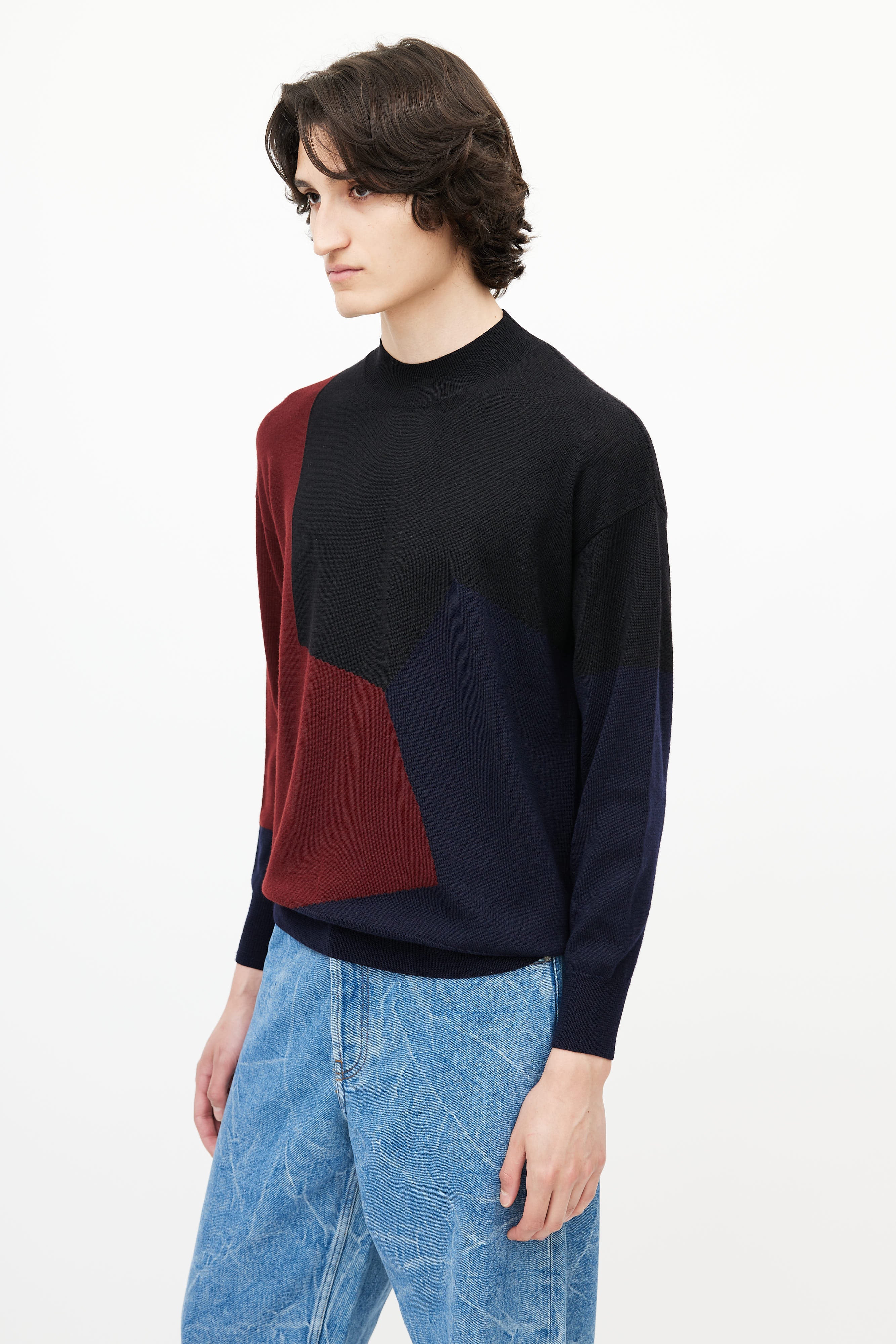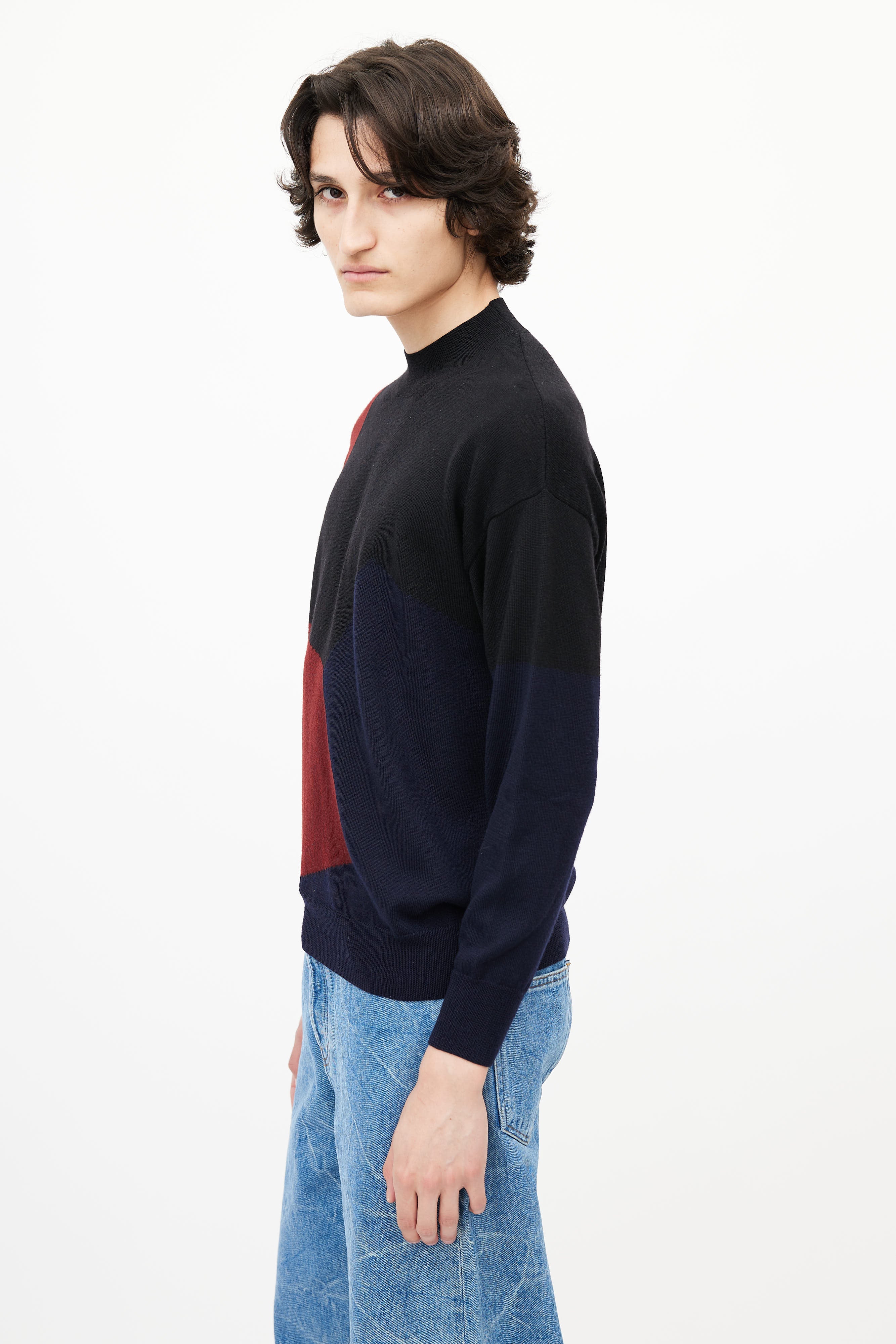 Pre-owned Dries Van Noten black knit sweater featuring multicolour knit panelling throughout, mock neck collar, and ribbed cuffs and hem.