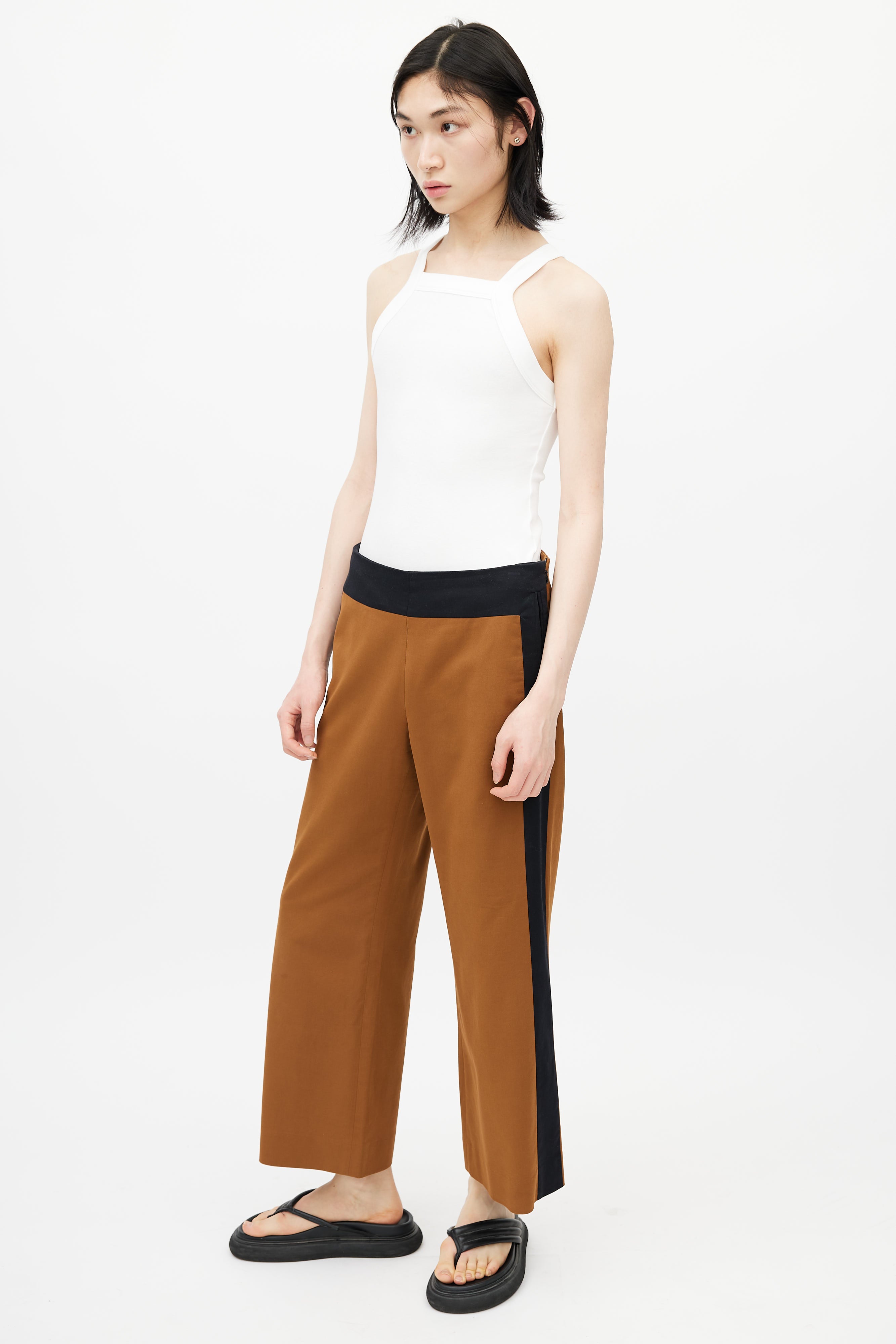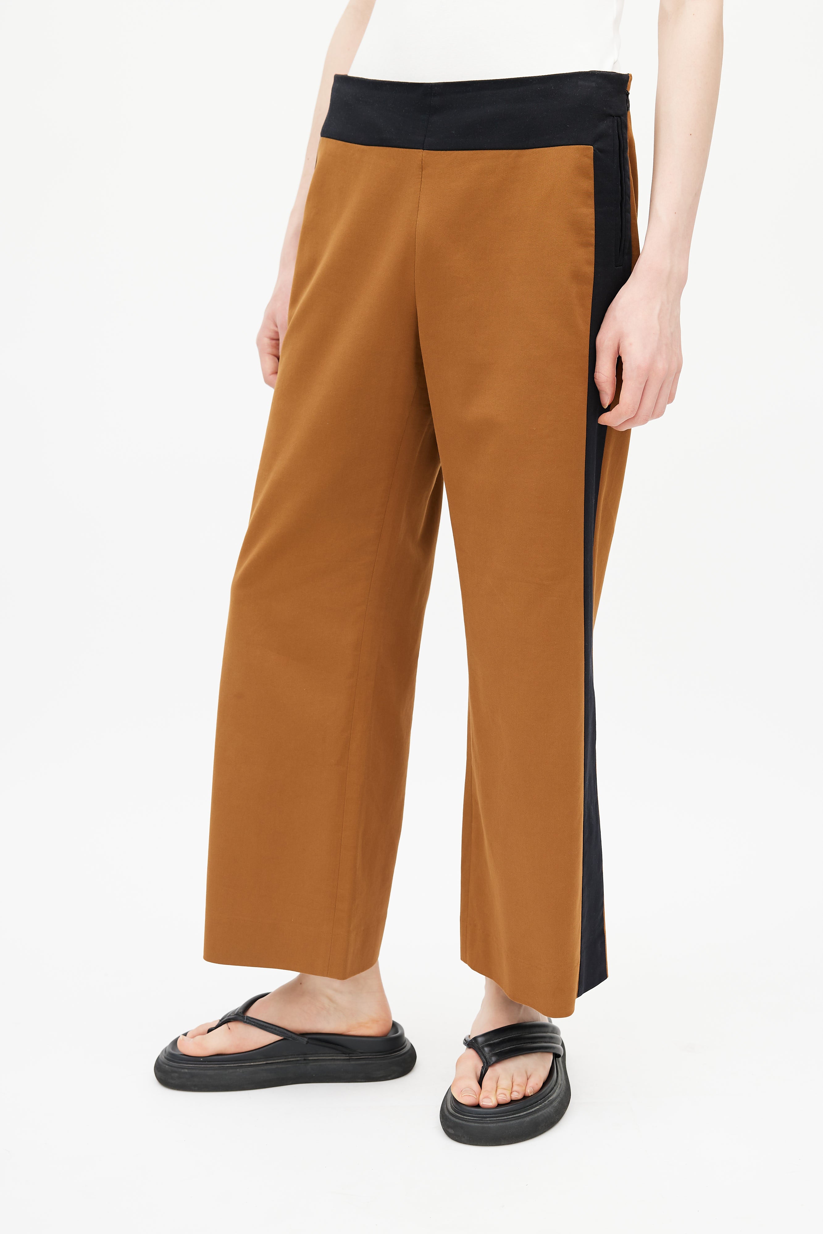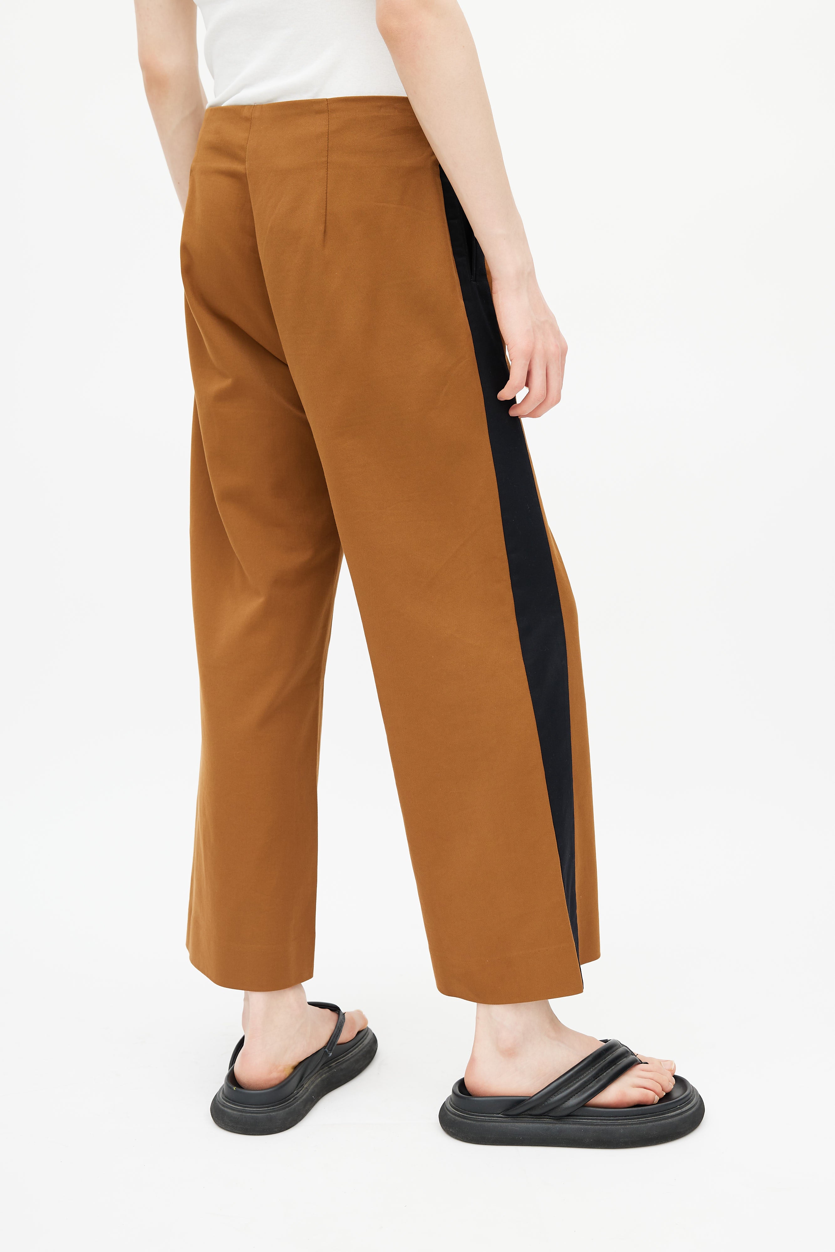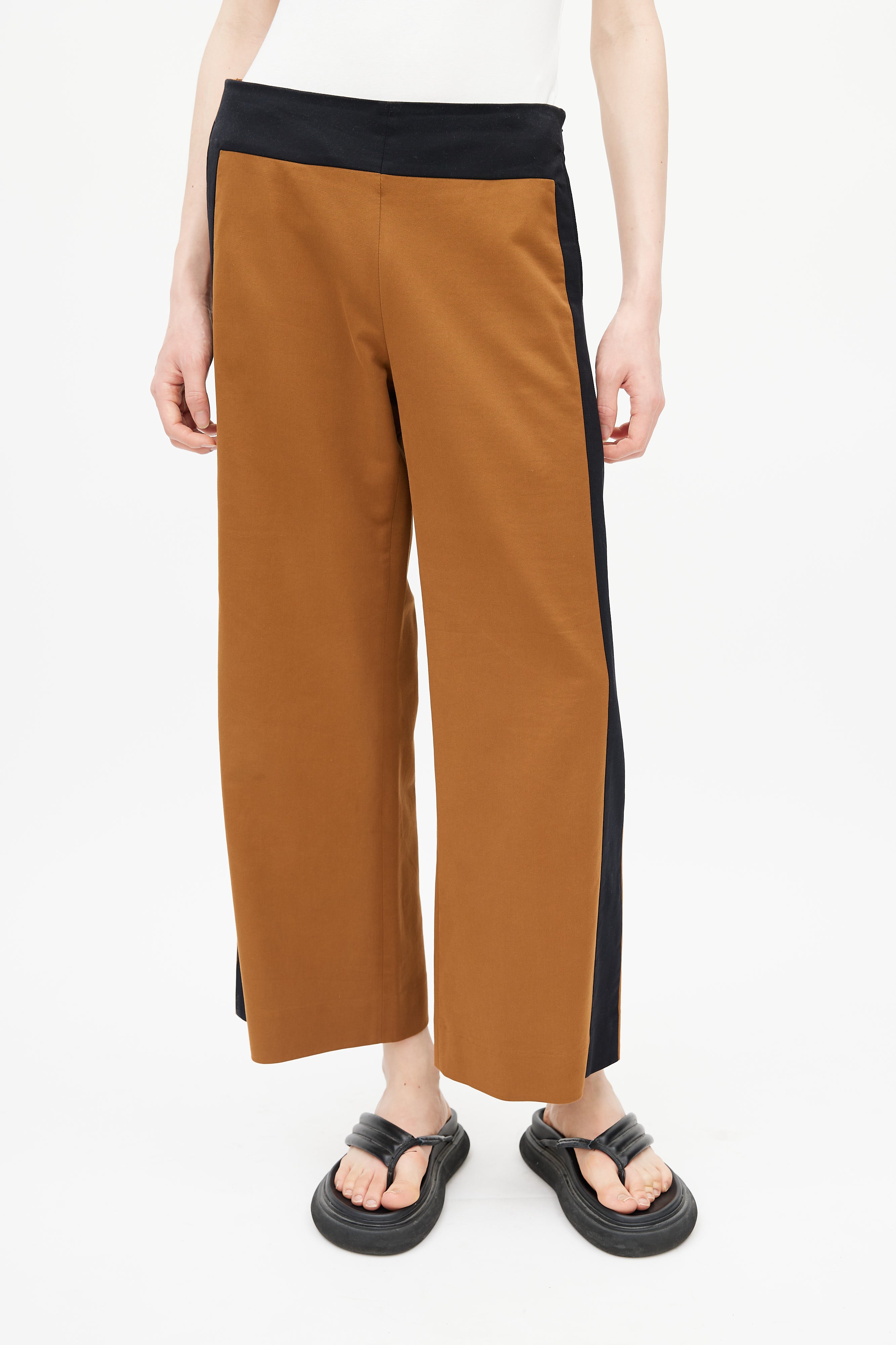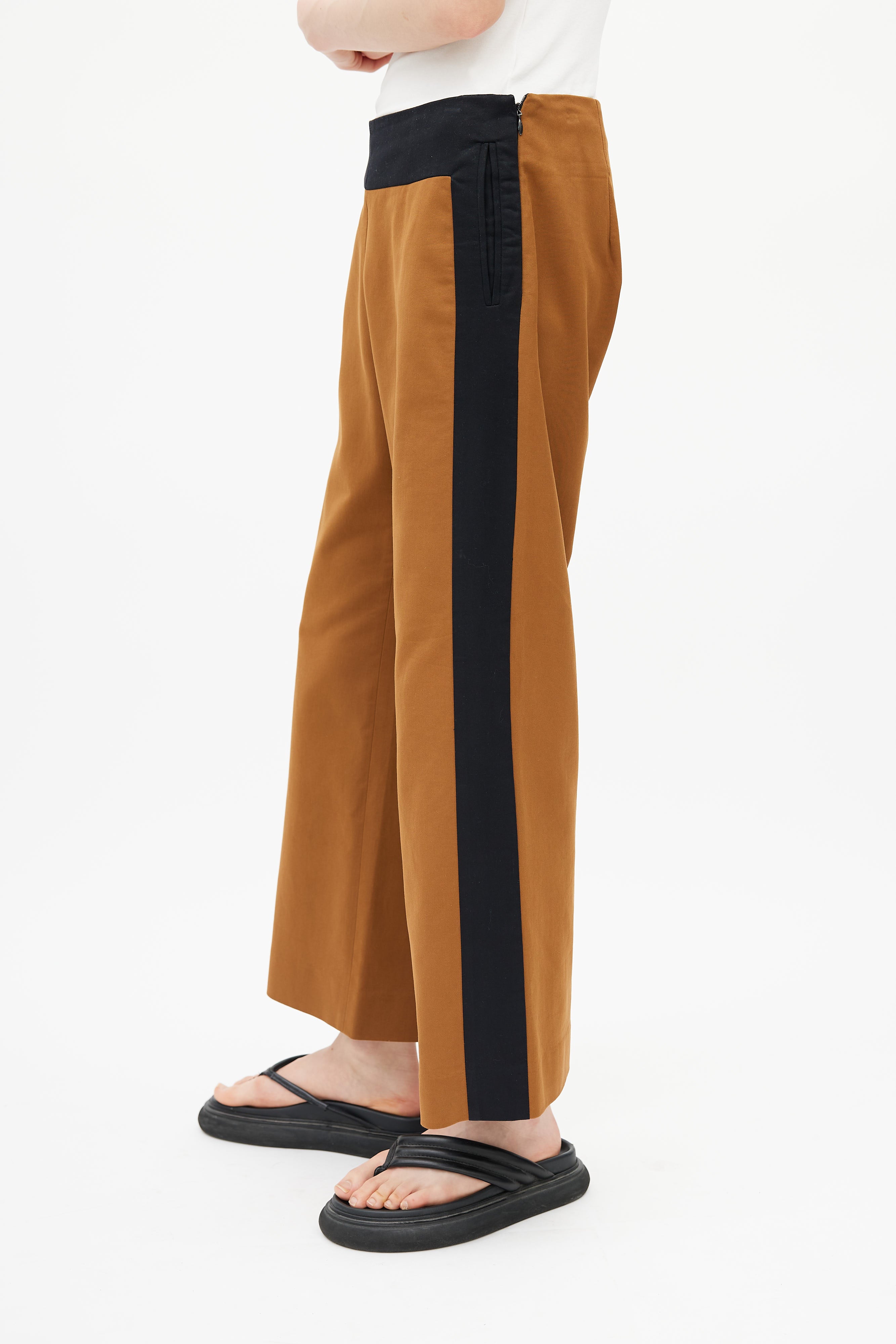 Pre-owned Dries Van Noten brown trouser featuring a black stripe at sides, two slash pockets at hip, wide leg, and zip closure at right side.