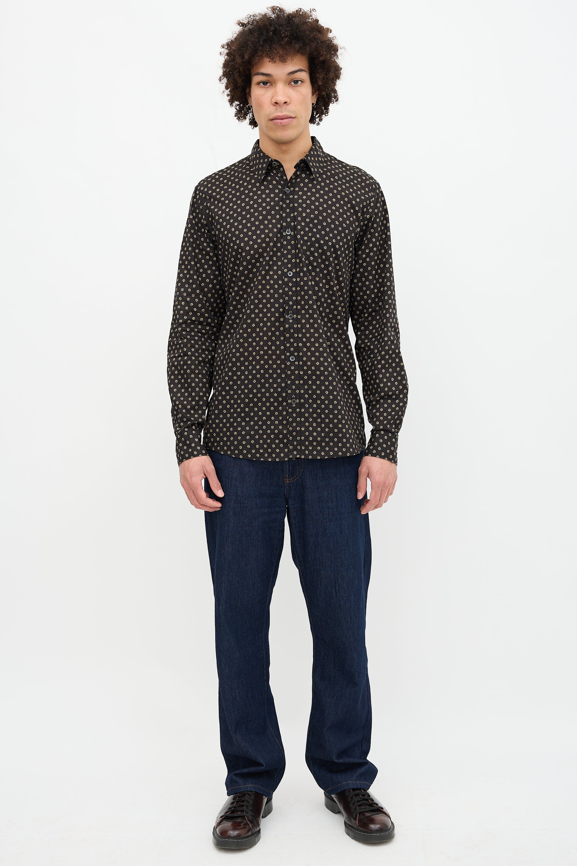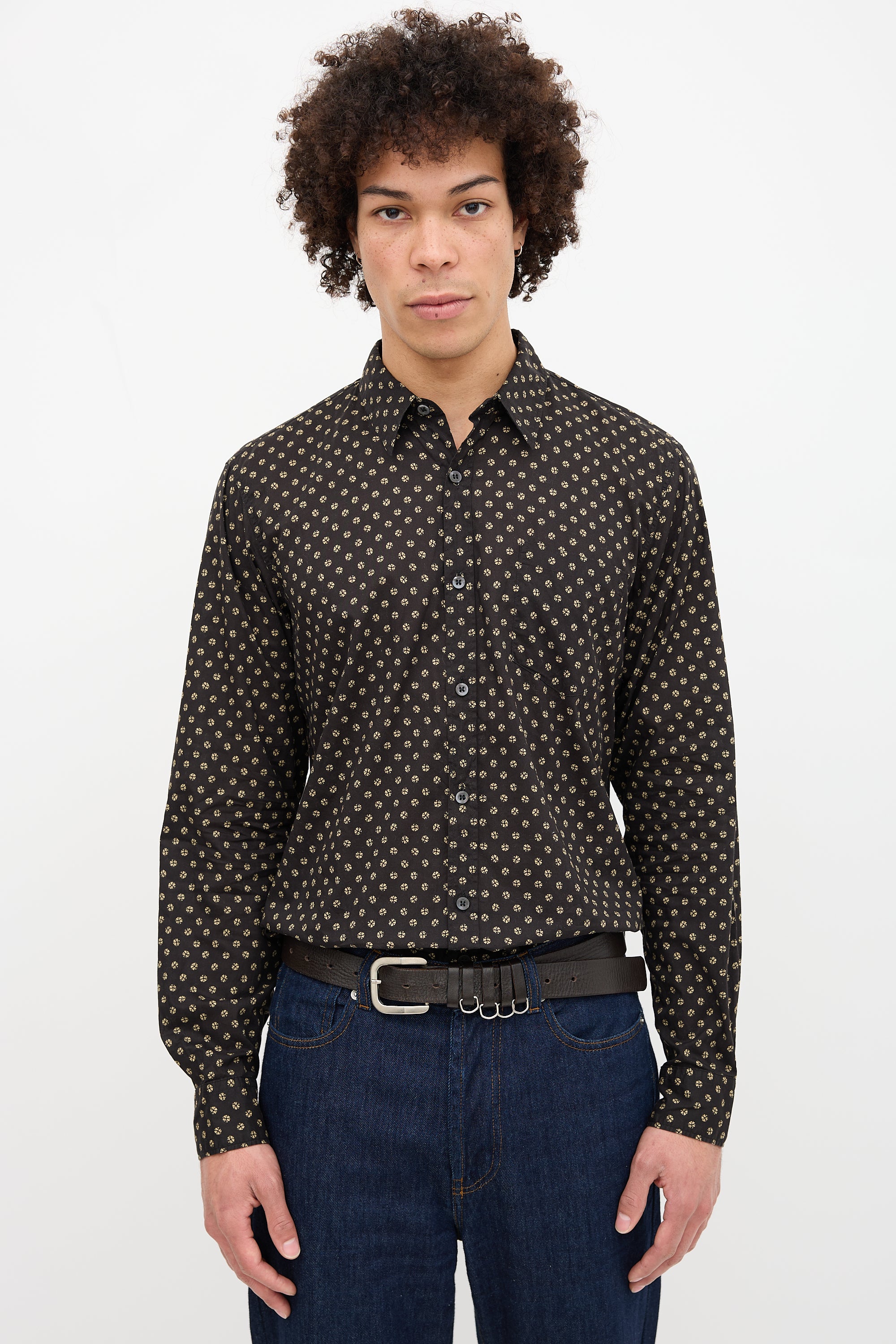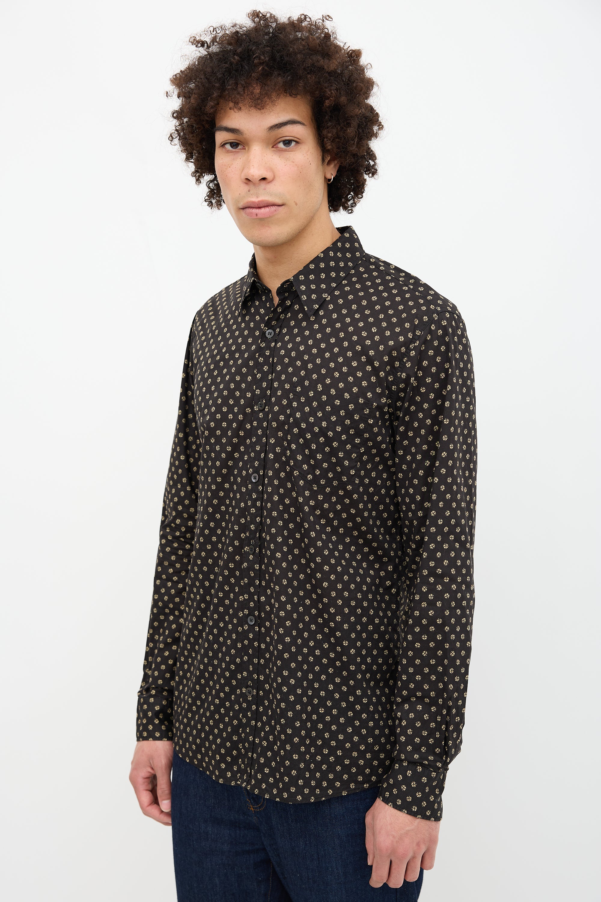 Pre-owned Dries Van Noten black Corbin shirt featuring sequin print, spread collar, button front and cuffs, and patch pocket at left chest.