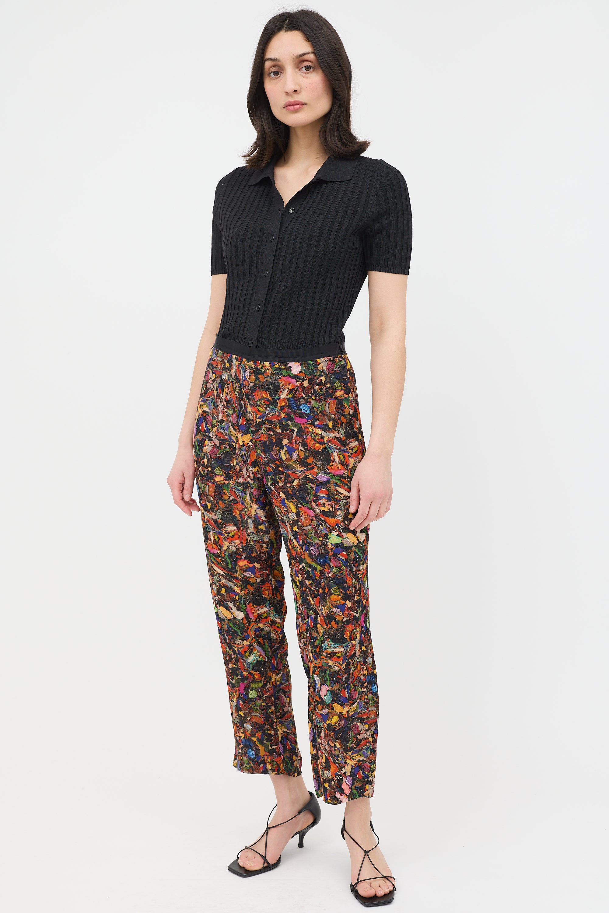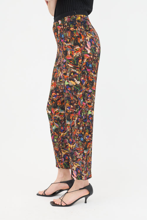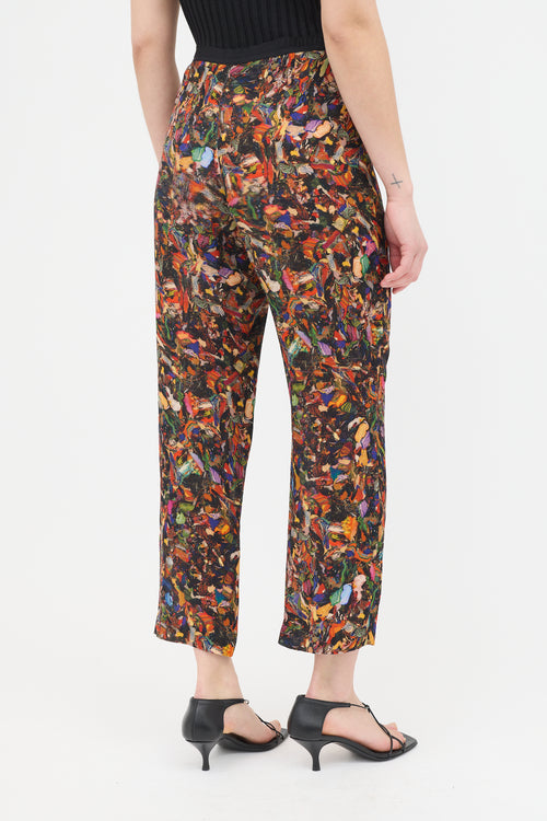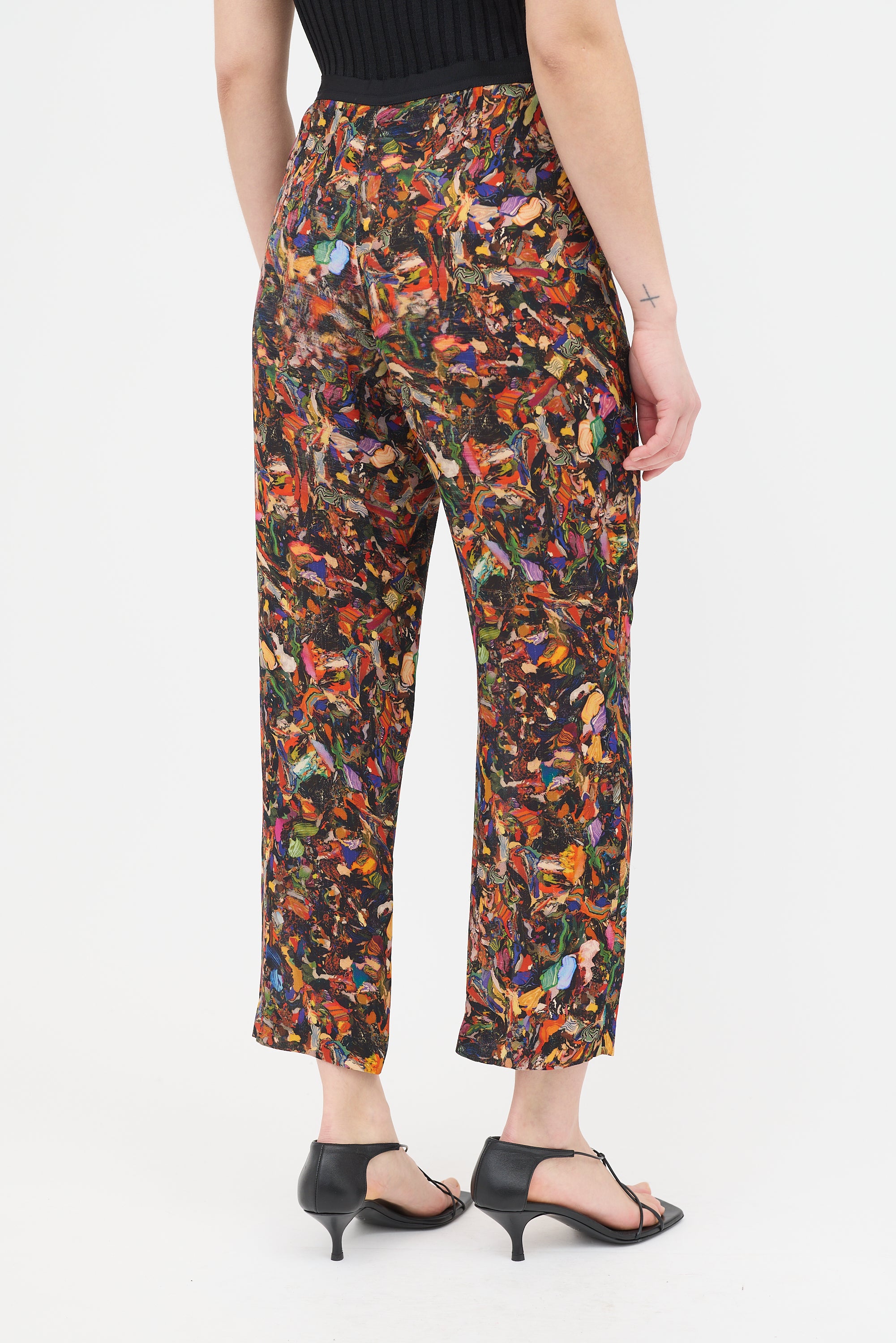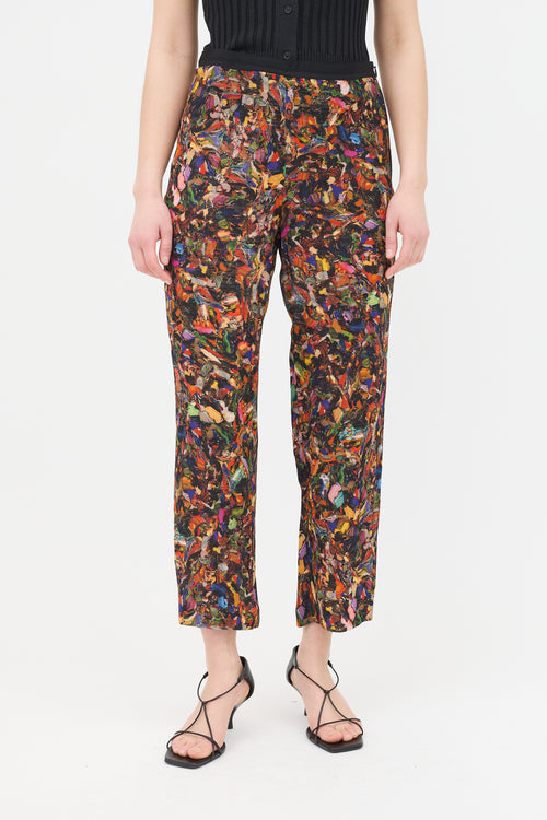 Pre-owned Dries Van Noten Fall/Winter 2008 multicolour silk trousers featuring abstract print, grosgrain waist trim, straight leg, and concealed side zip.