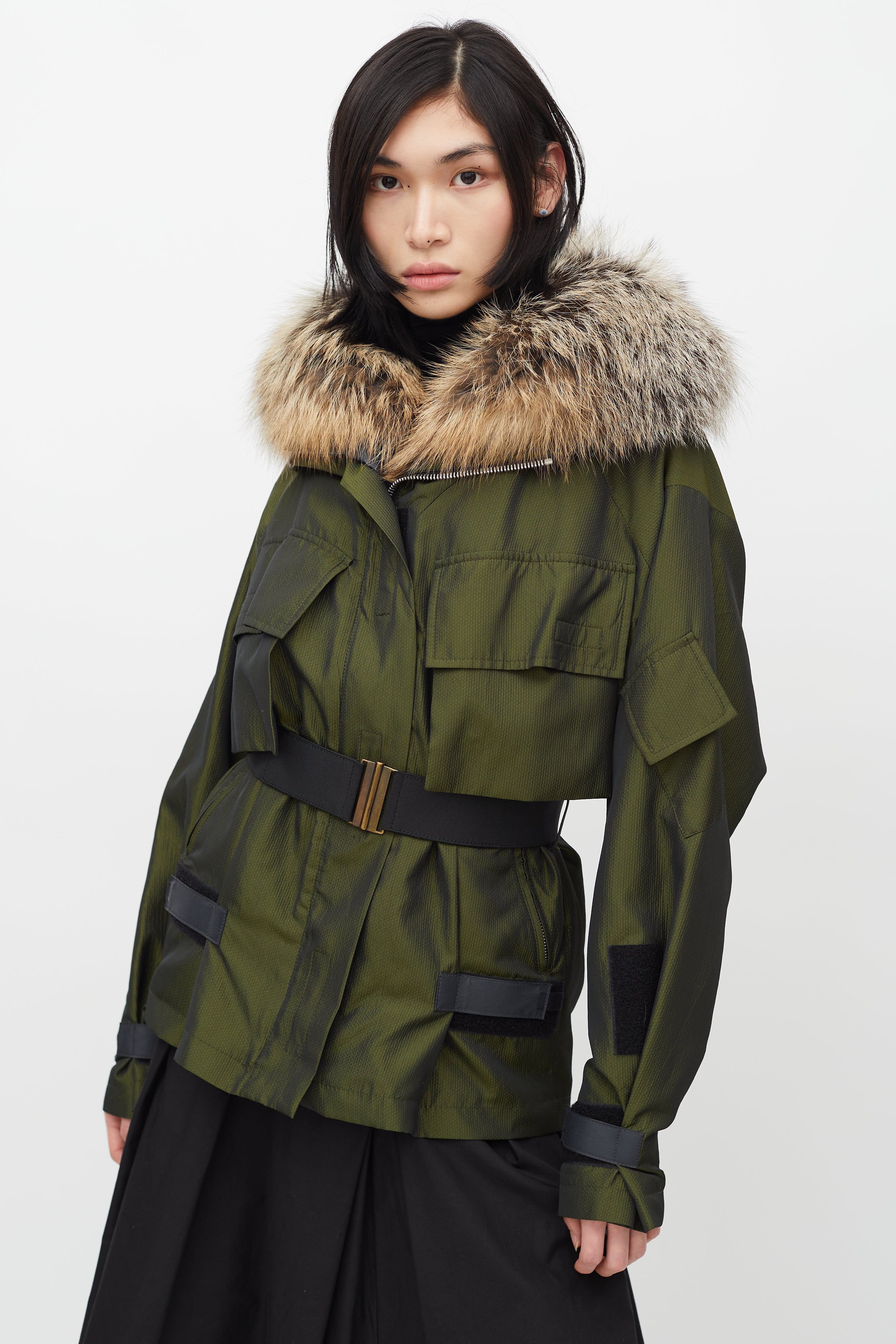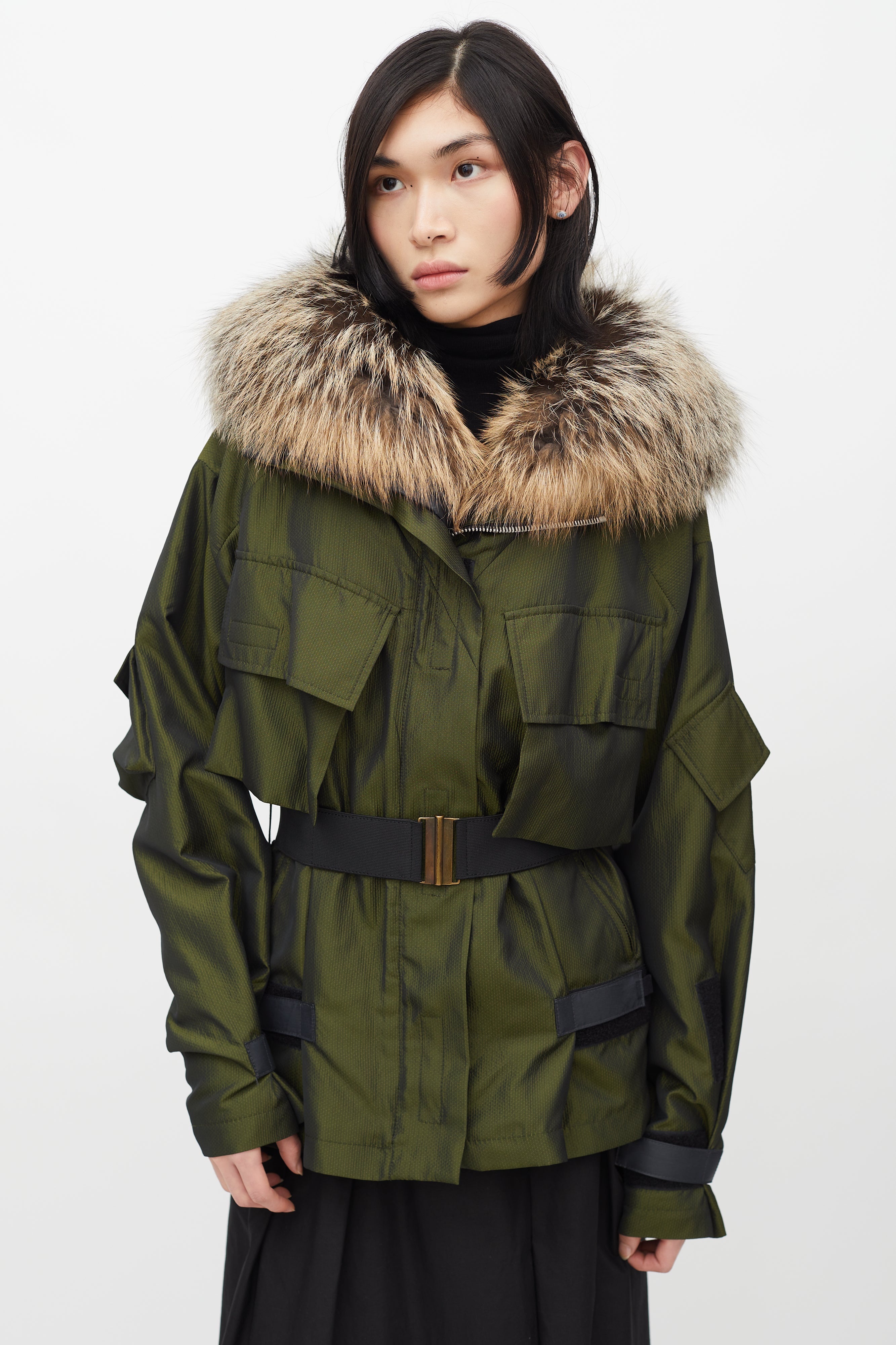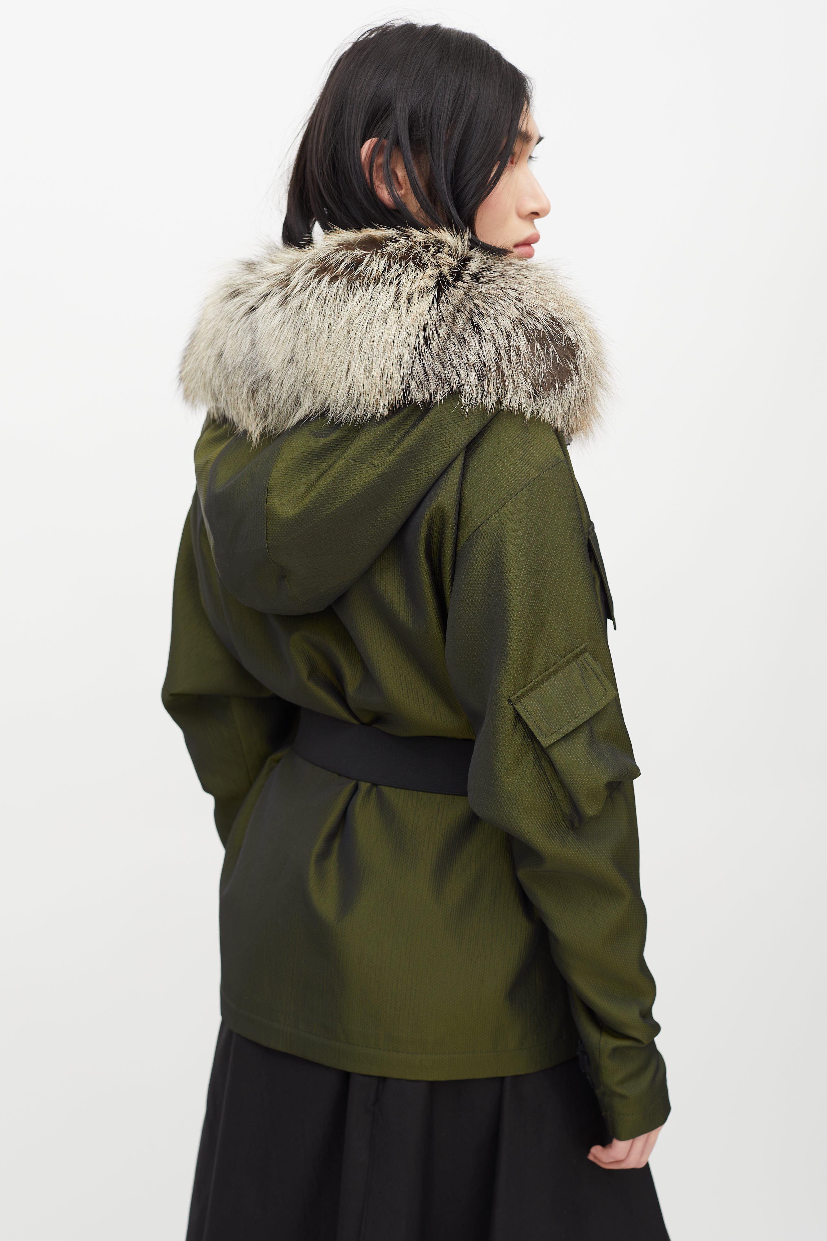 Pre-owned Dries Van Noten metallic green jacket featuring attached fox fur collar, attached hood, waist belt, zip up front, cargo pockets at sleeves and chest, two zip pockets at hips, and Velcro fastening at hips and cuffs. Lined.