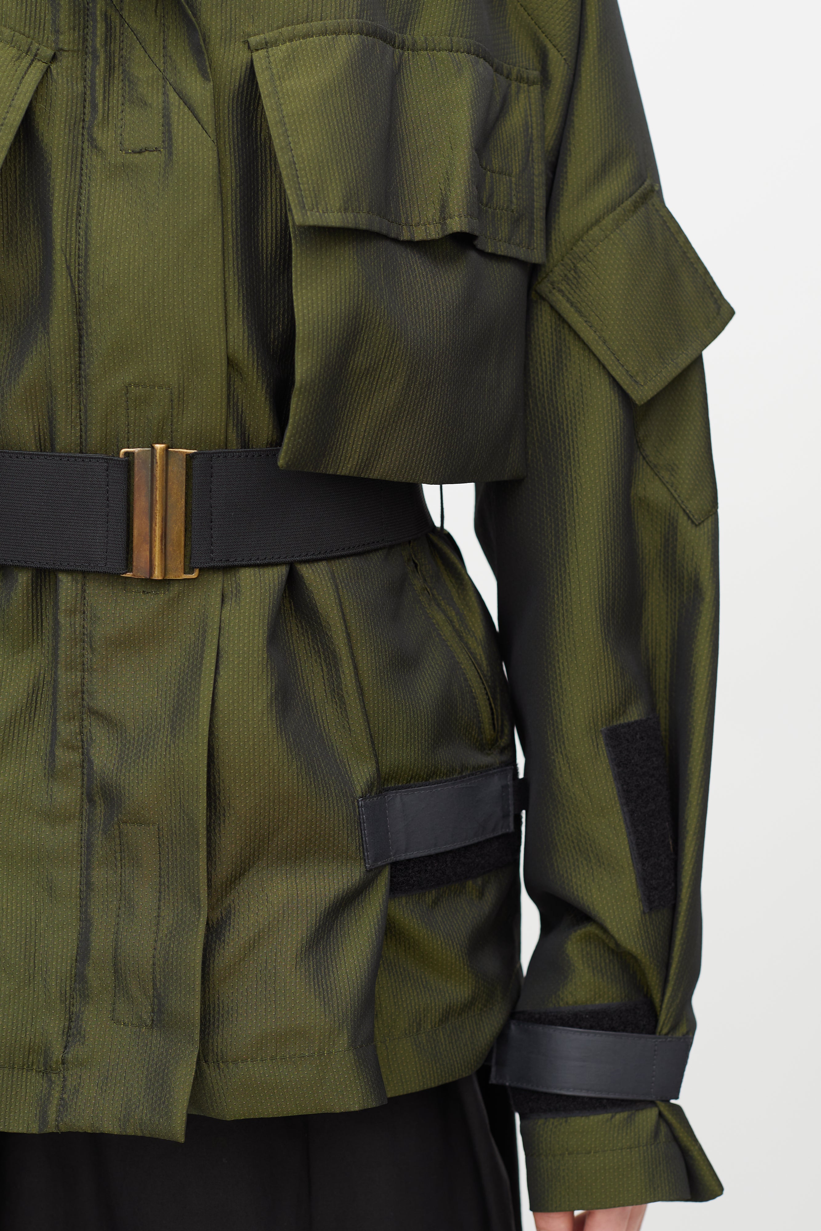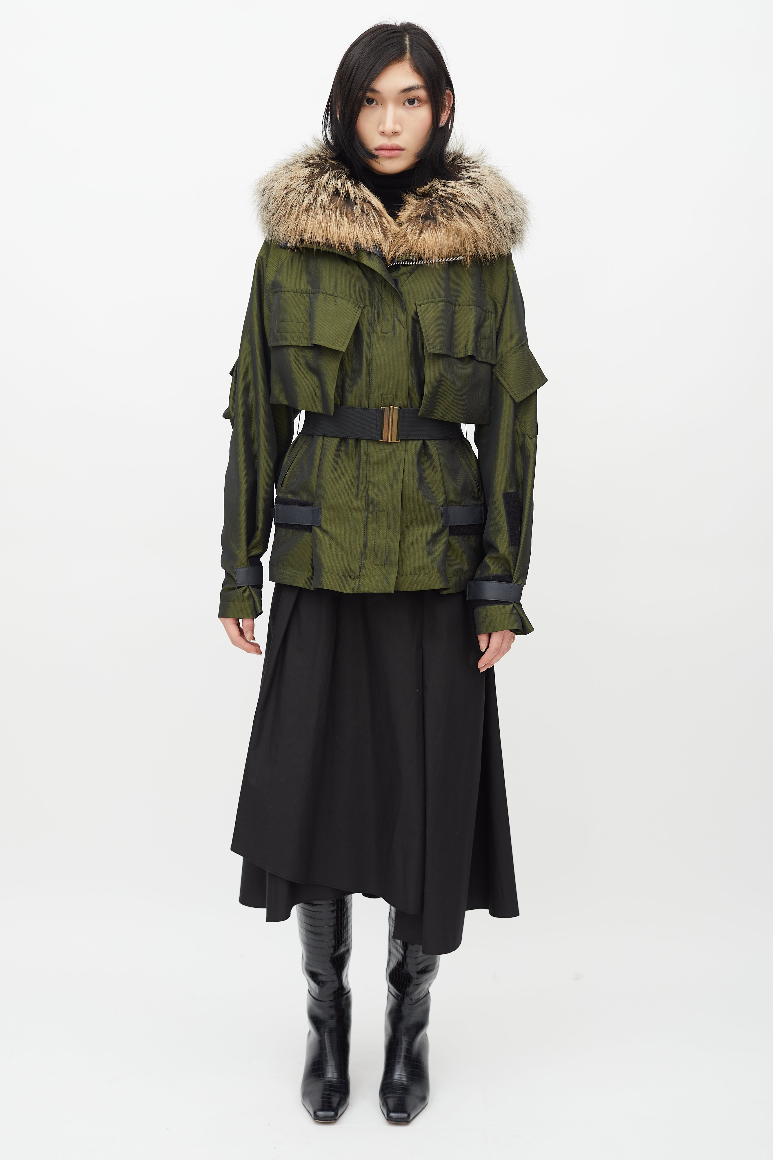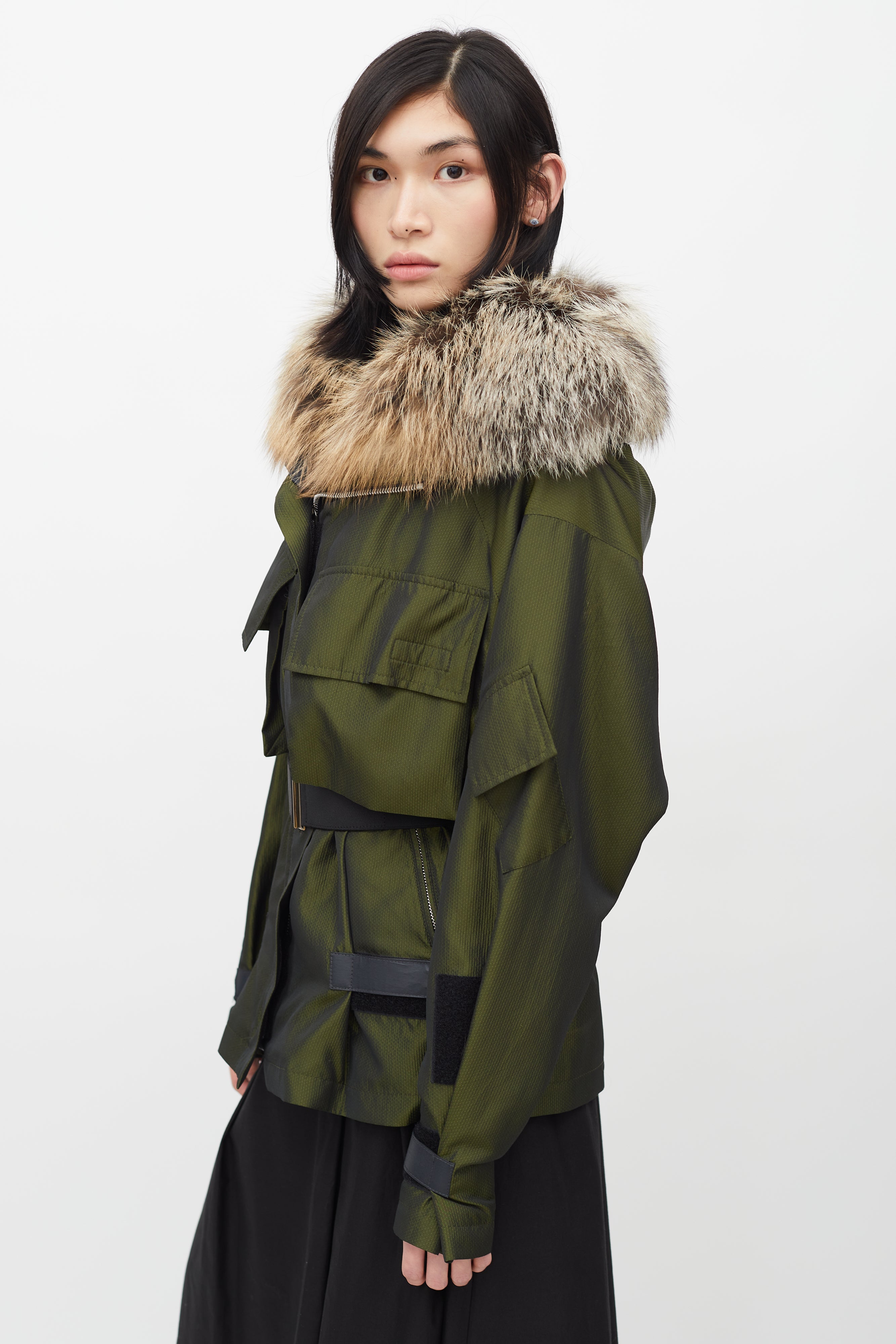 Pre-owned Dries Van Noten metallic green jacket featuring attached fox fur collar, attached hood, waist belt, zip up front, cargo pockets at sleeves and chest, two zip pockets at hips, and Velcro fastening at hips and cuffs. Lined.