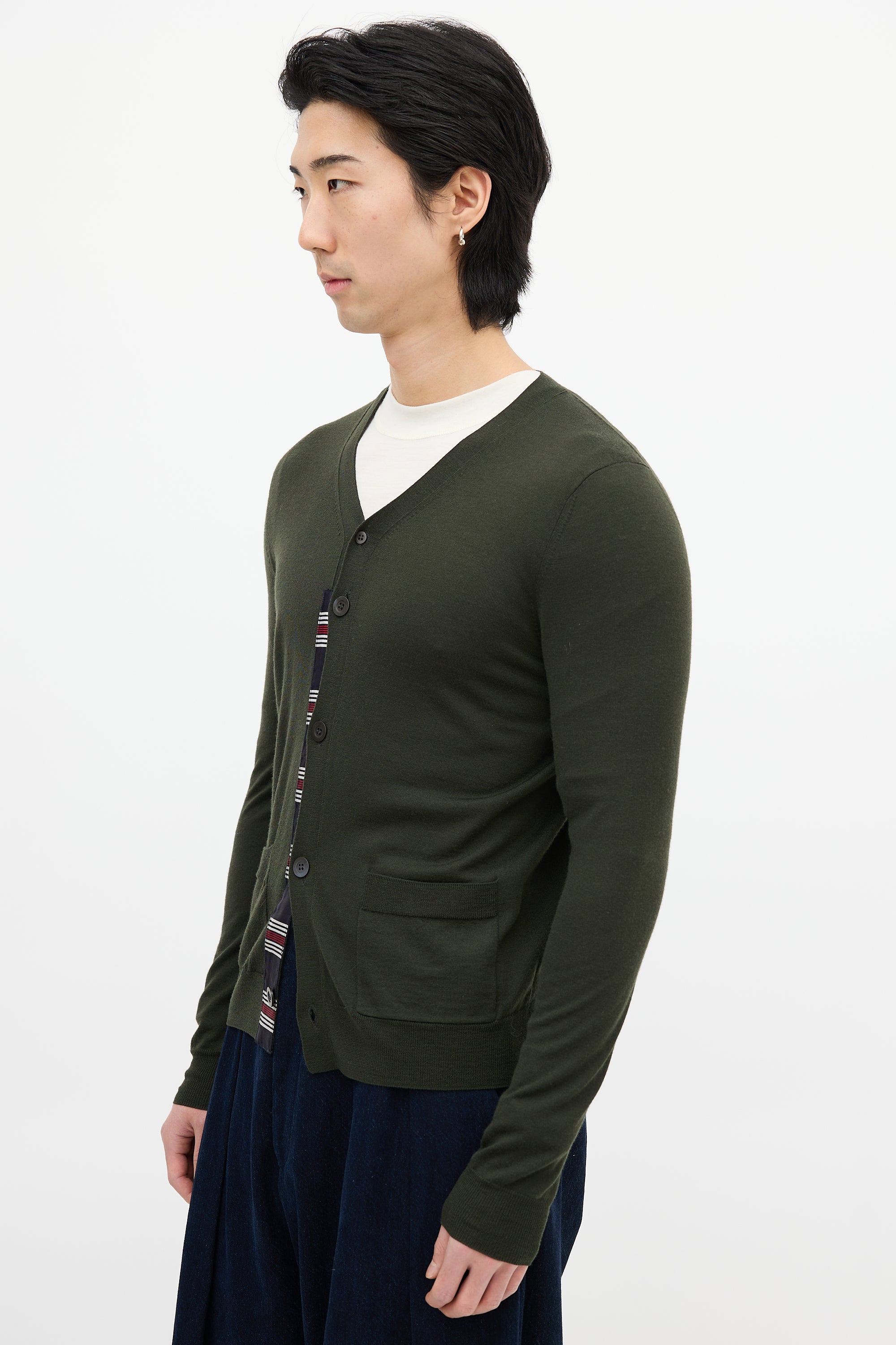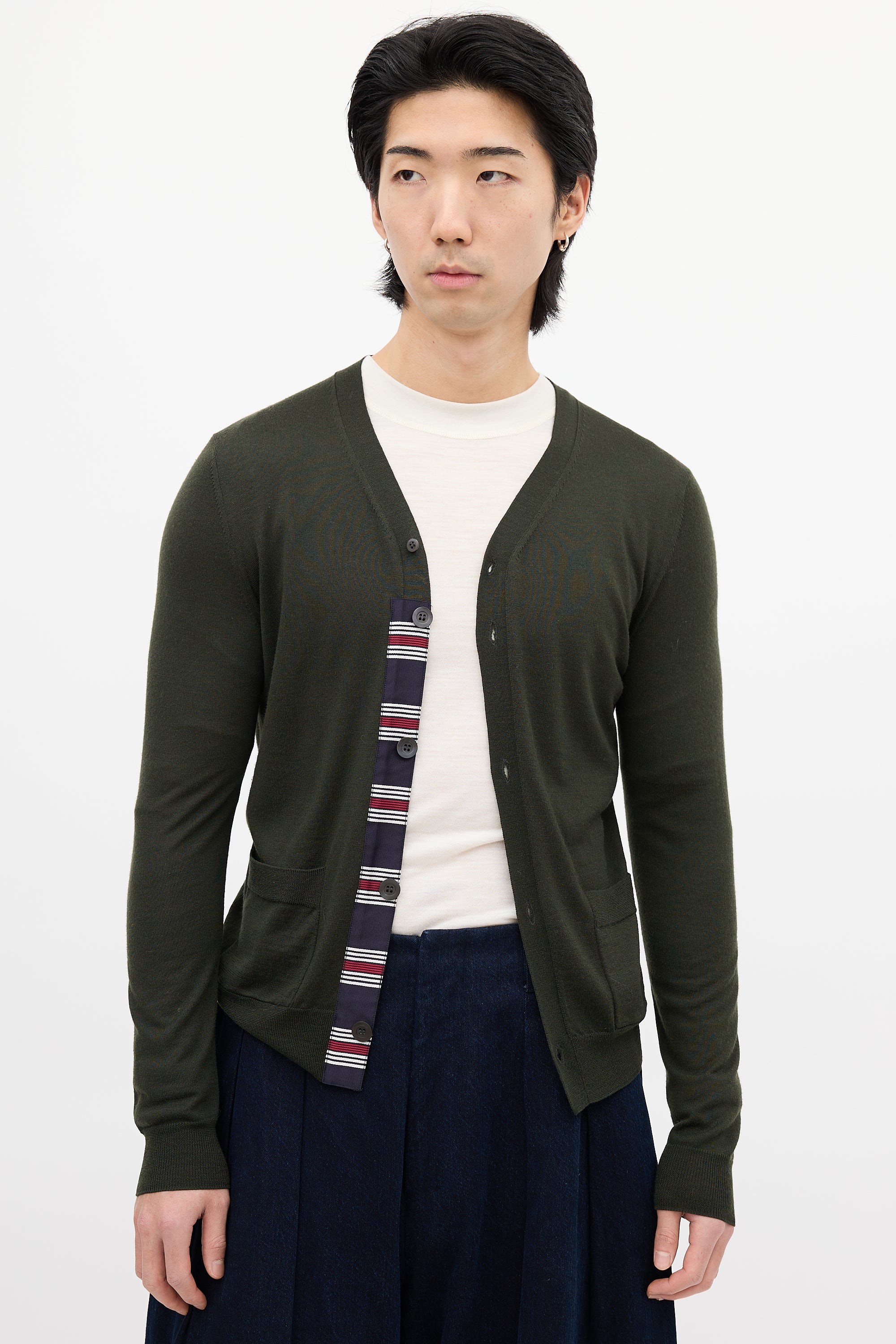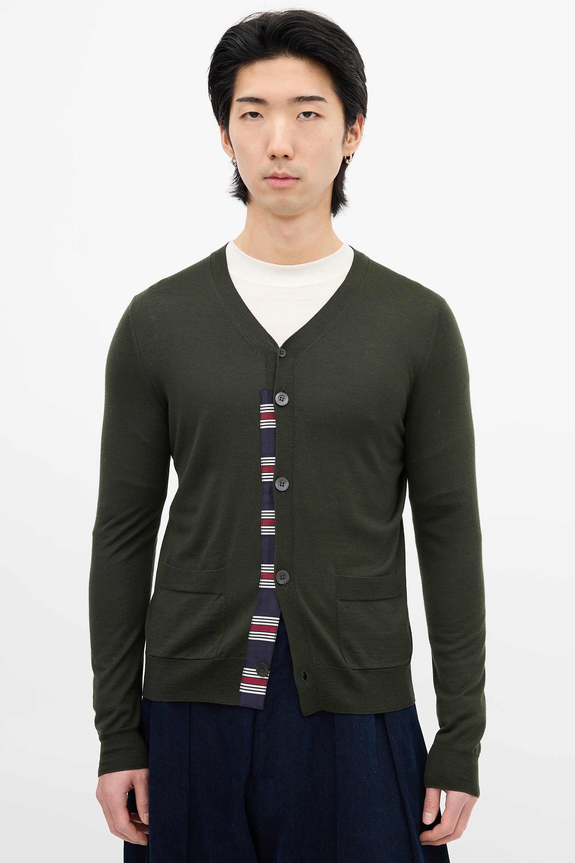Pre-owned Dries Van Noten green wool cardigan featuring a V-neckline, button up front, multicolour striped trim detail at placket, two patch pockets at front waist, even hem, and long sleeves.