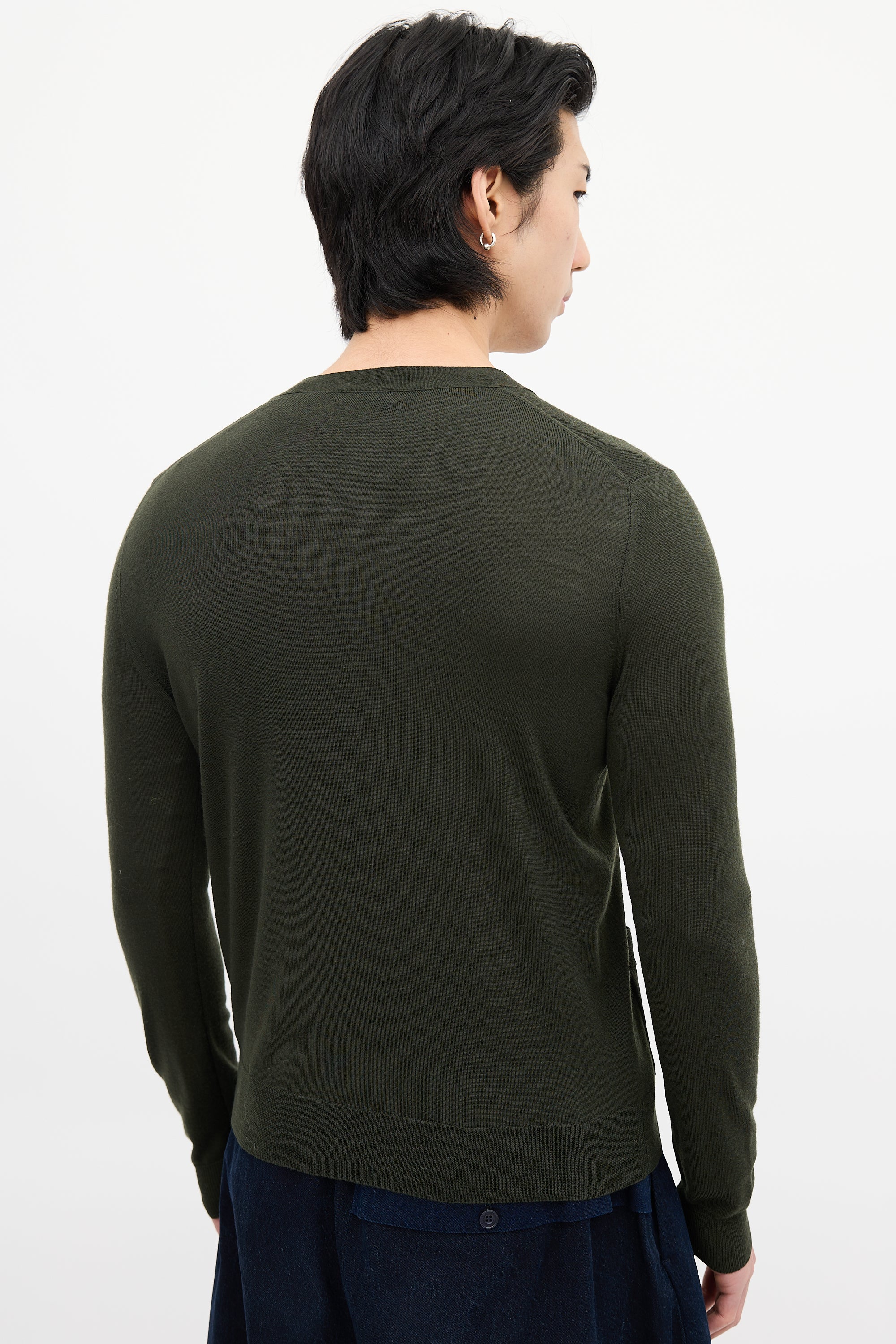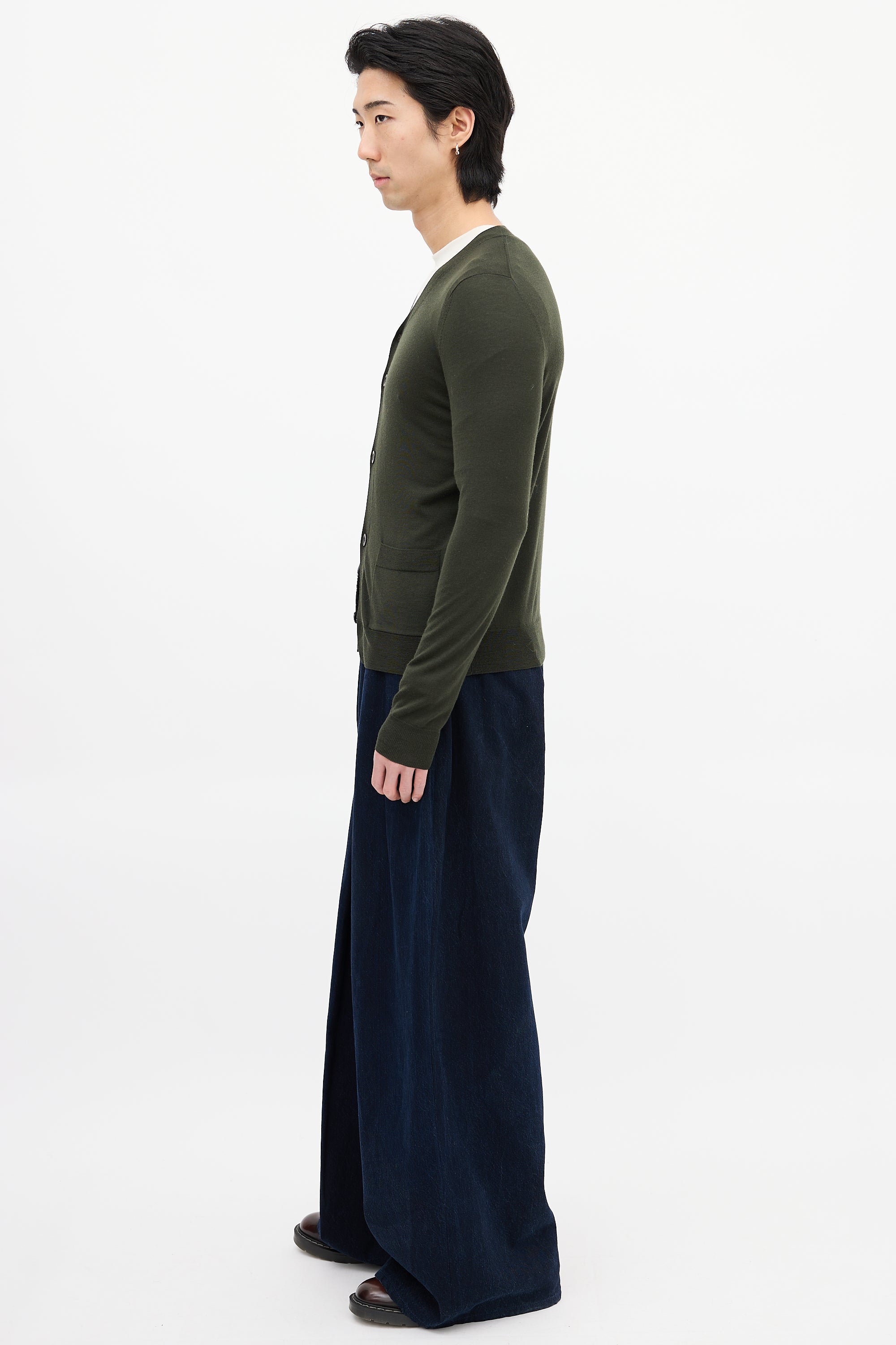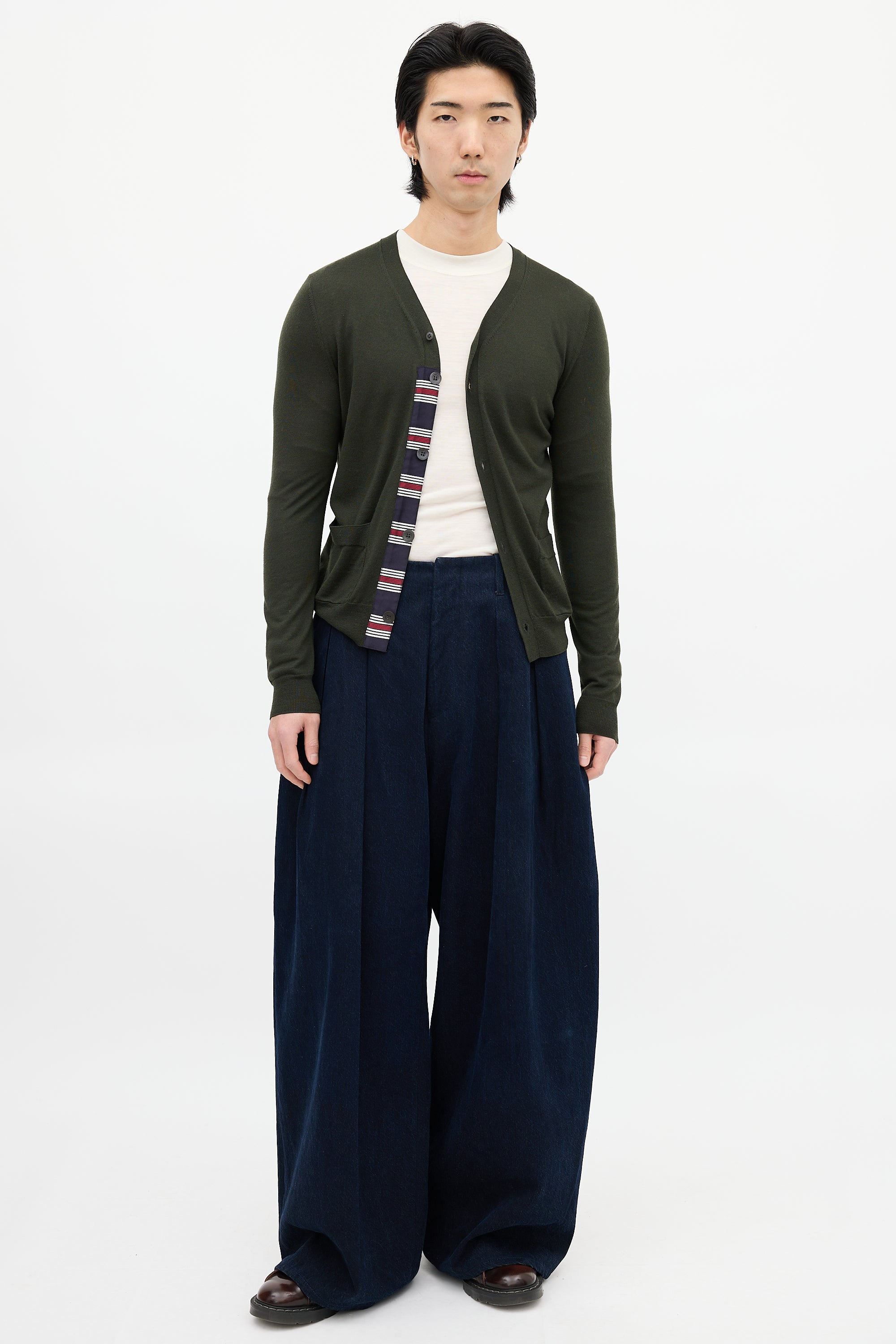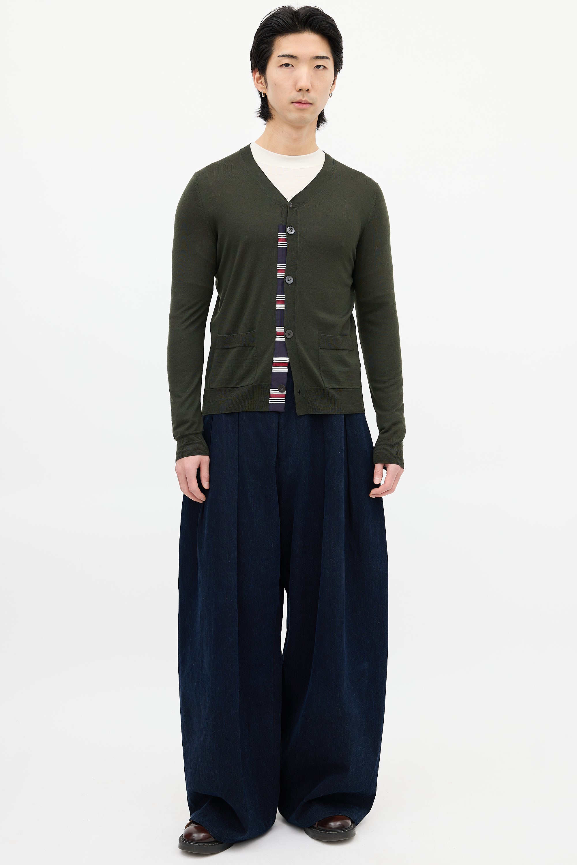 Pre-owned Dries Van Noten green wool cardigan featuring a V-neckline, button up front, multicolour striped trim detail at placket, two patch pockets at front waist, even hem, and long sleeves.