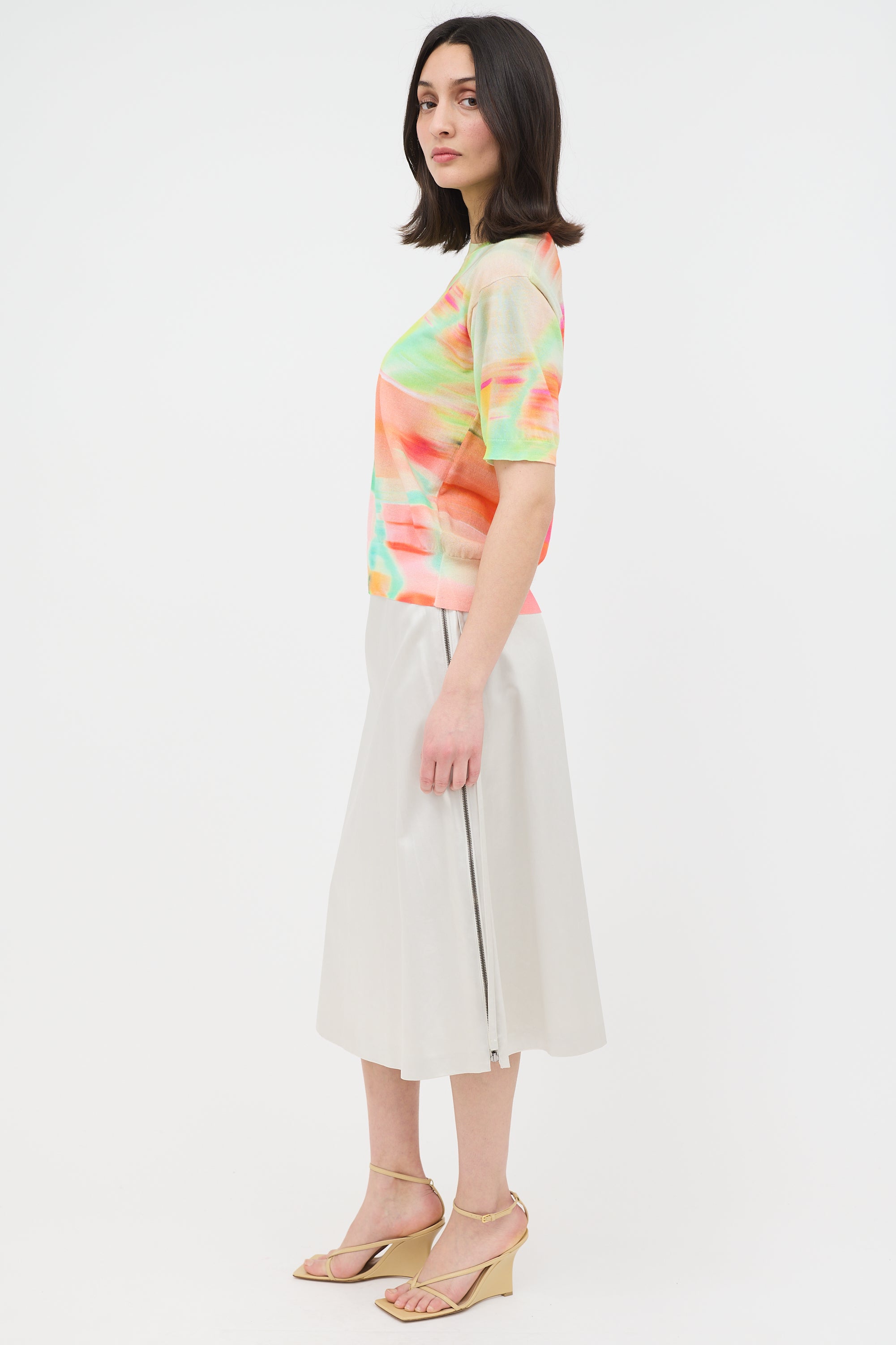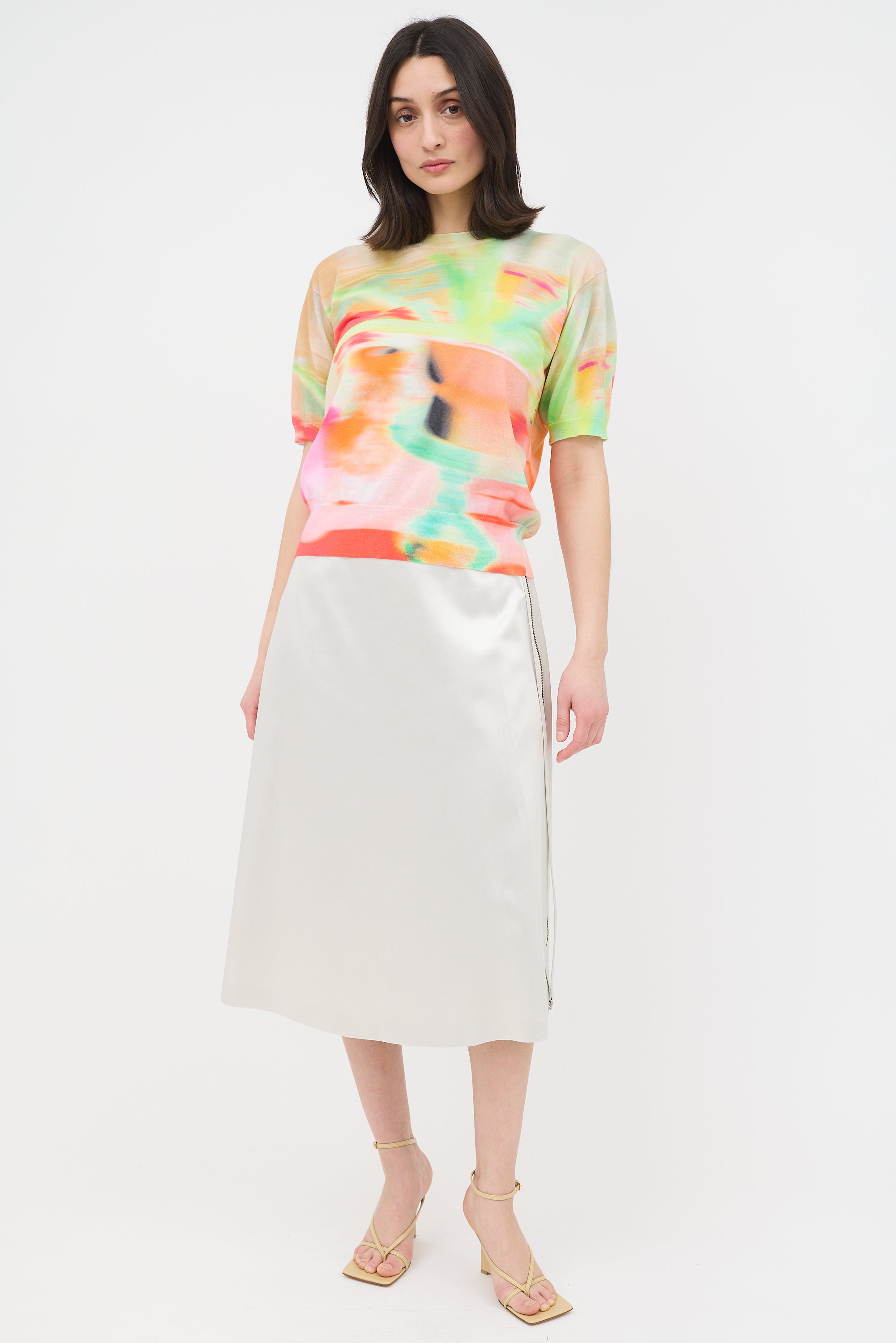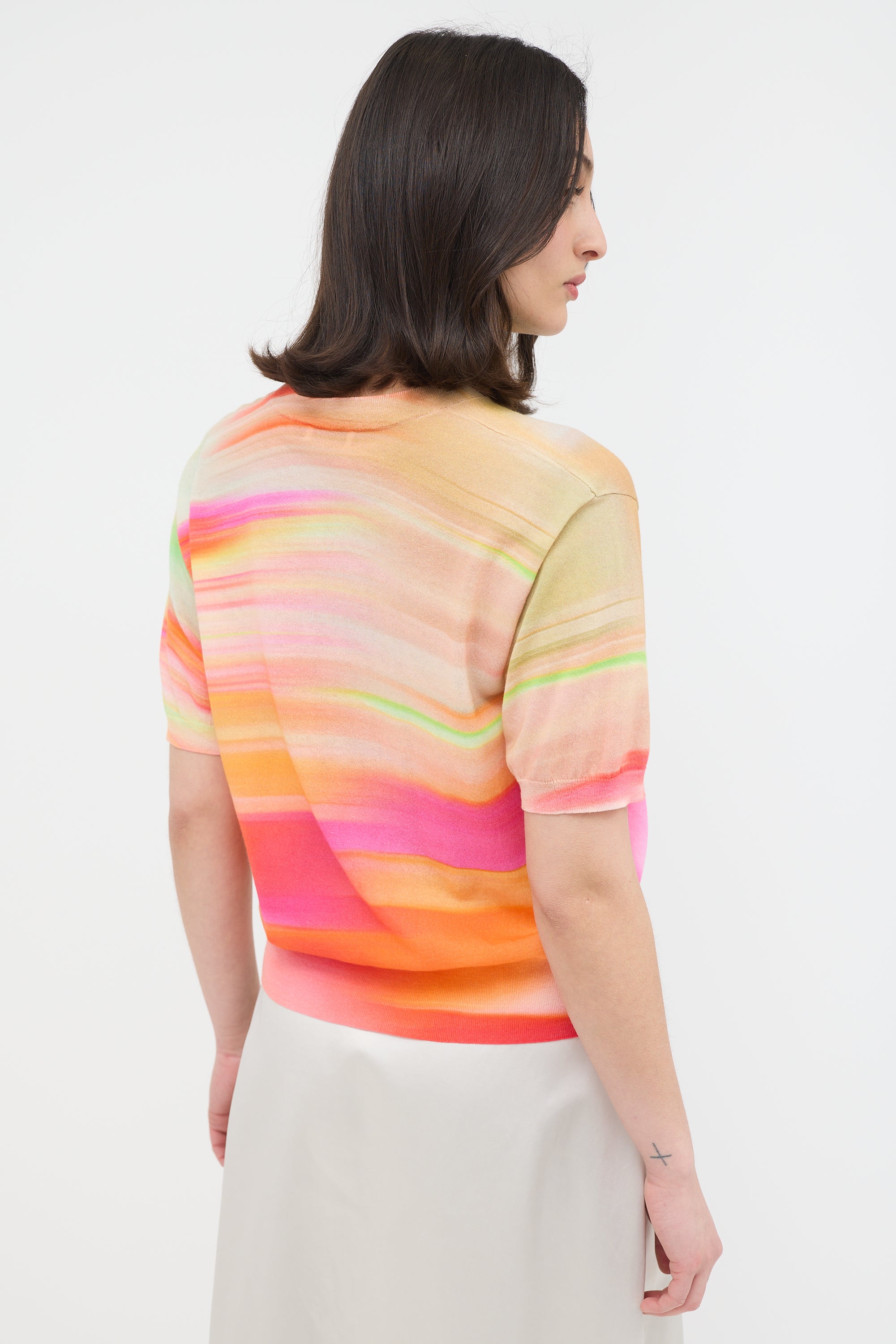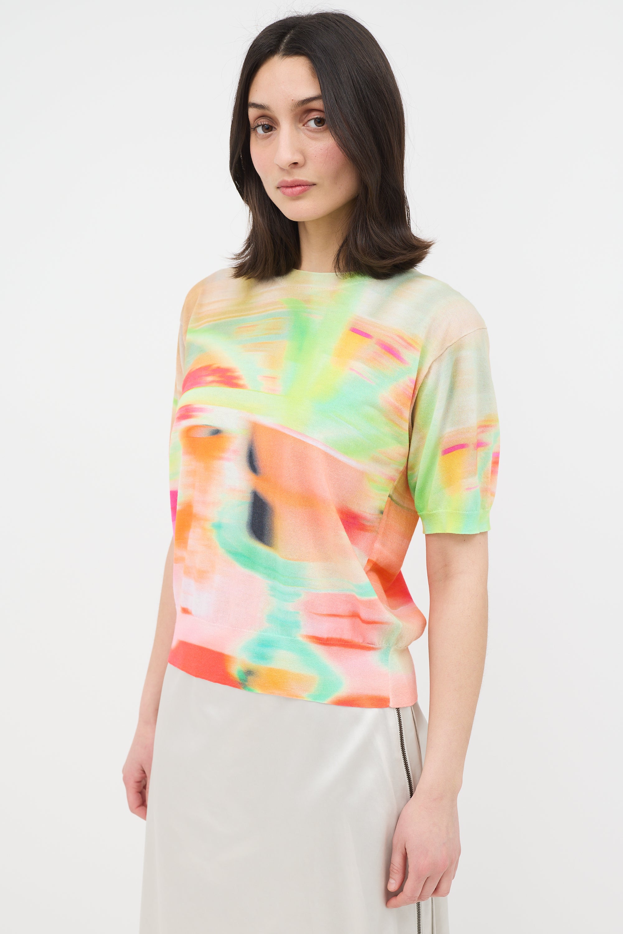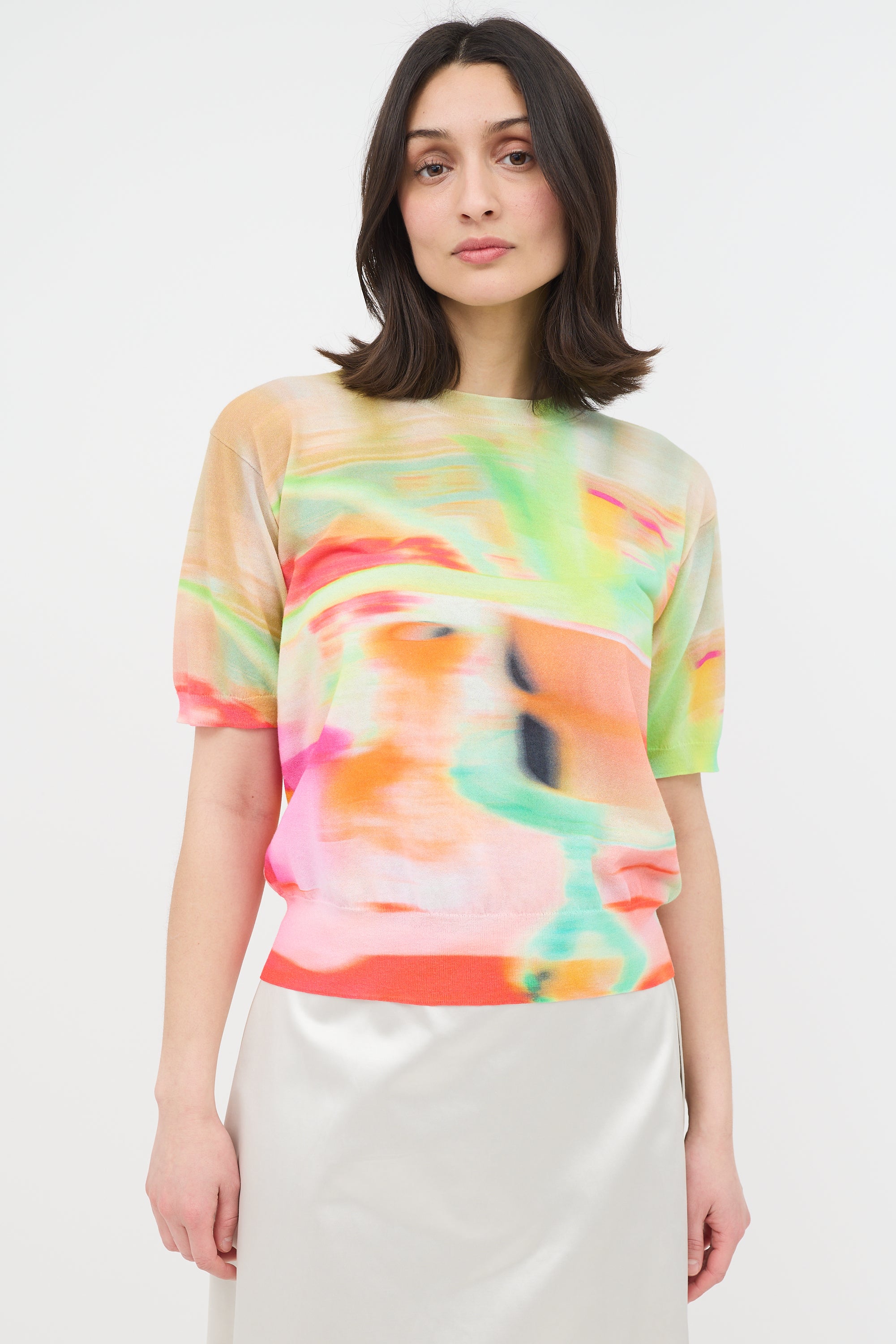 Pre-owned Dries Van Noten multicolour Jette short sleeve sweater featuring abstract dye, crew neck, and ribbed collar, hem, and cuffs.
