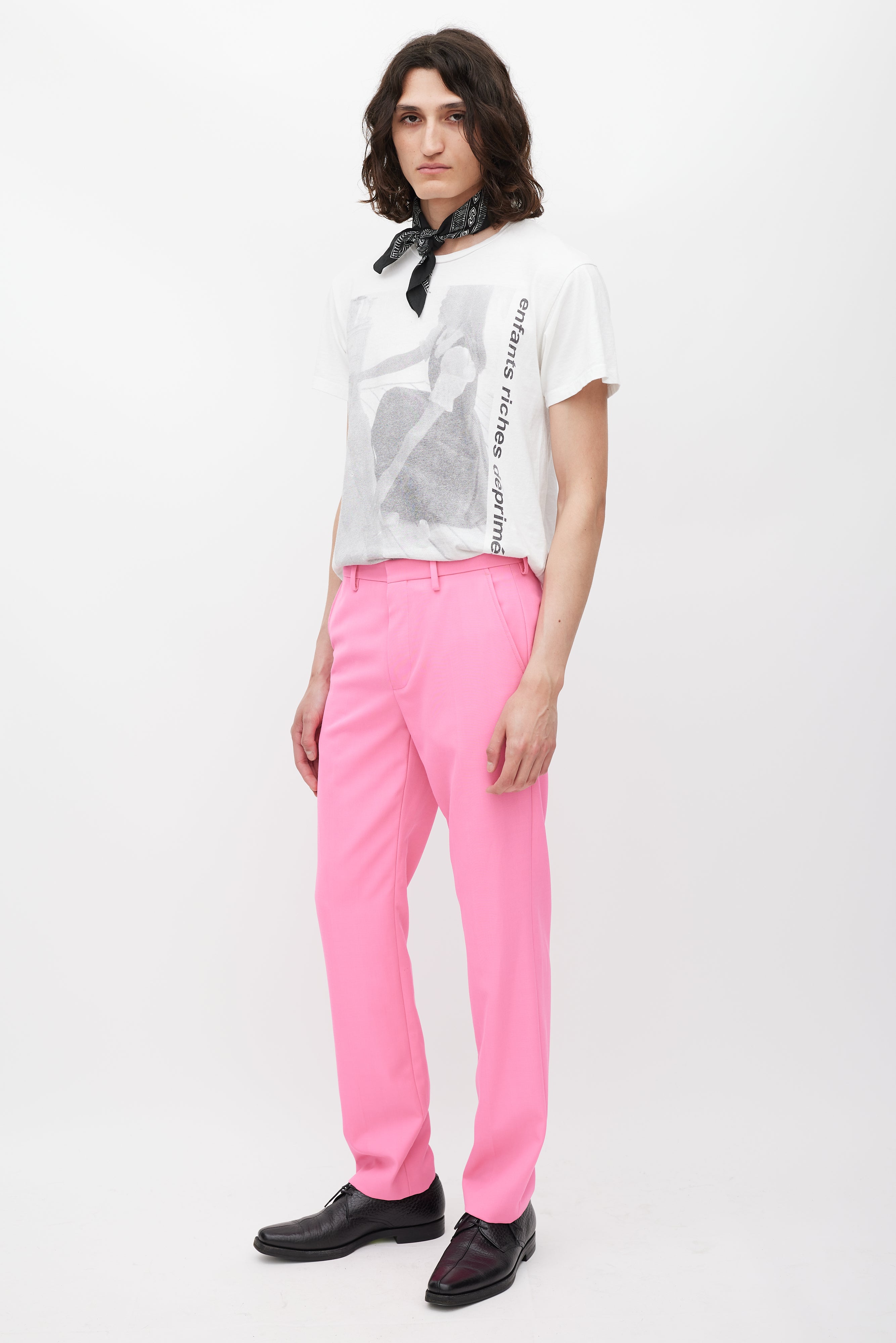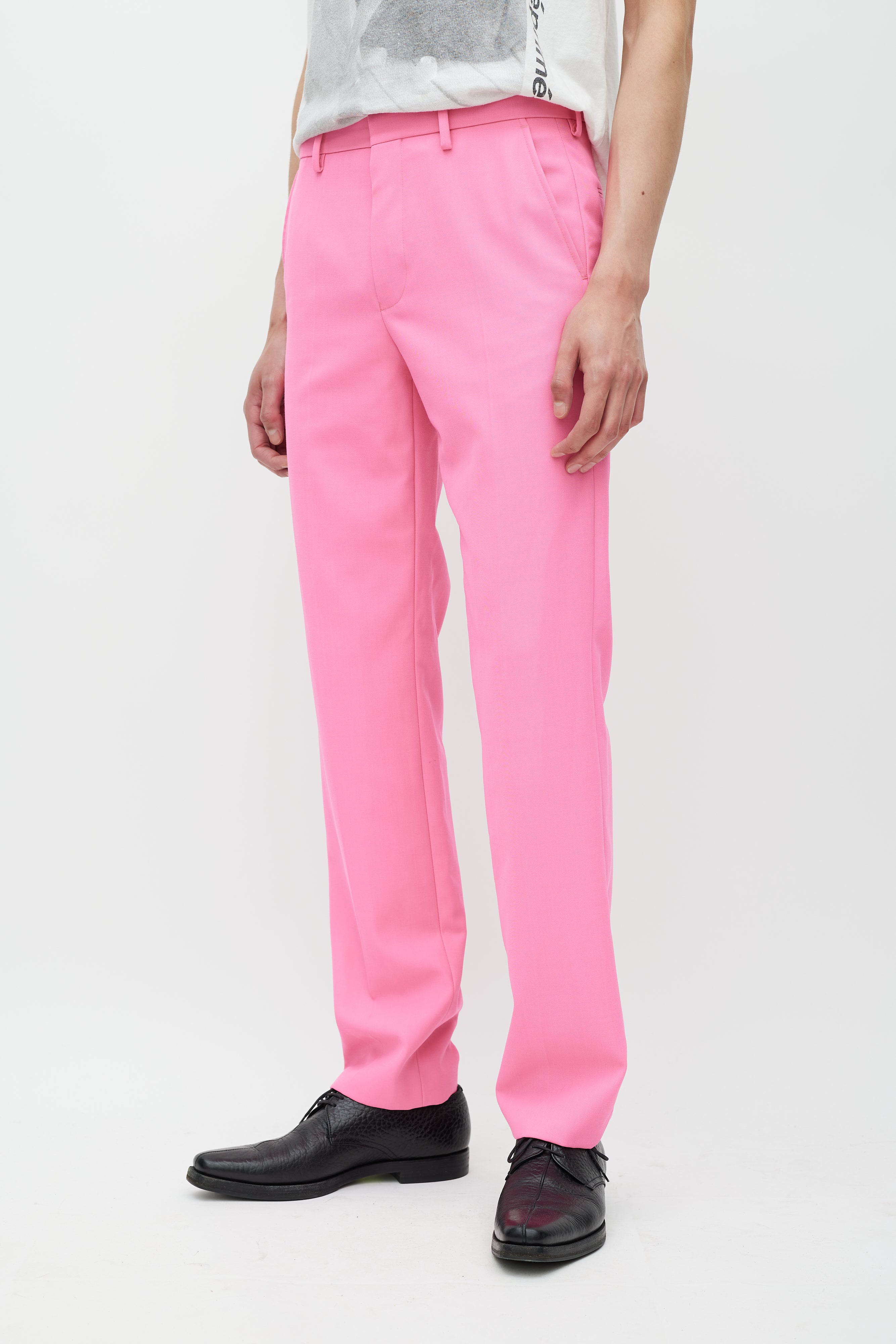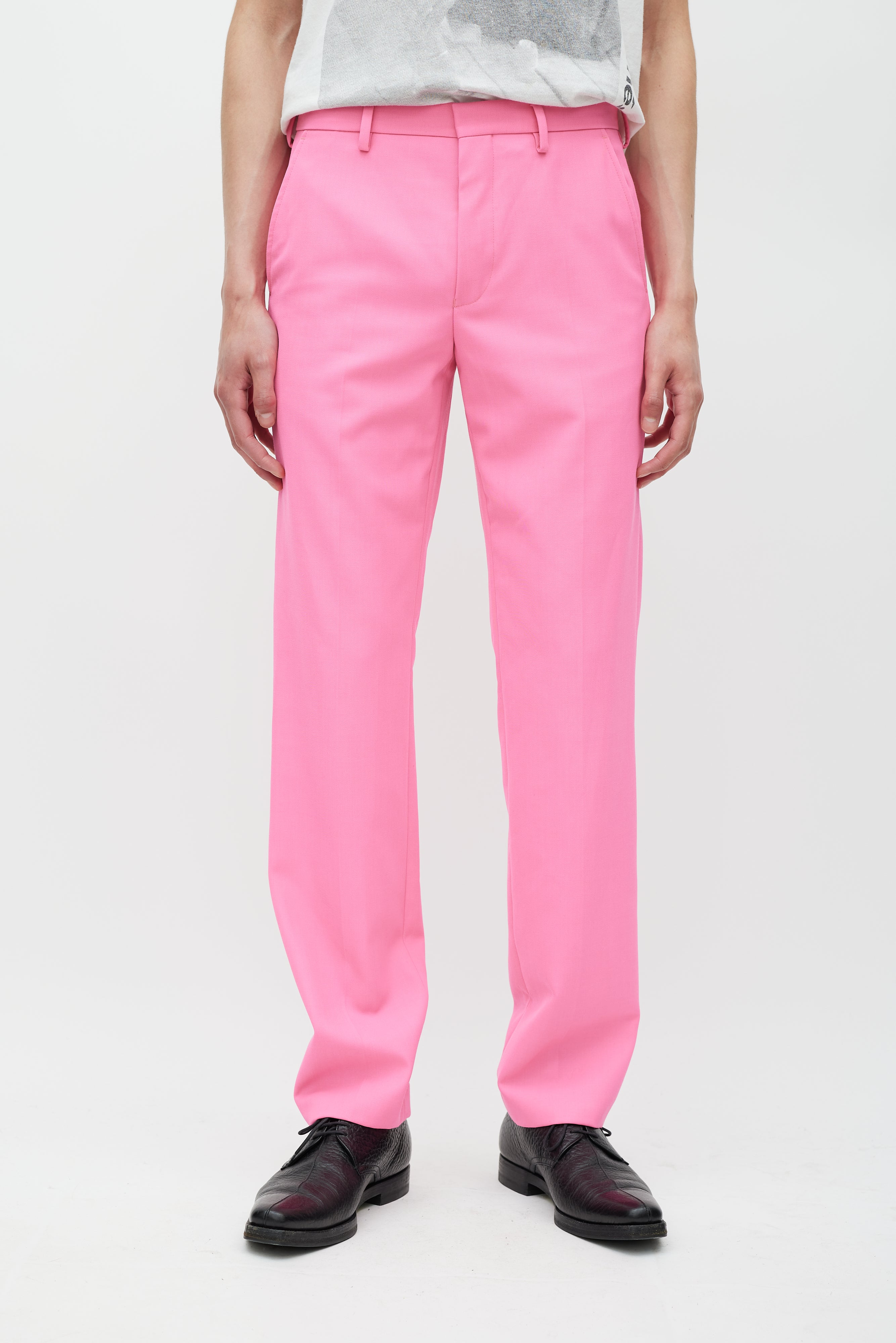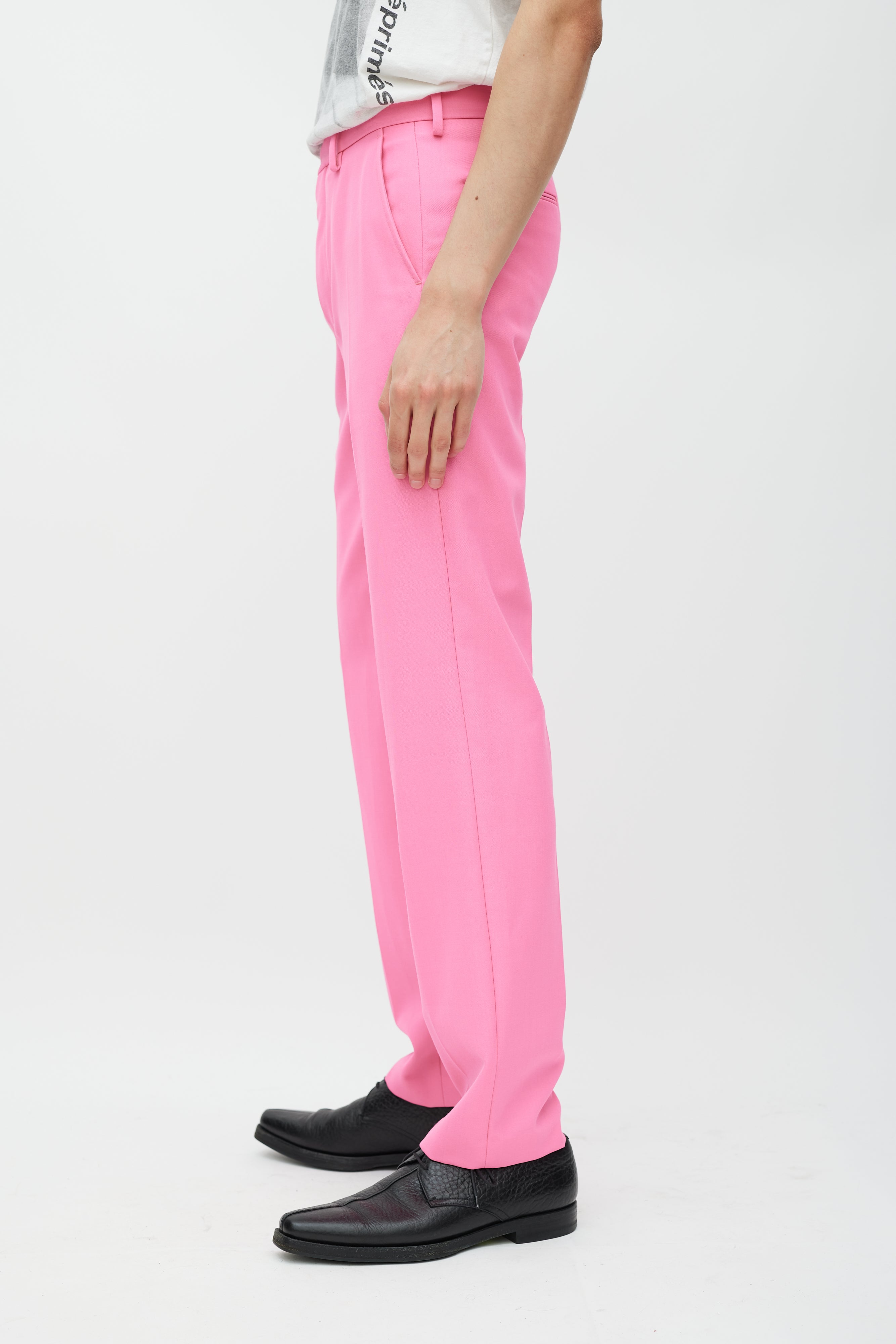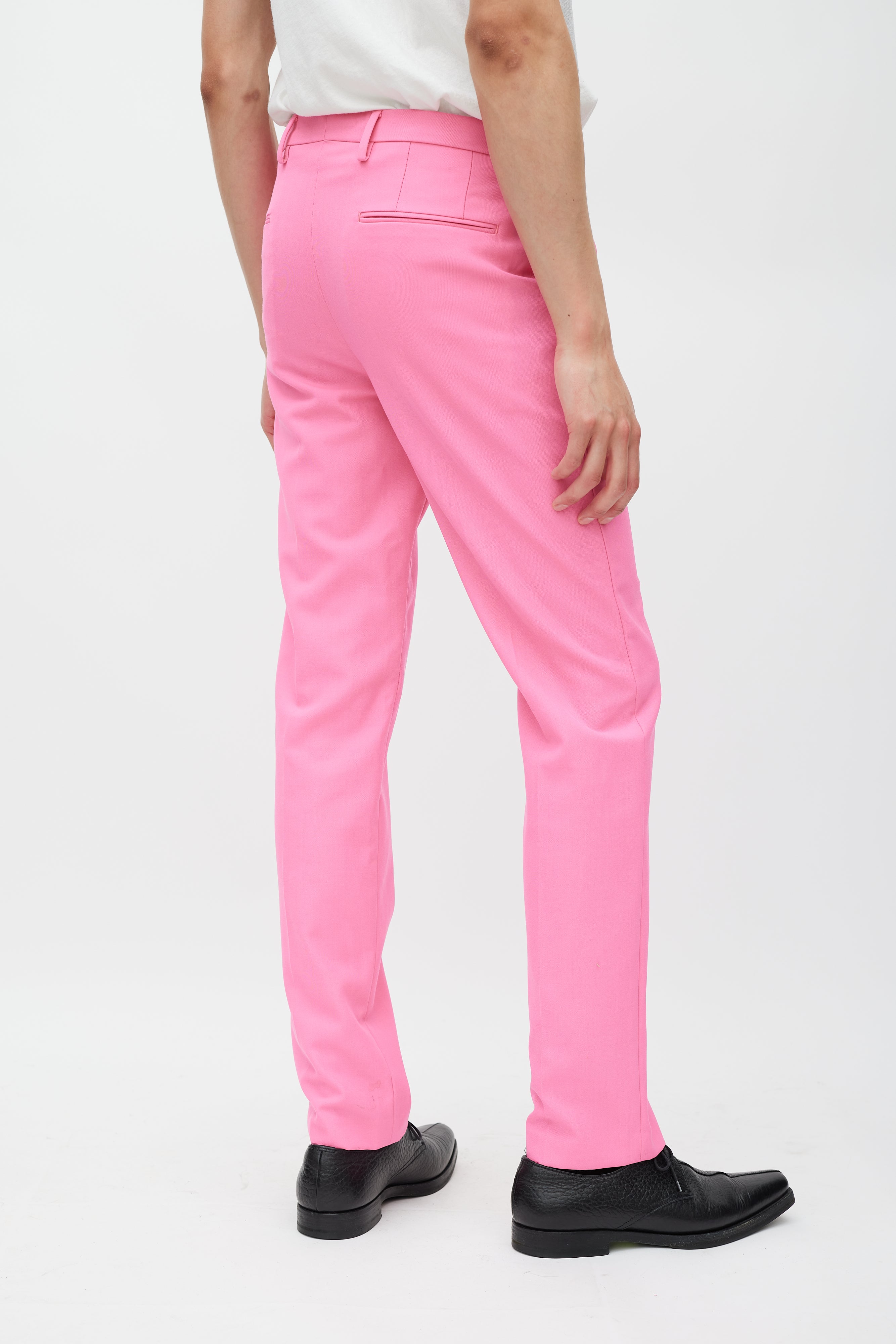 Pre-owned Dries Van Noten pink wool trousers featuring two slip pockets at hip, two welt pockets at back, slim leg, and zip fly with hook and eye closure.