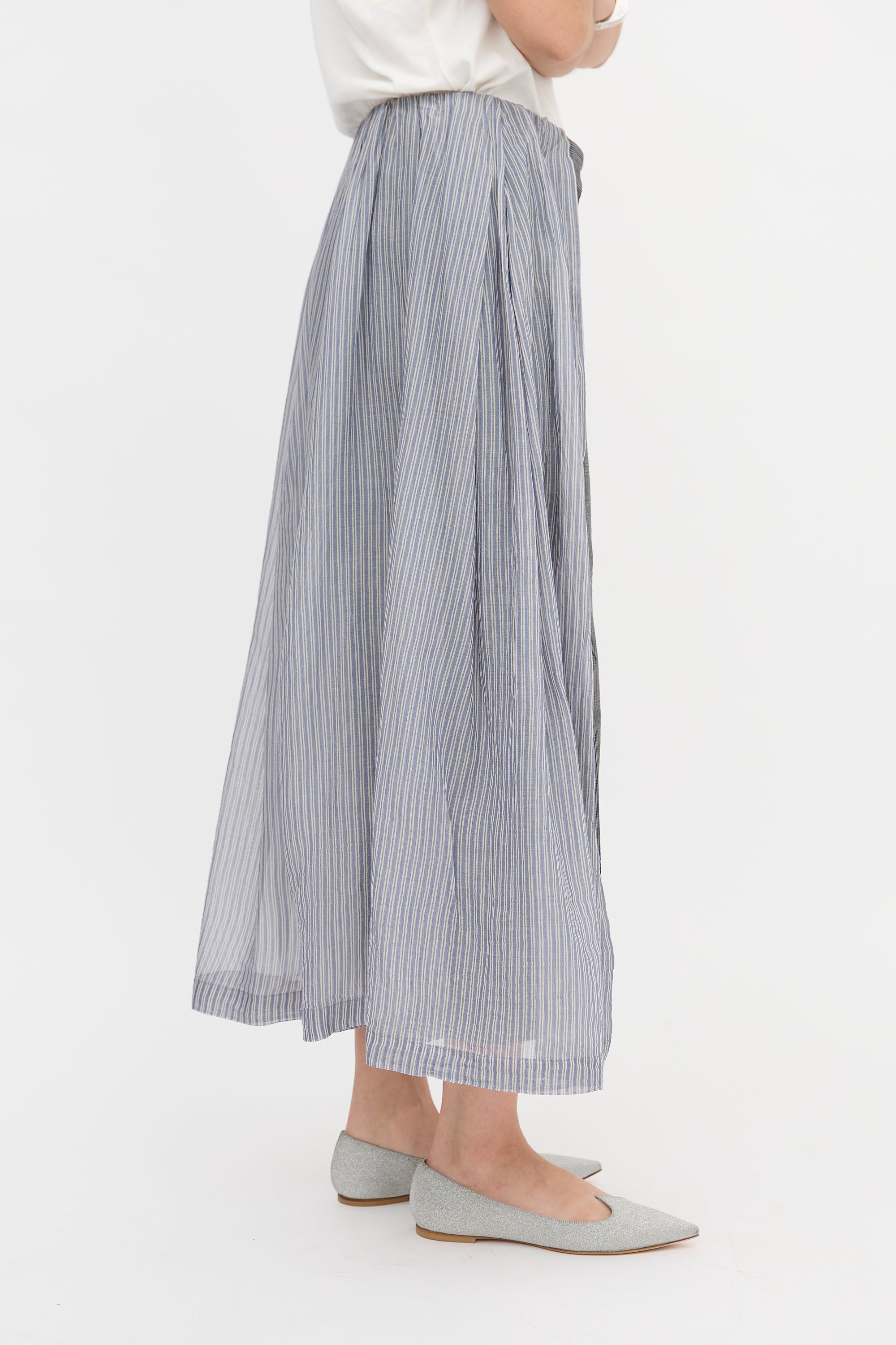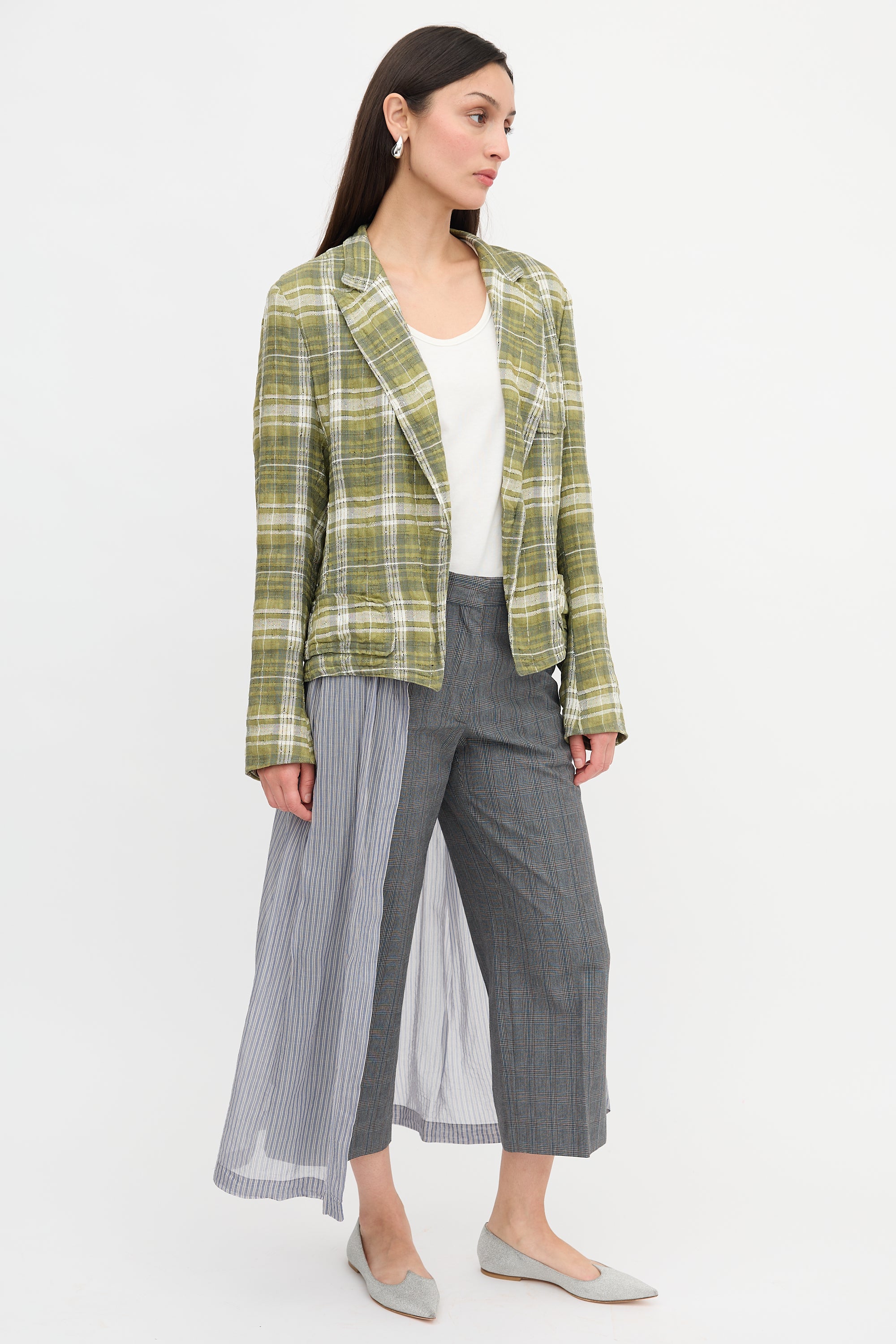 Pre-owned Dries Van Noten grey and blue plaid trousers featuring a zip fly, belt loops, two side pockets, striped gauzy cotton skirt overlay at back and sides, and a cropped straight leg.