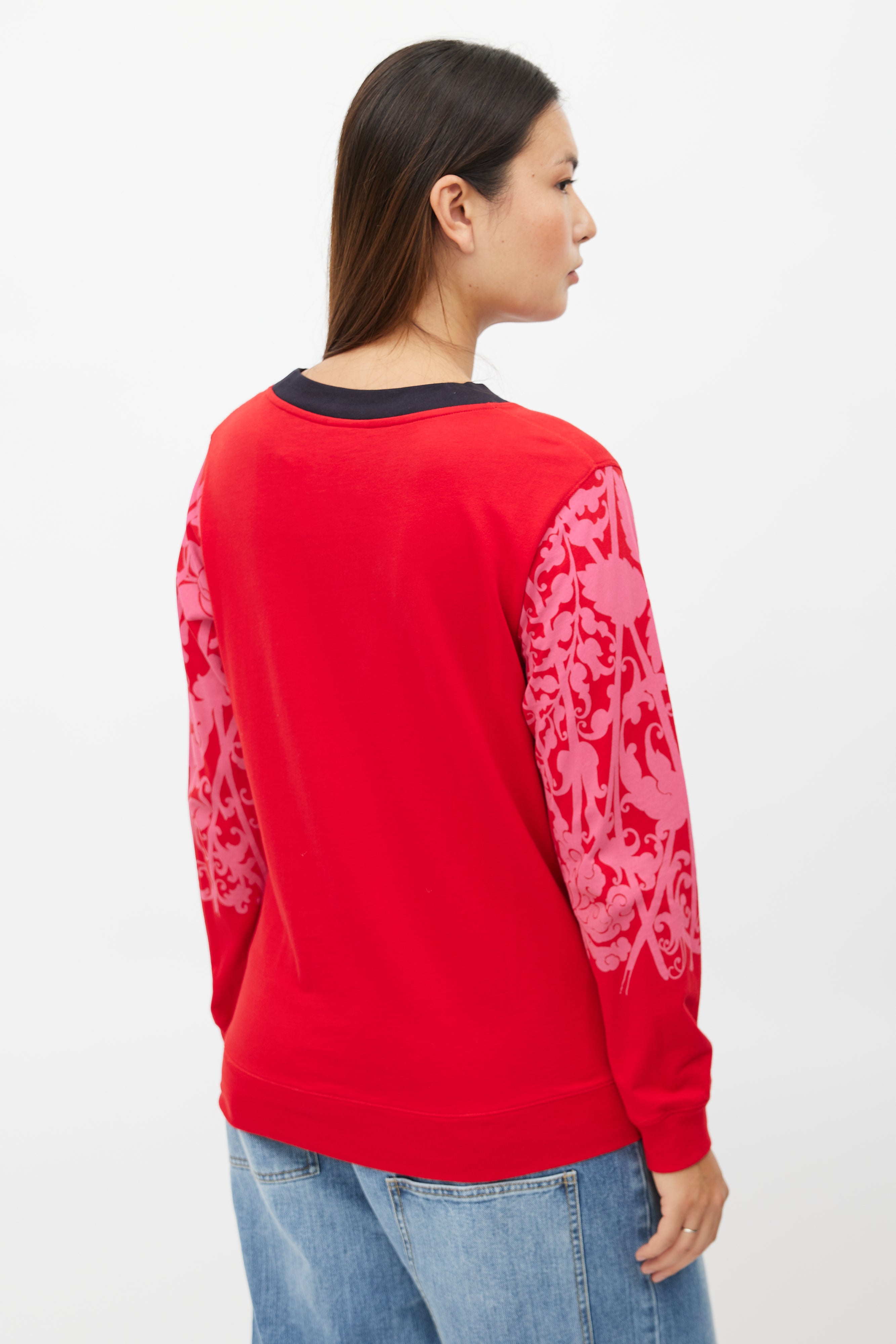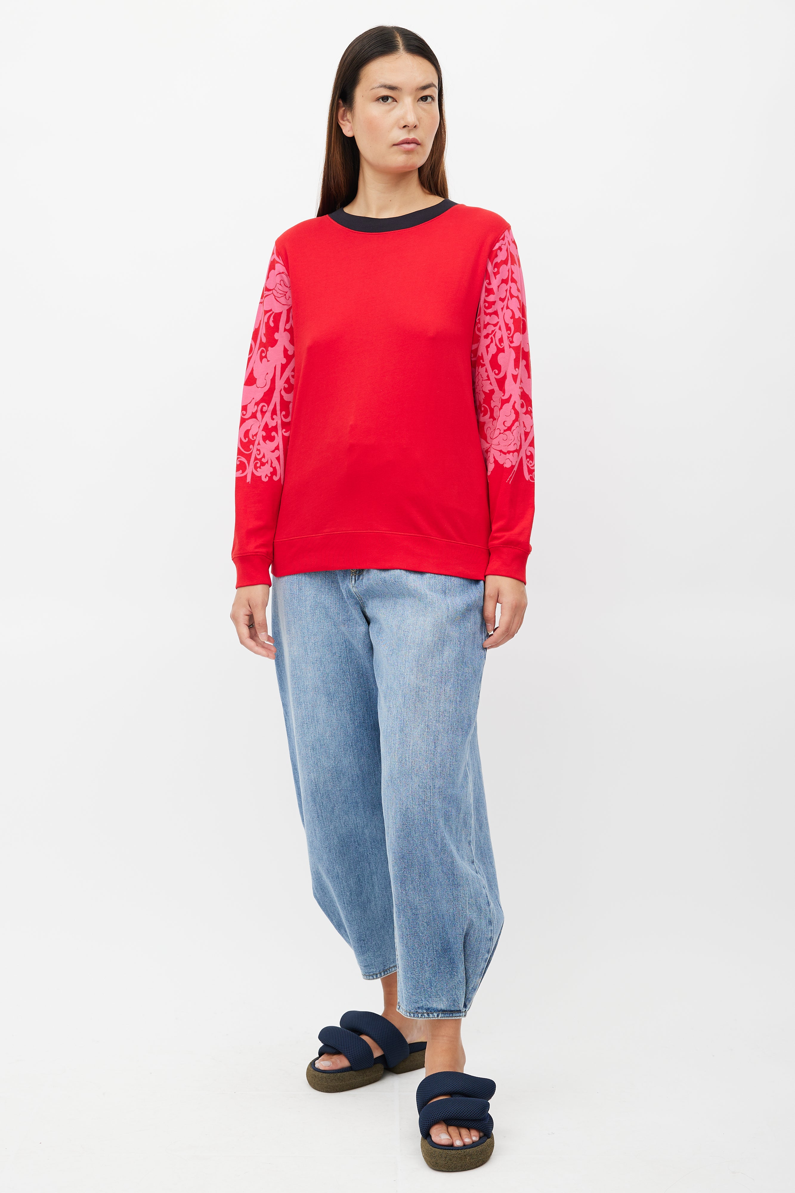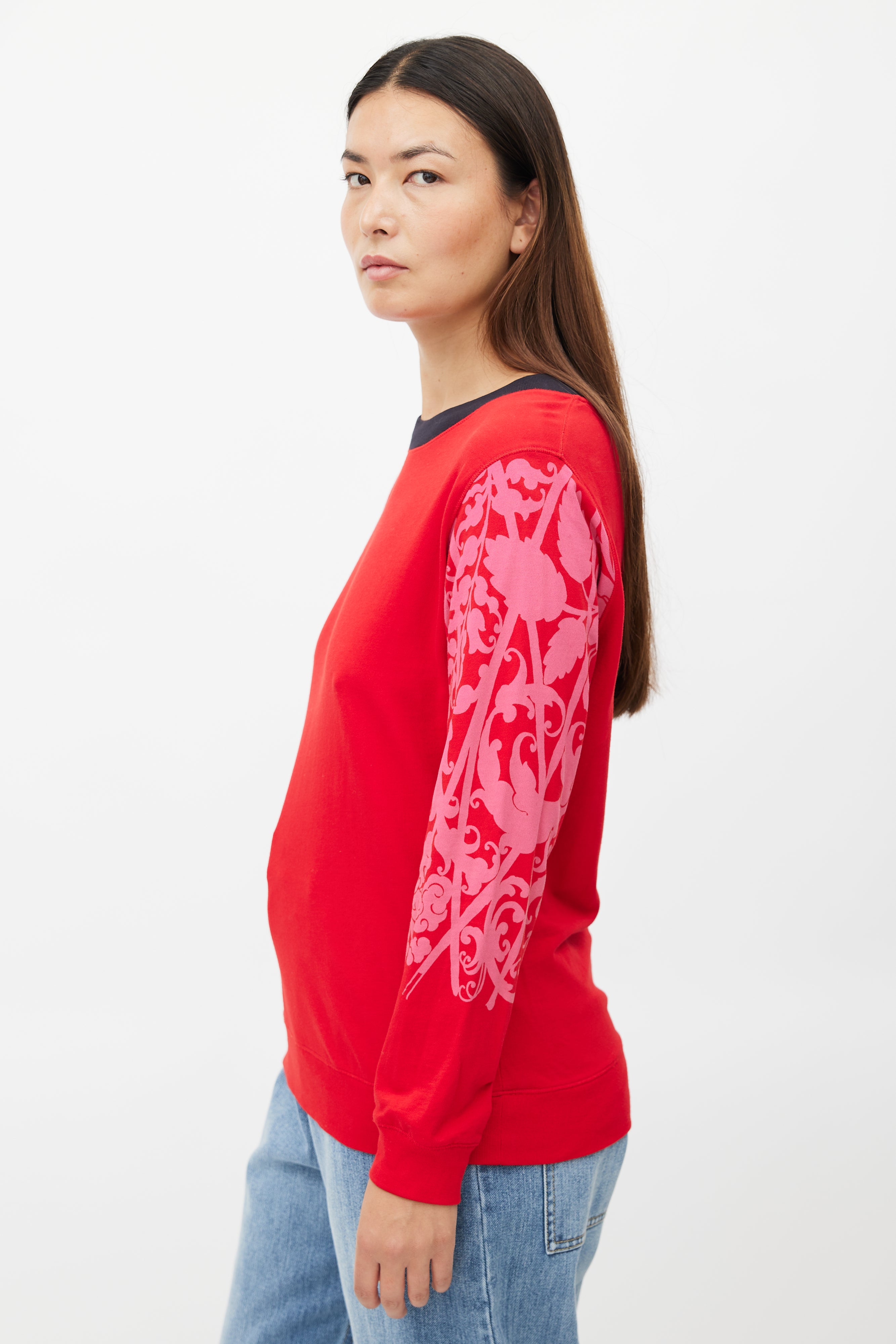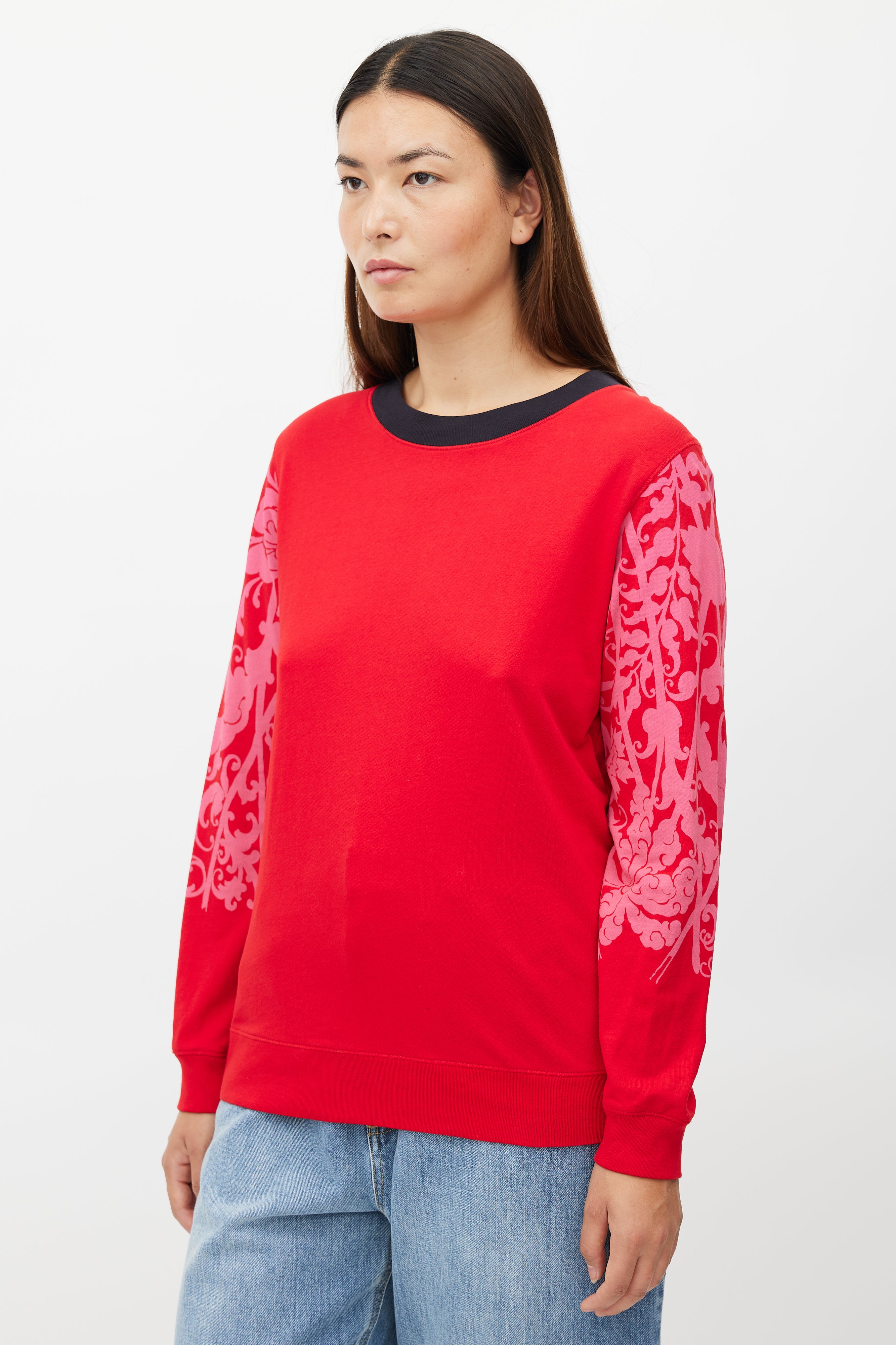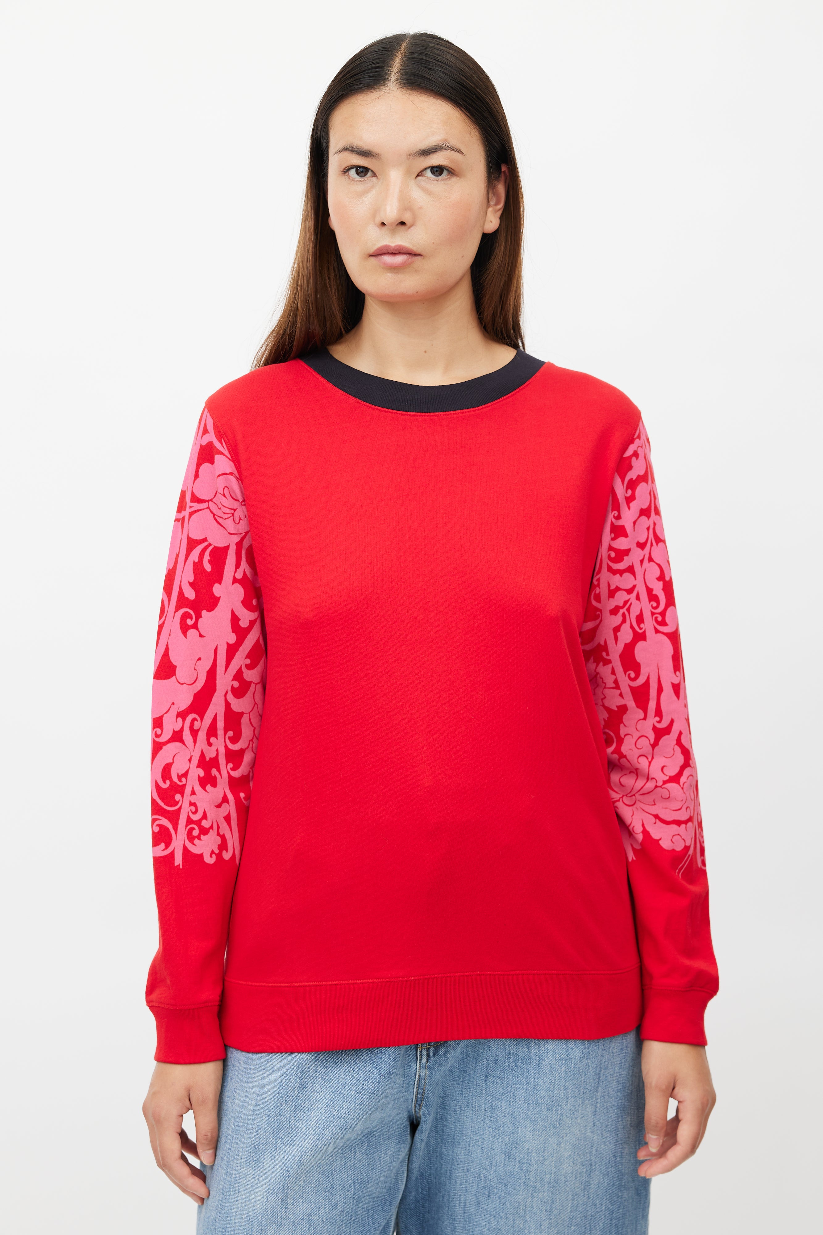 Pre-owned Dries Van Noten red top featuring a crew neckline, long sleeves with pink floral print, and ribbed hem.