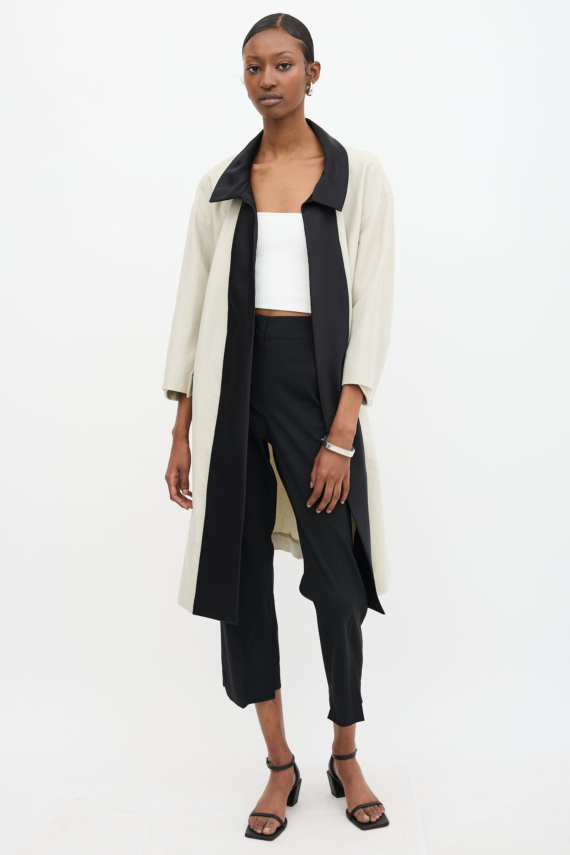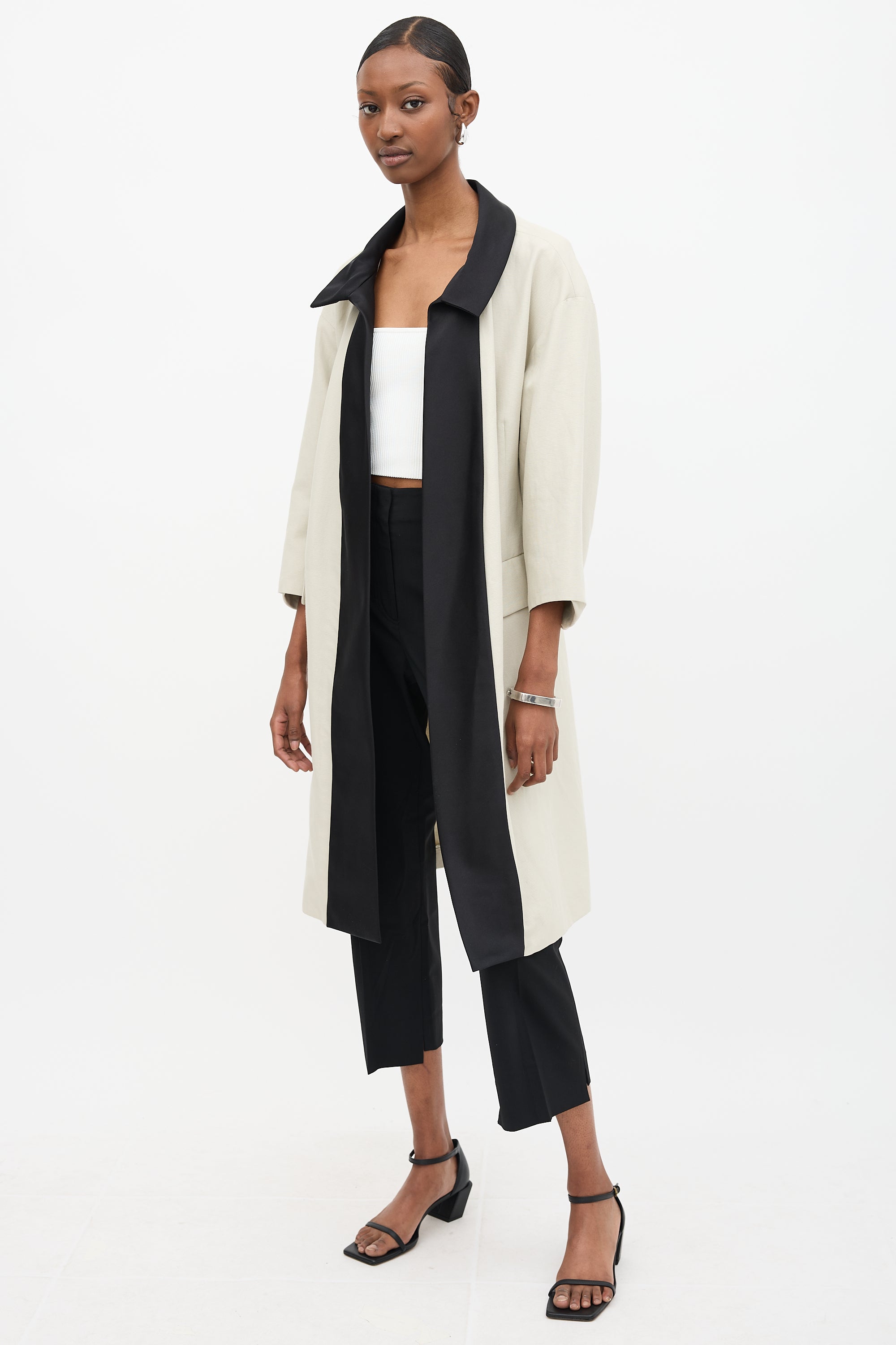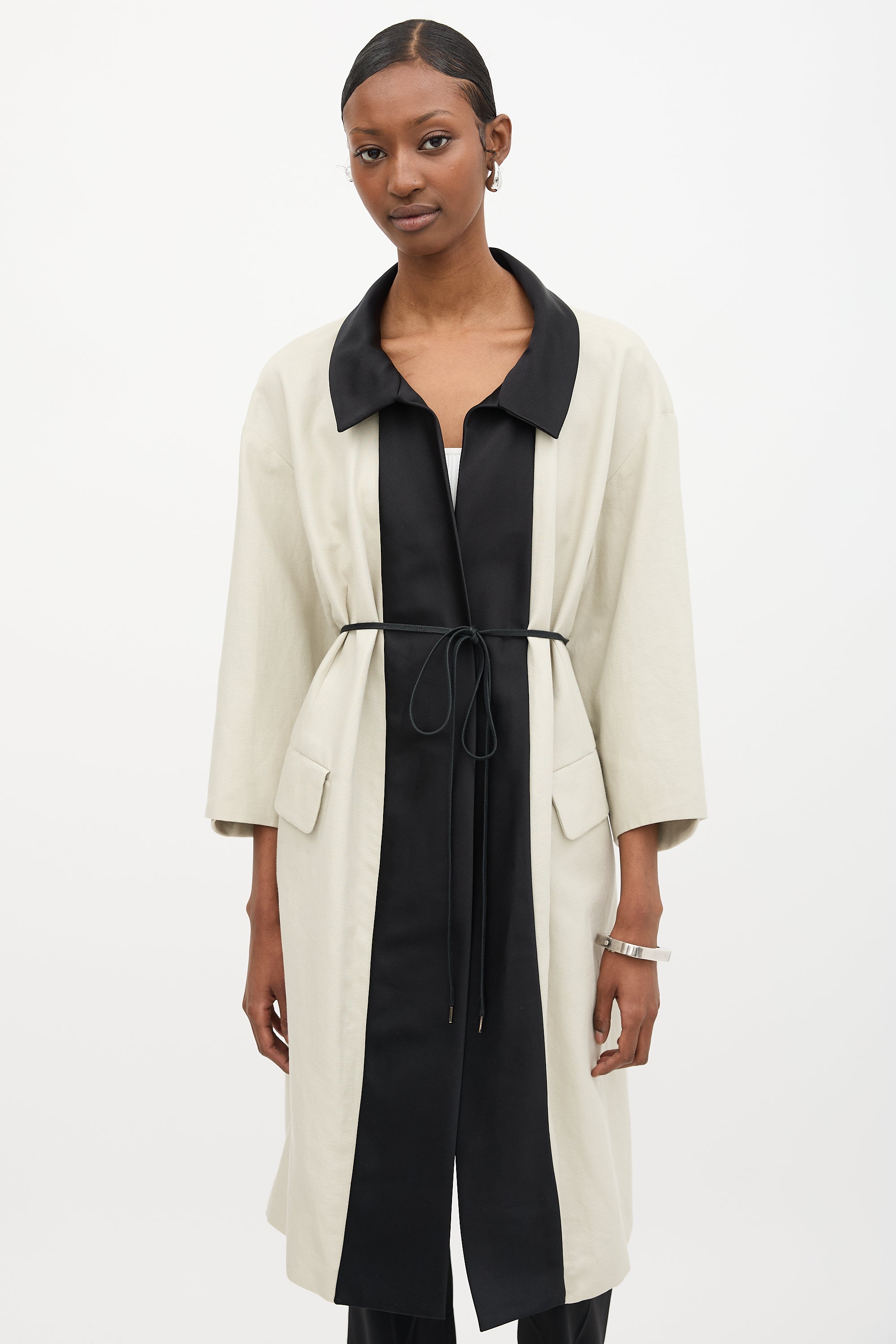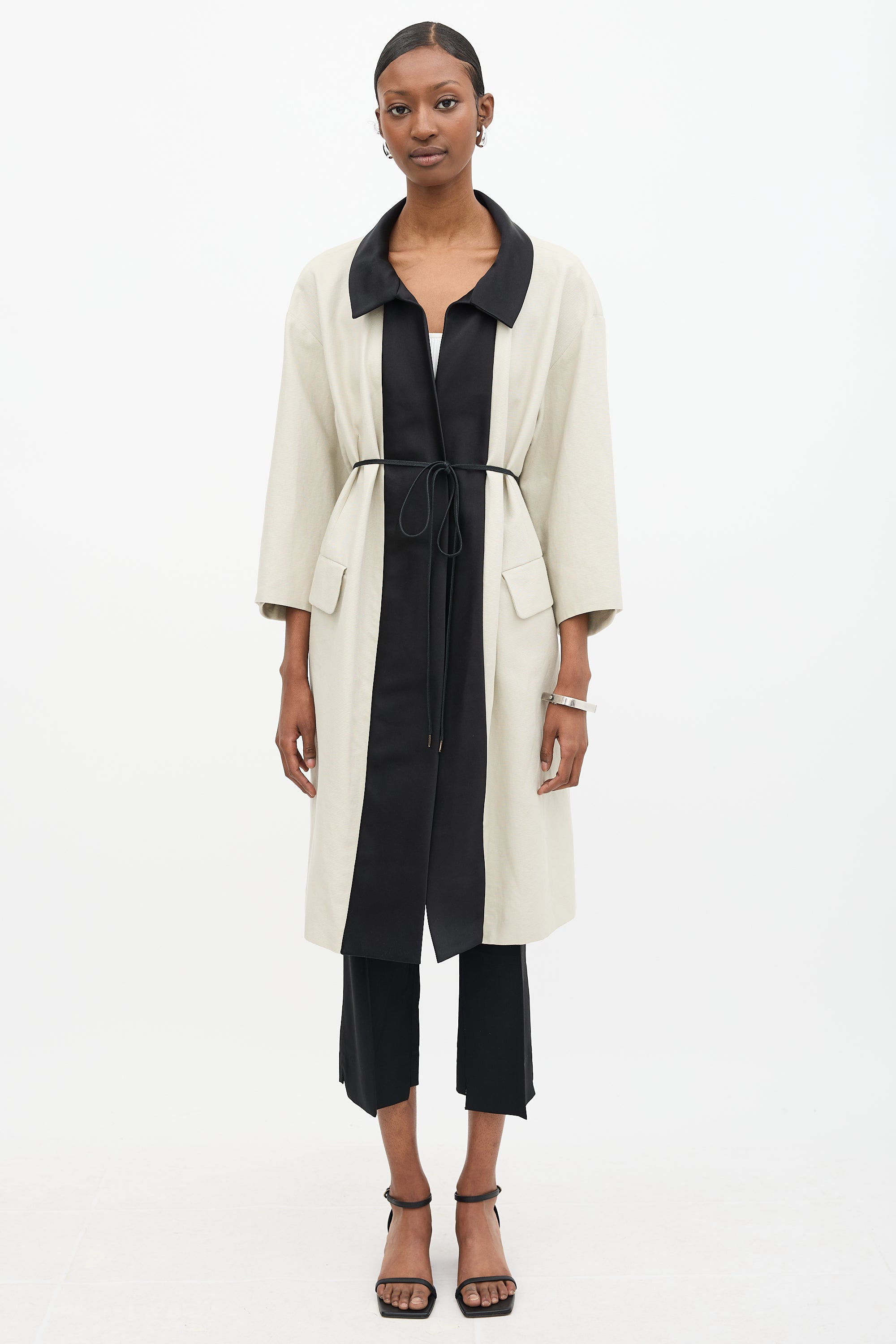 Pre-owned Dries Van Noten beige coat featuring black satin trim, spread collar, open front, dropped shoulders, front shoestring tie belt, and two welt pockets. Partially lined.