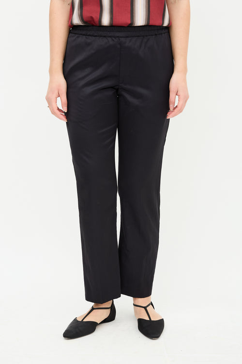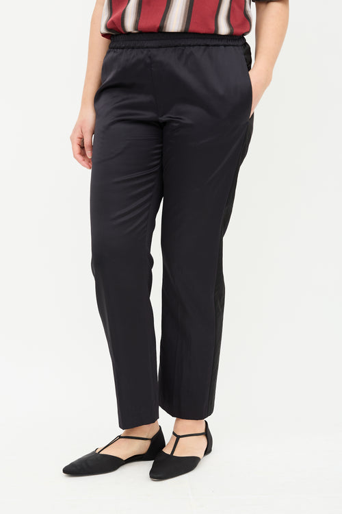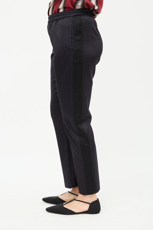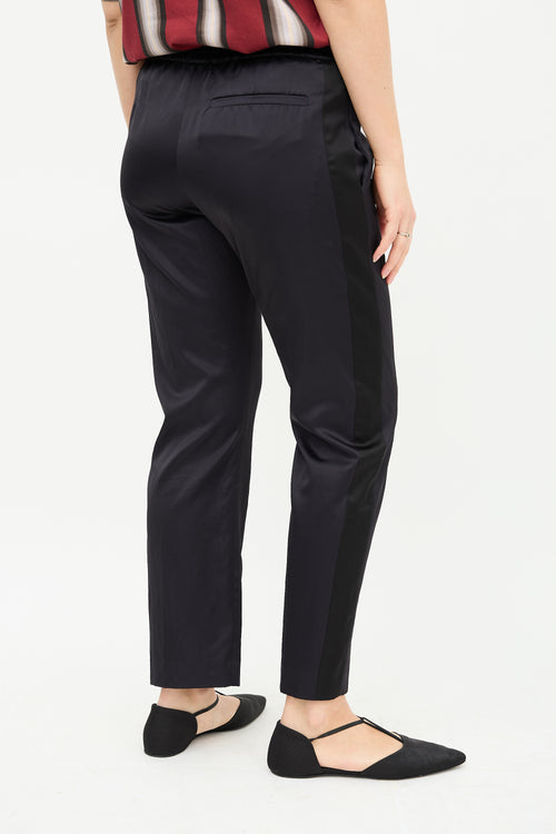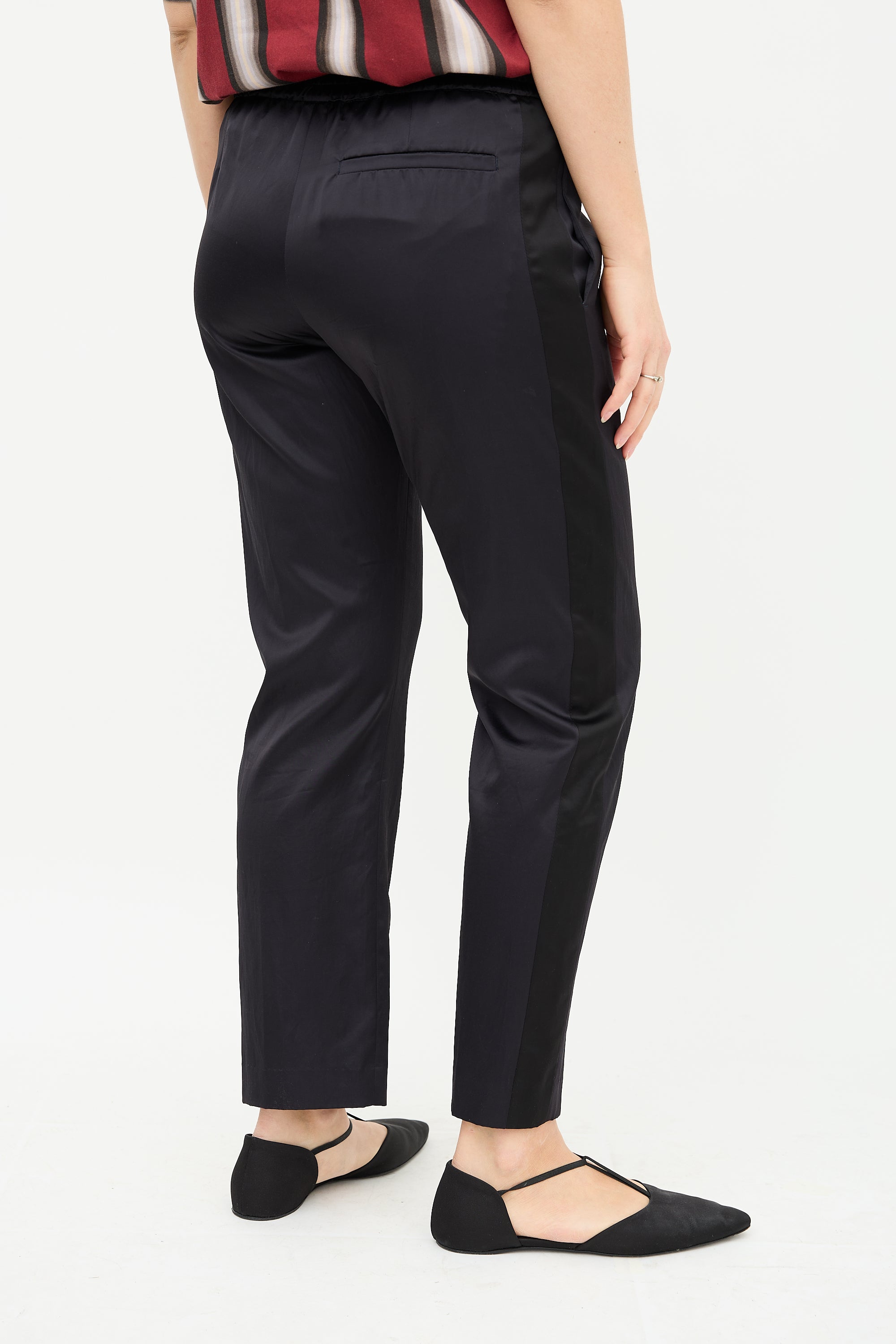 Pre-owned Dries Van Noten navy satin trousers featuring elasticized waist with interior drawstring, straight leg, black tuxedo side stripes, and three pocket styling.