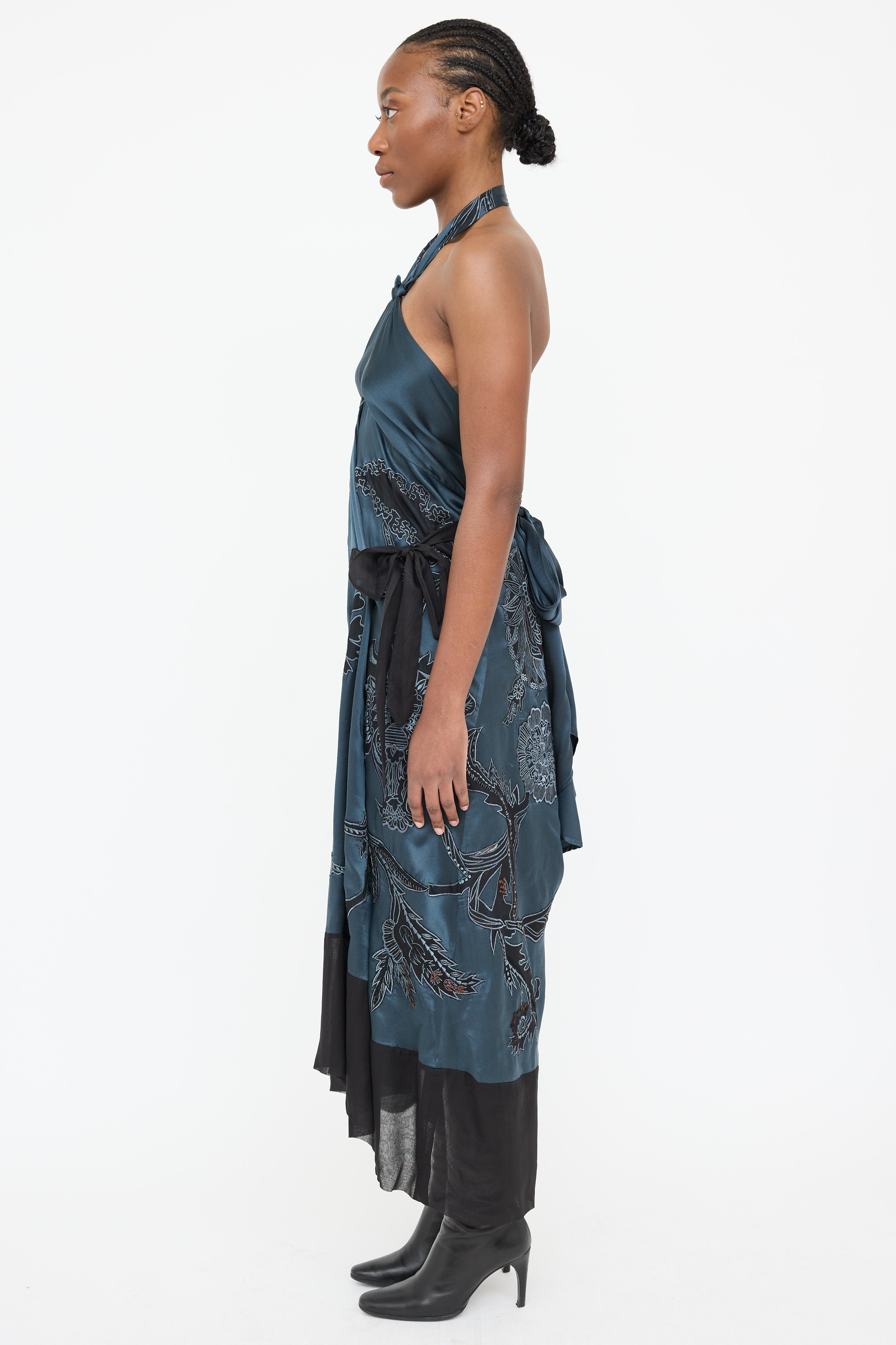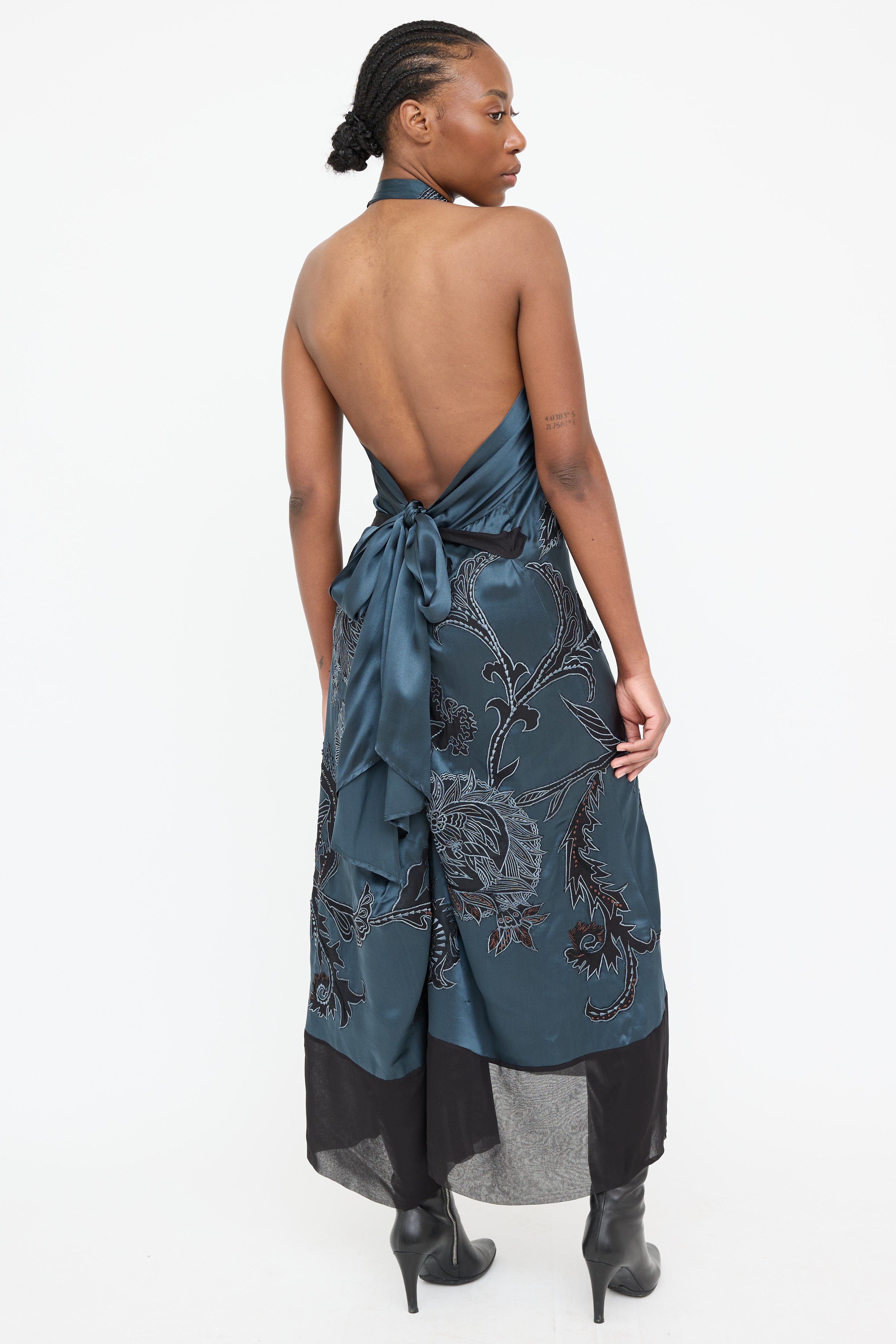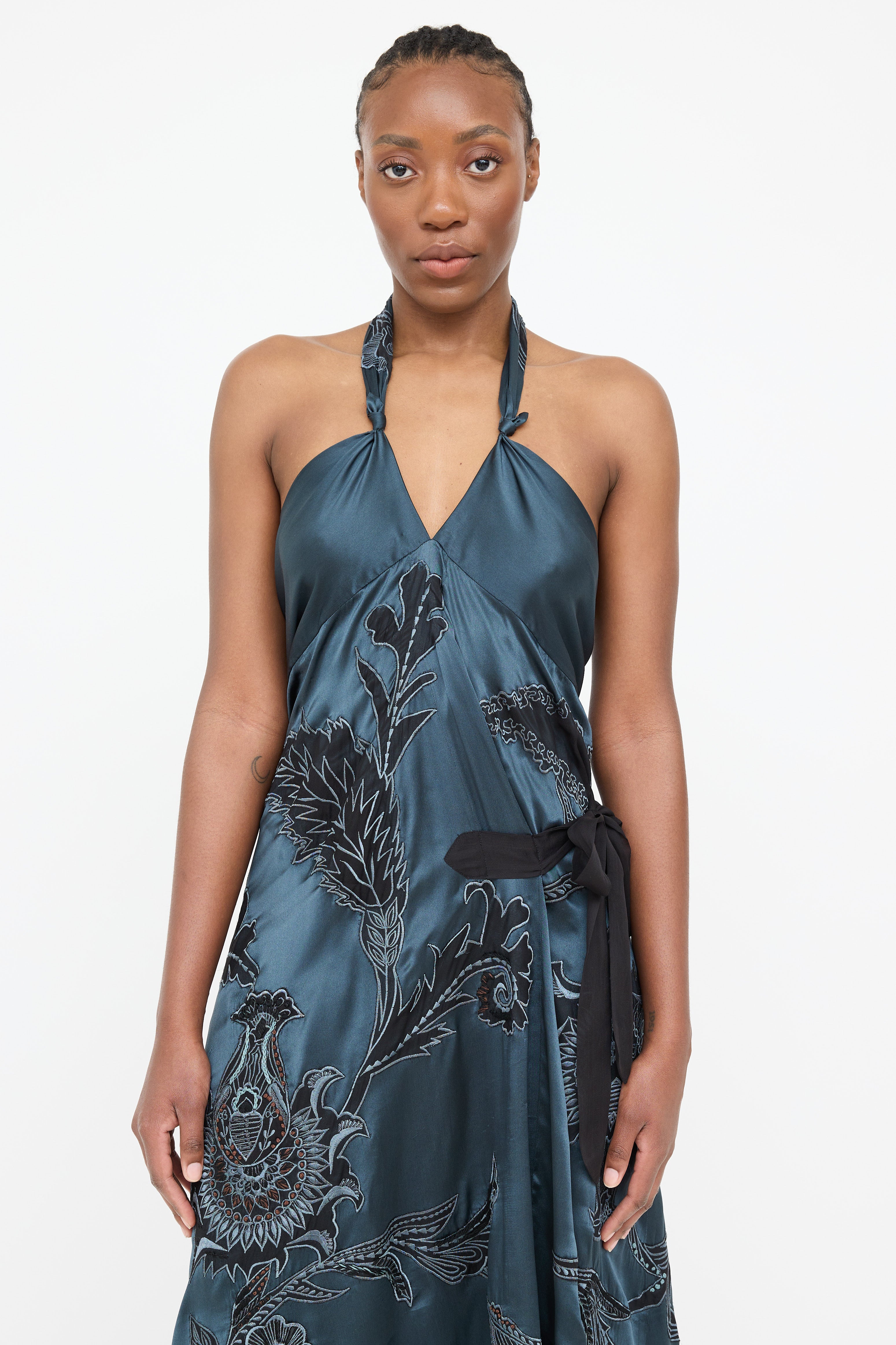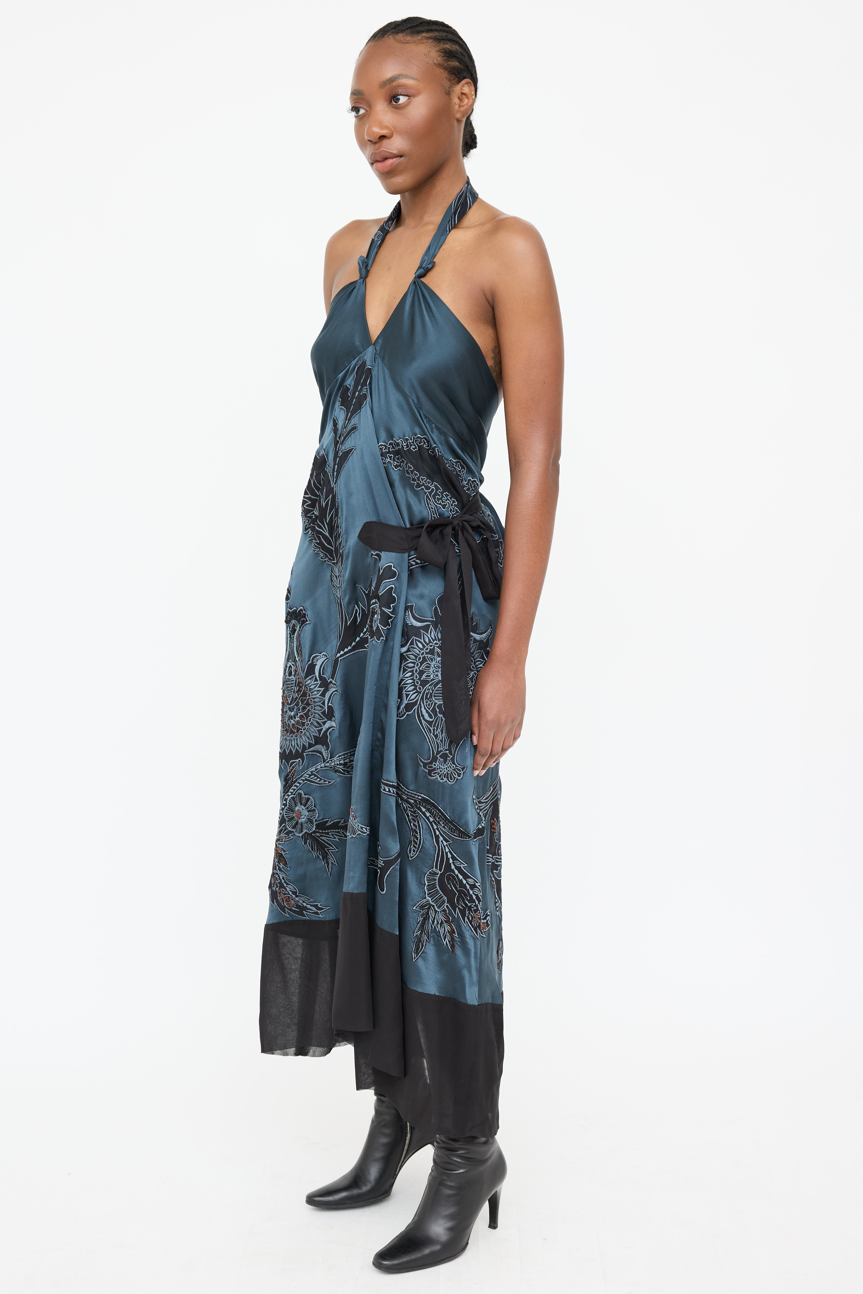 Pre-owned Dries Van Noten navy silk dress featuring floral embroidery throughout, halter neck, tie up detail at waist, black sheer panel at hem and low back with tie.