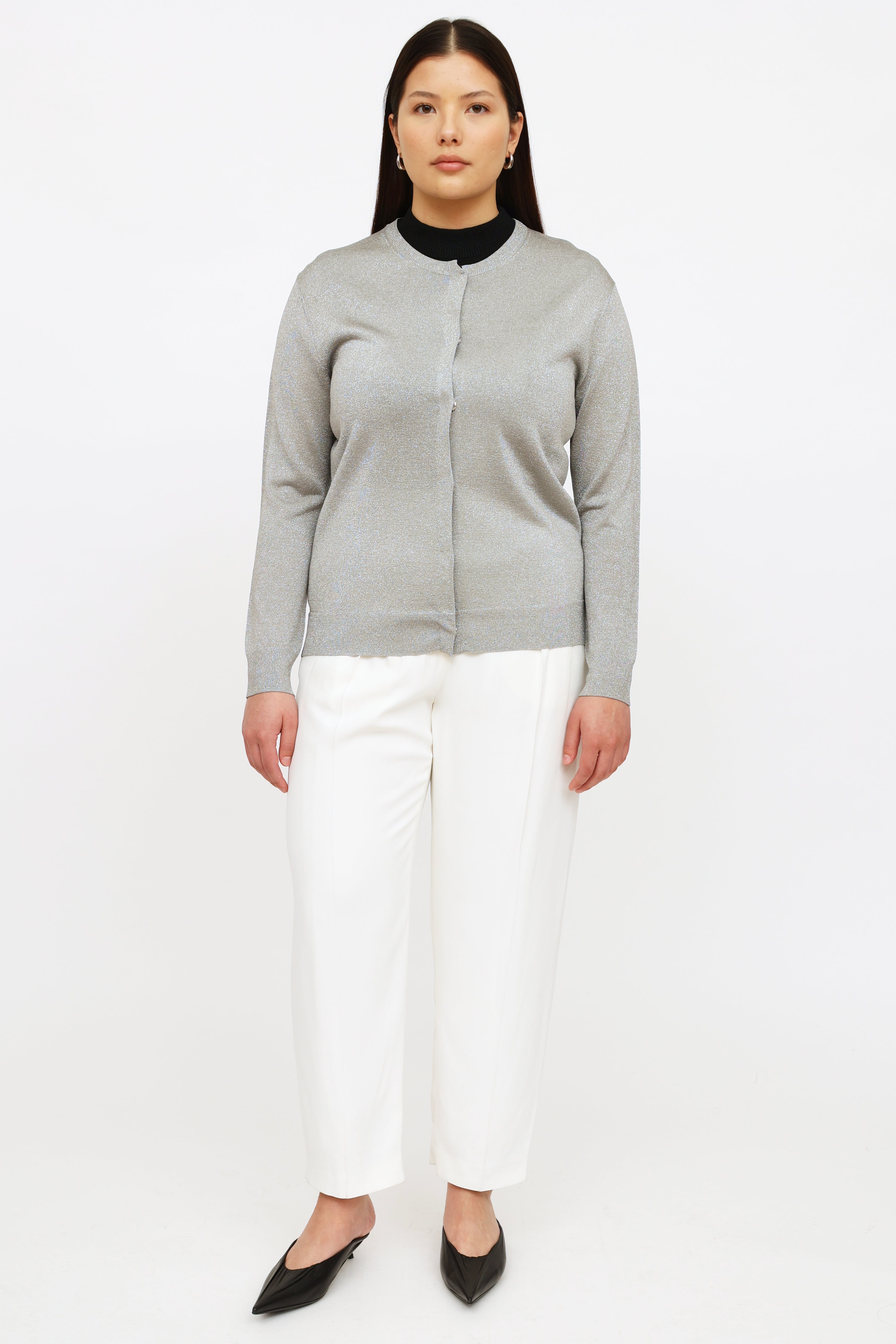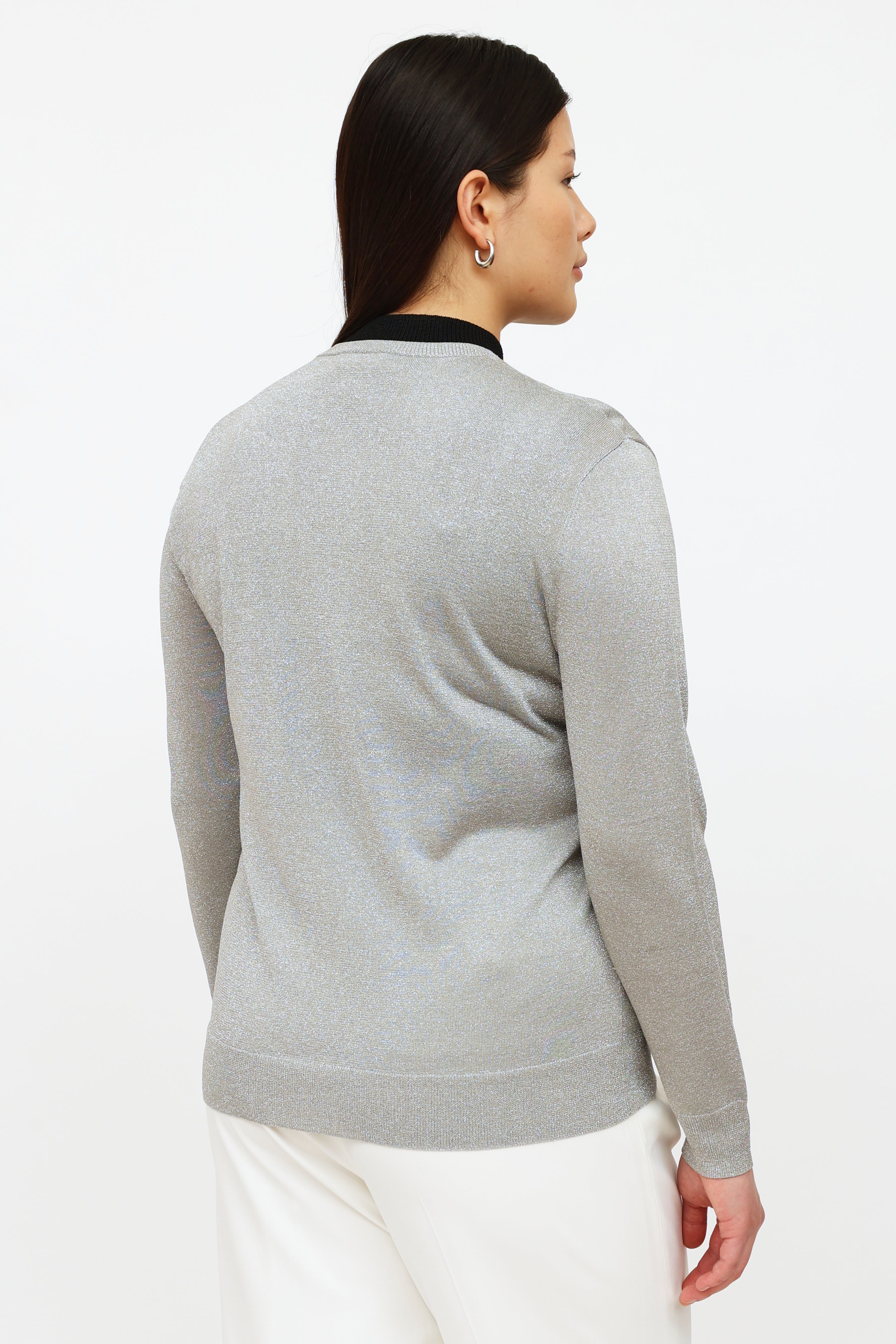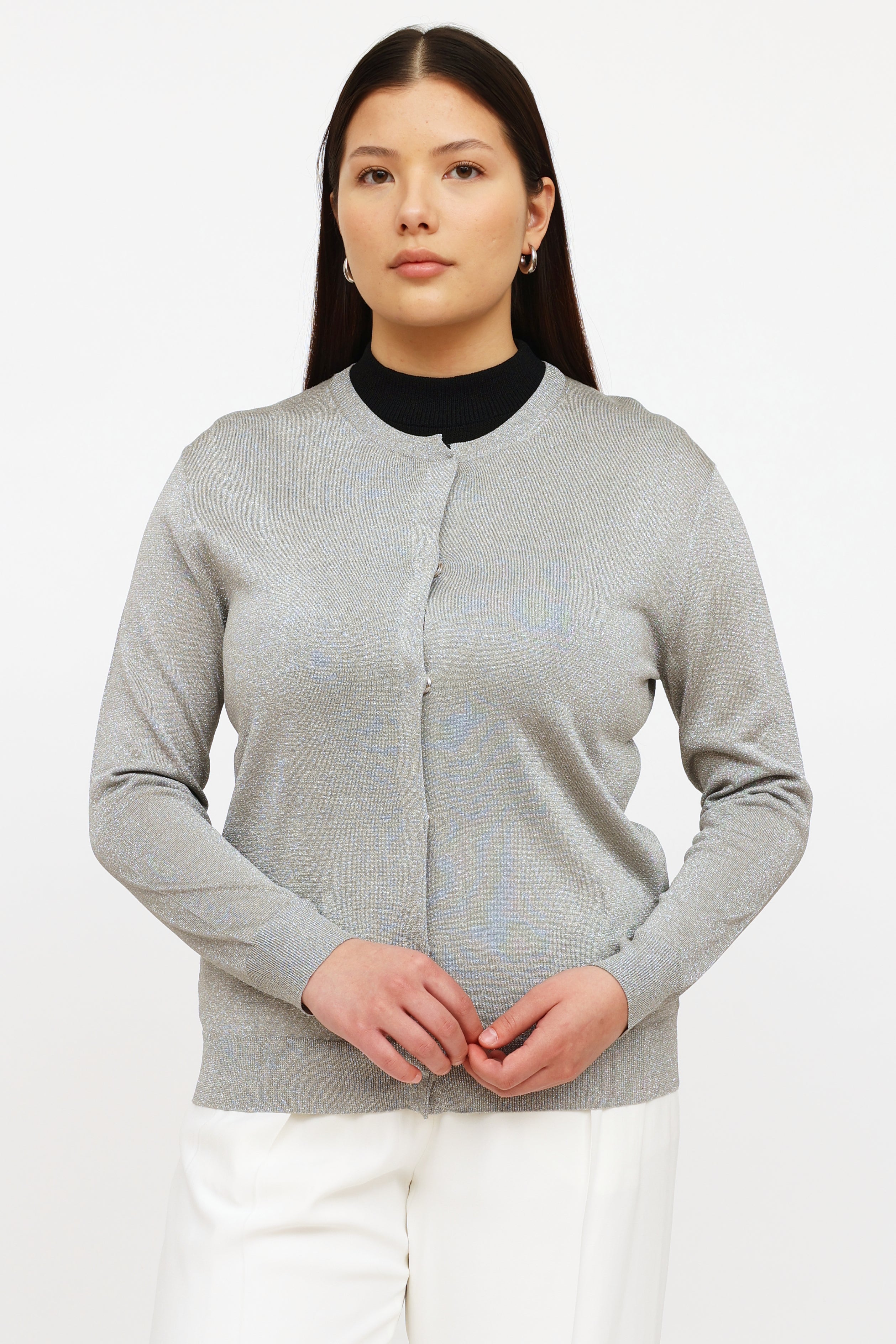 Pre-owned Dries Van Noten silver sparkle long sleeve cardigan featuring metallic thread throughout, rounded neckline, snap button closure at front and rib knit detailing.
