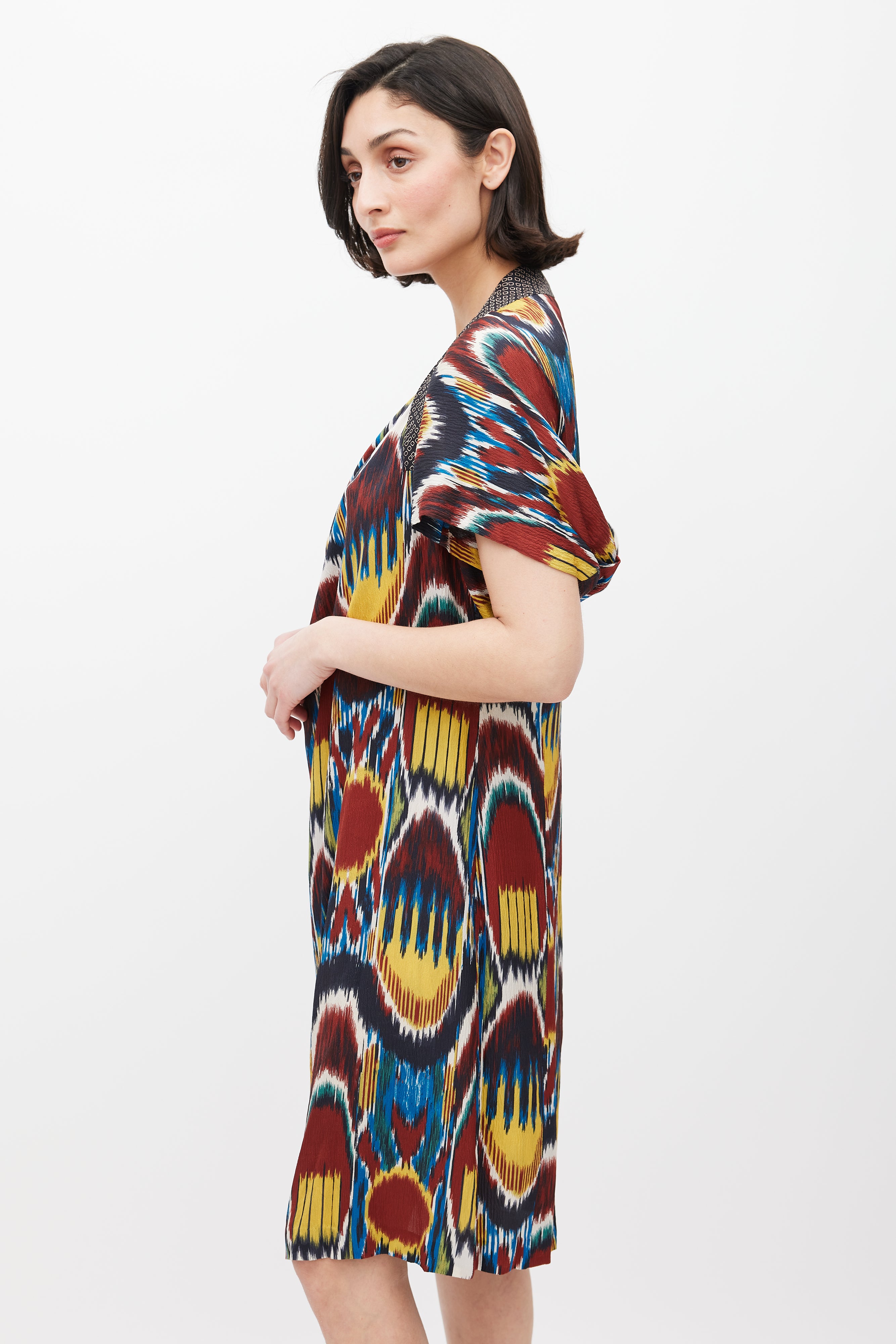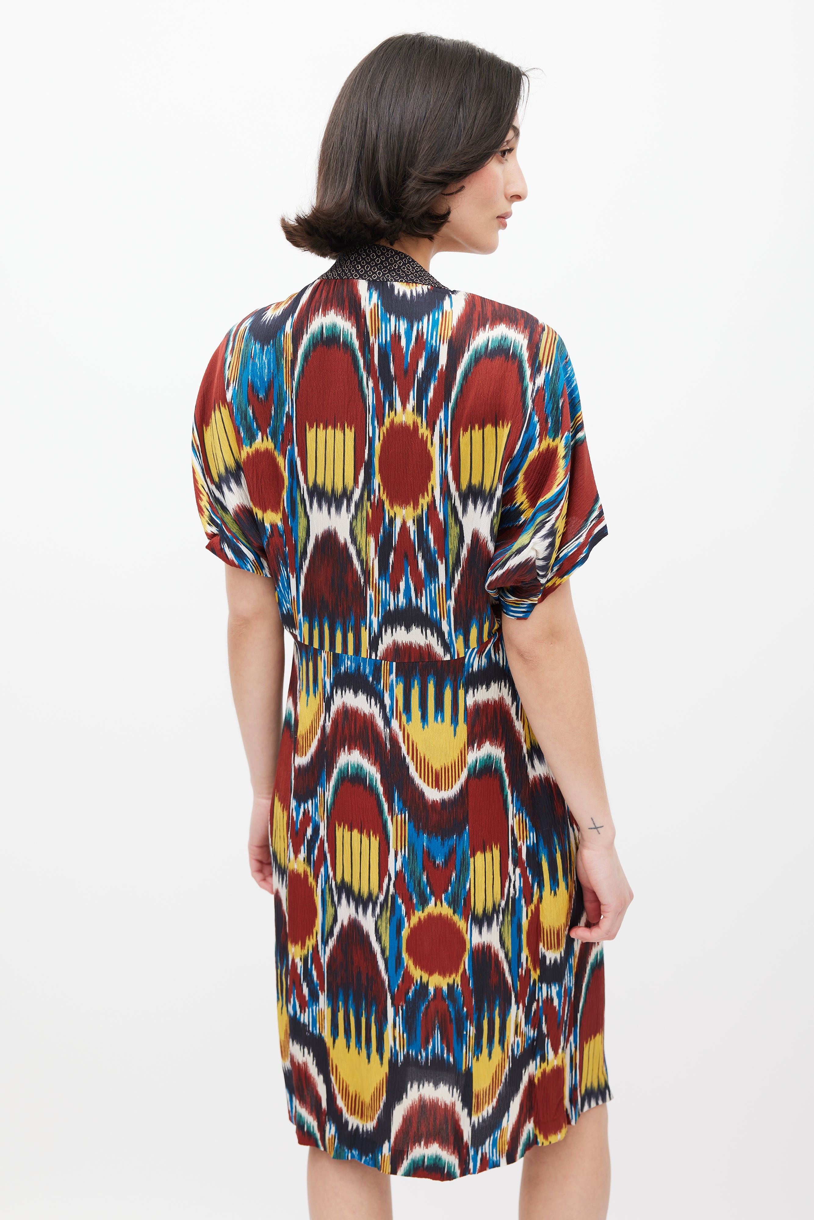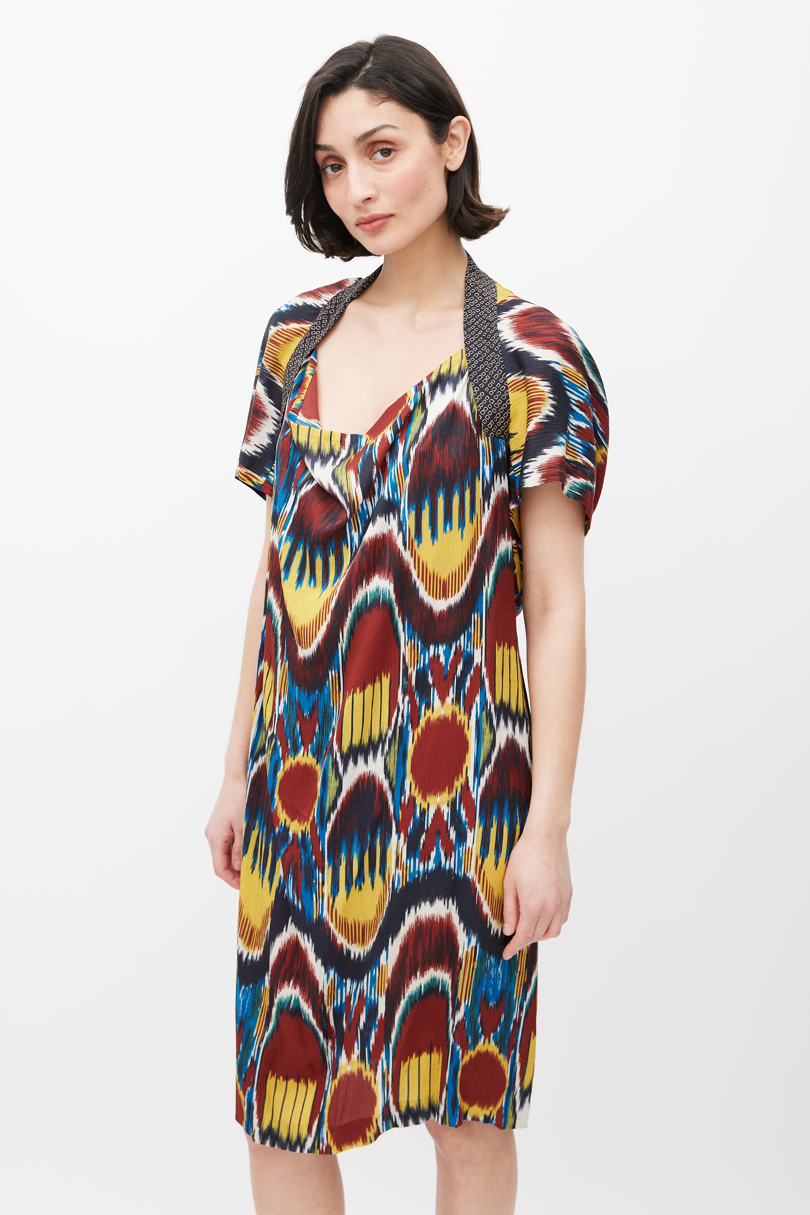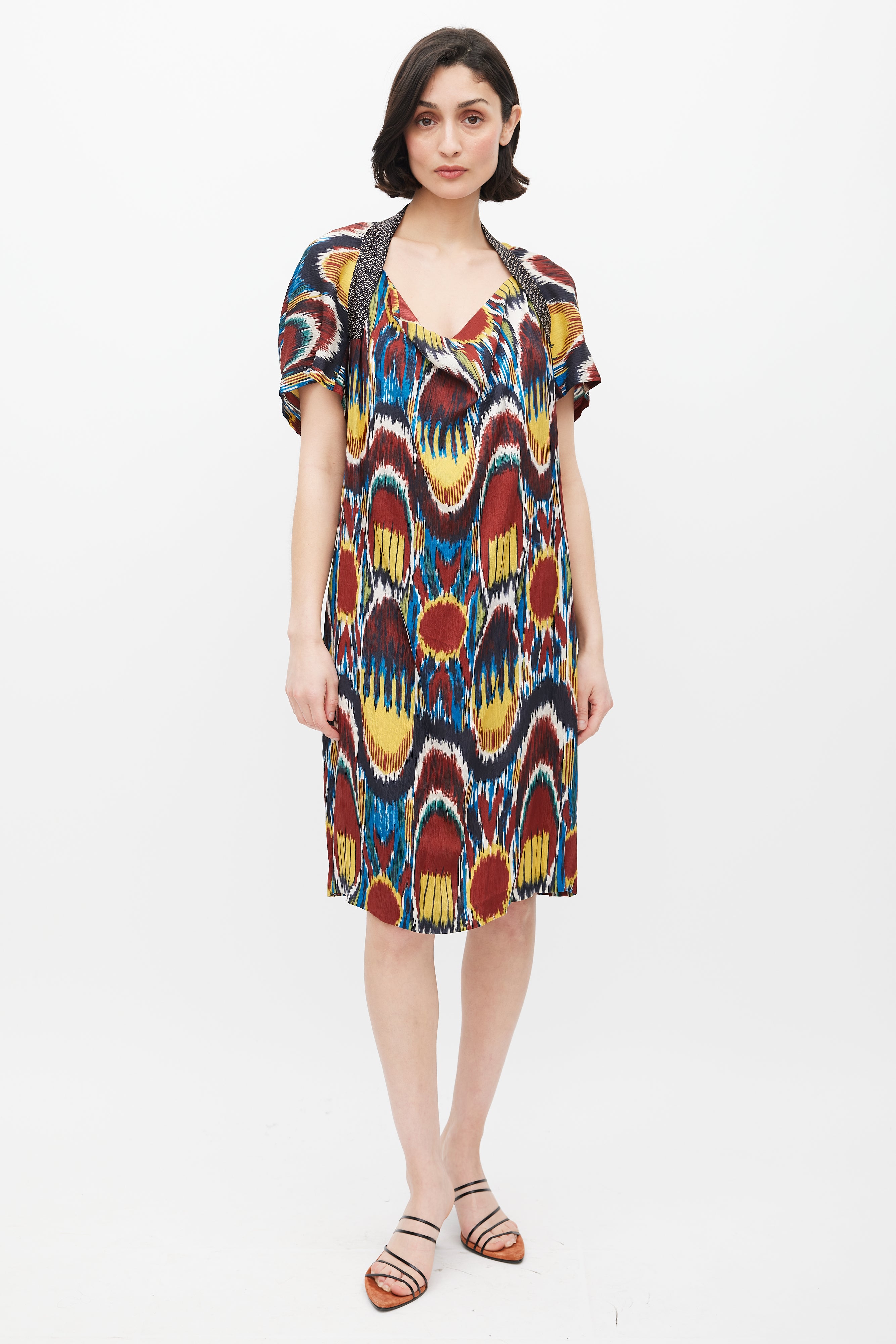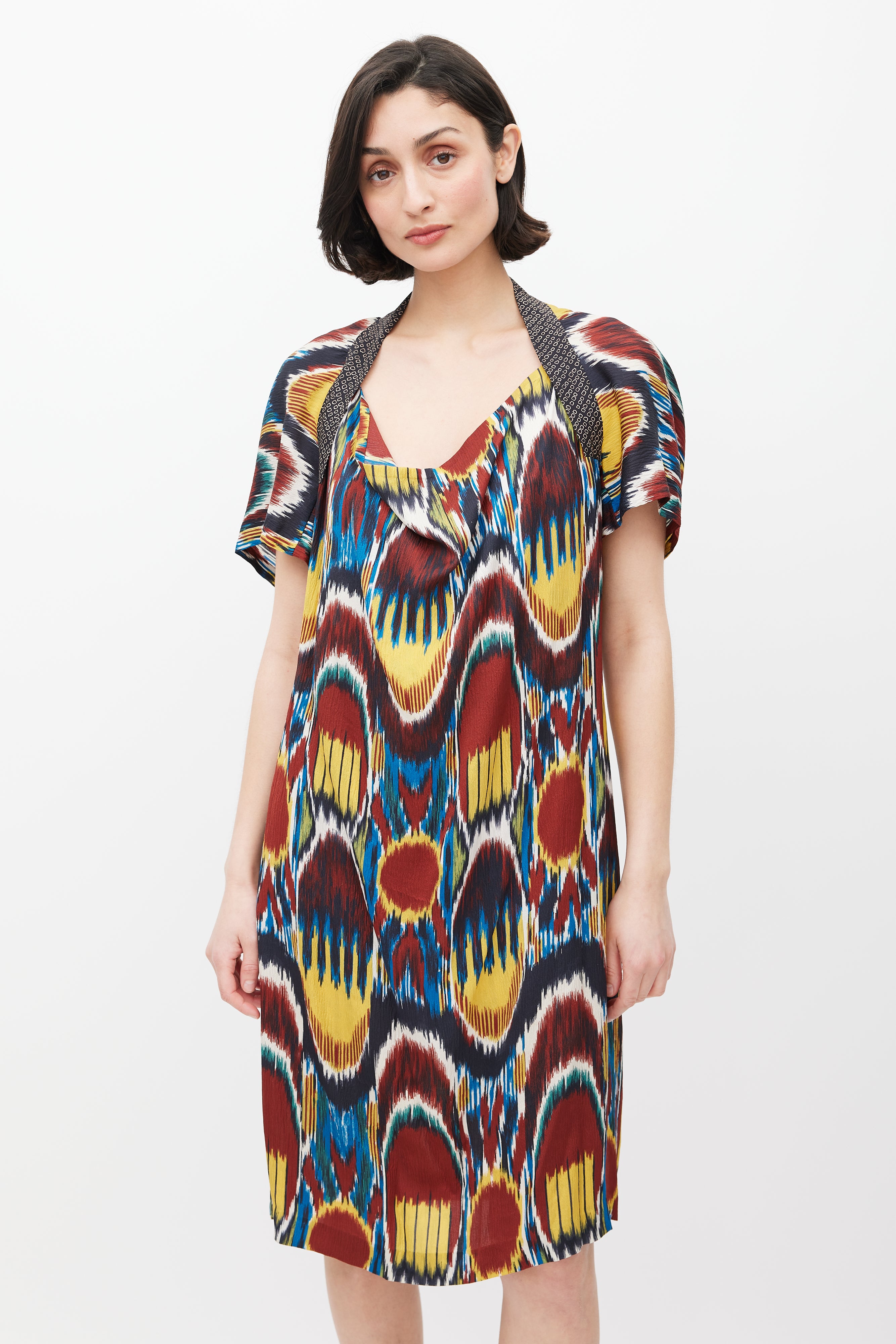 Pre-owned Dries Van Noten Spring/Summer 2010 silk midi dress featuring a multicolour print throughout, cowl neckline with dot printed contrast trim, and short sleeves.
