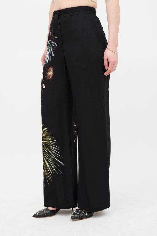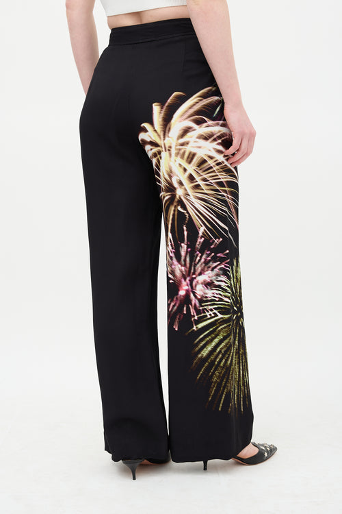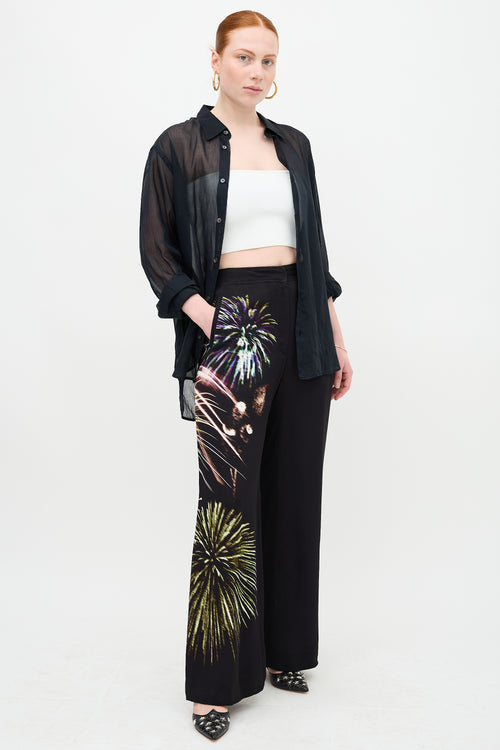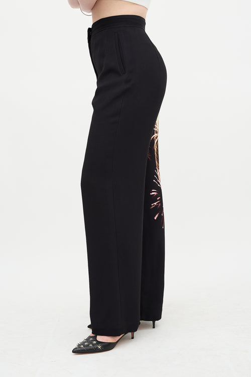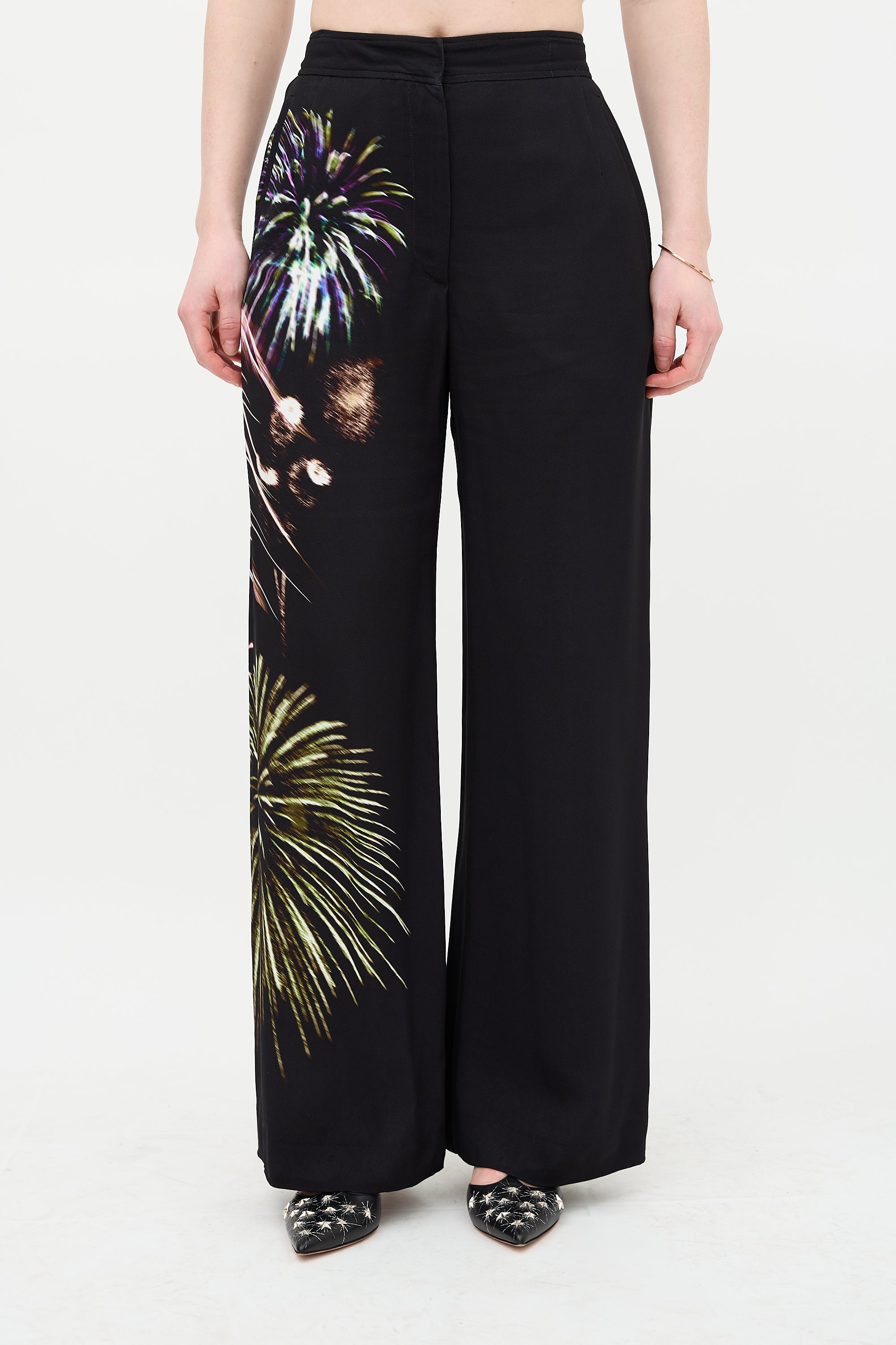 Pre-owned Dries Van Noten black wide leg Pantery trousers featuring high waist, zip fly, two front pockets, and firework design at right leg.