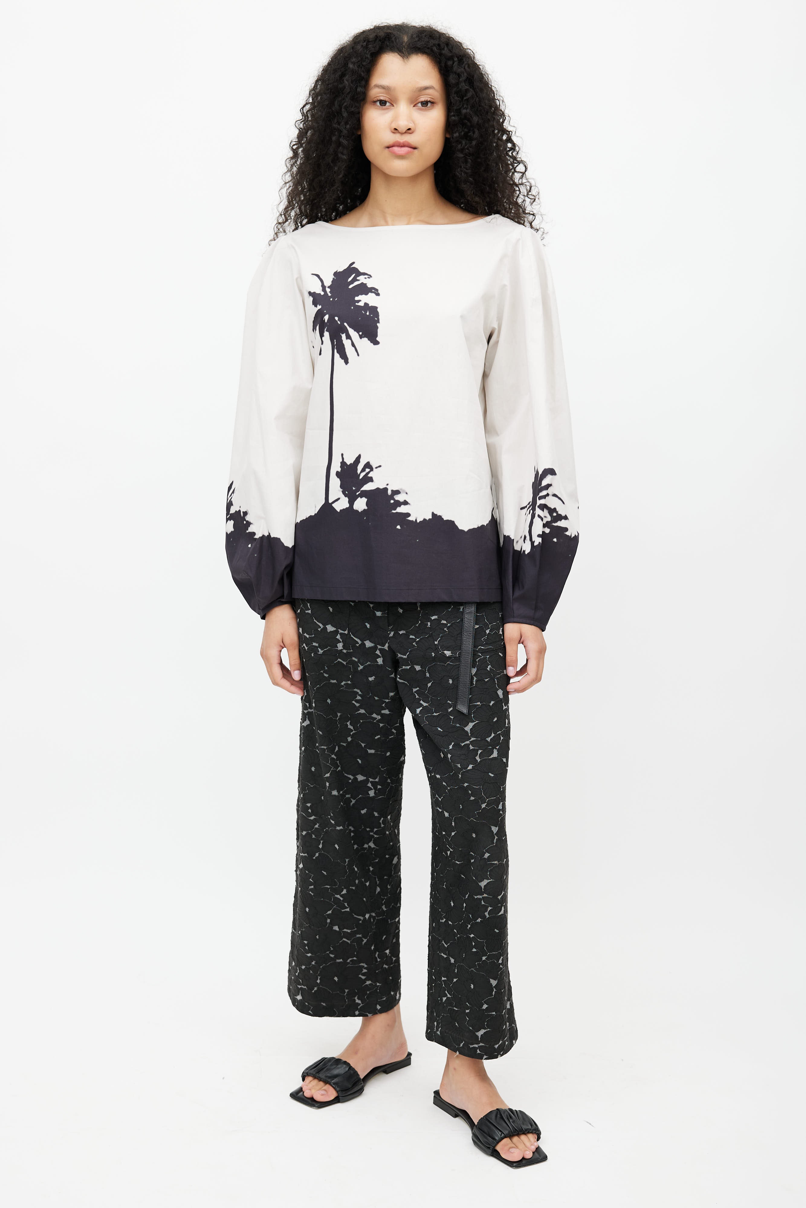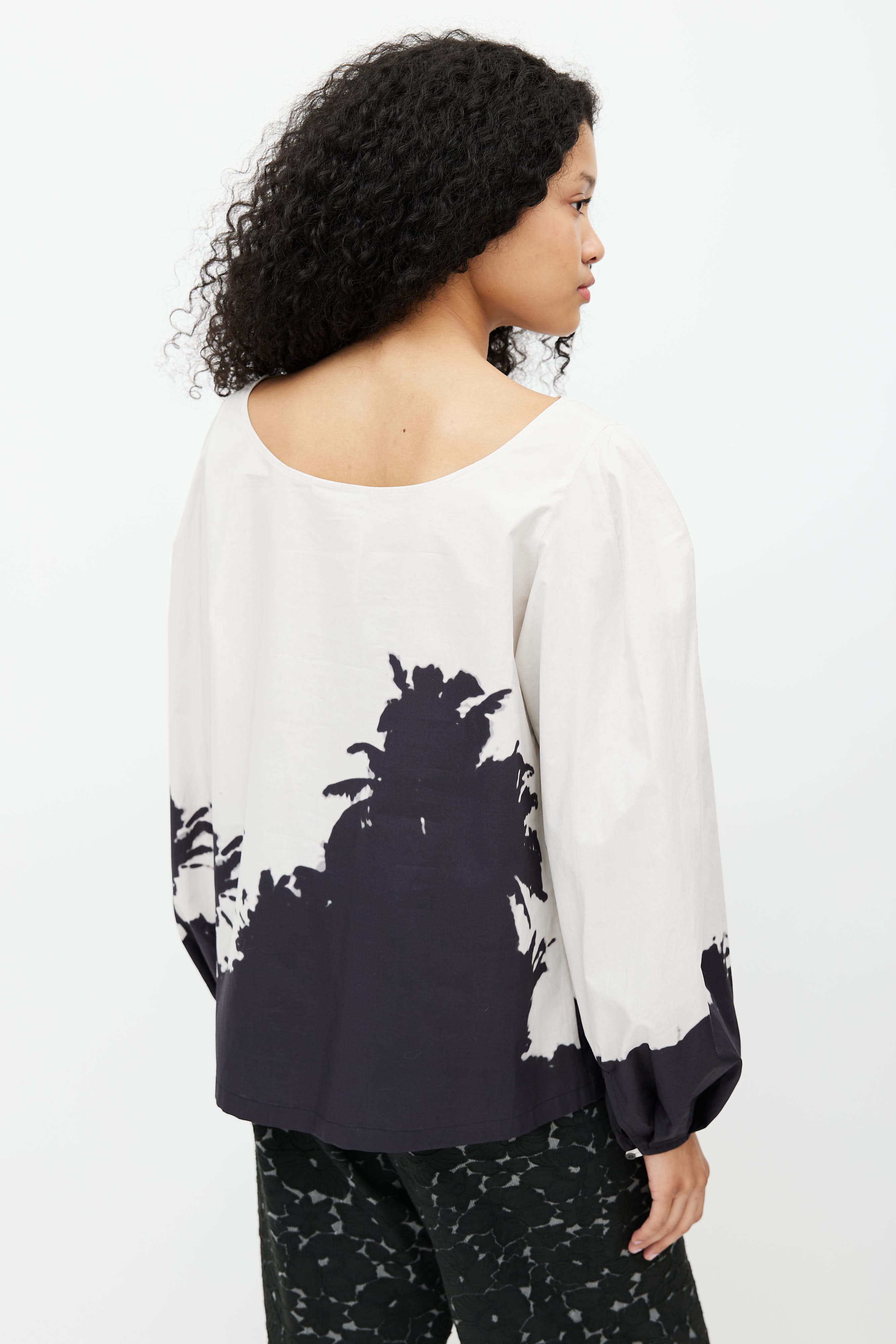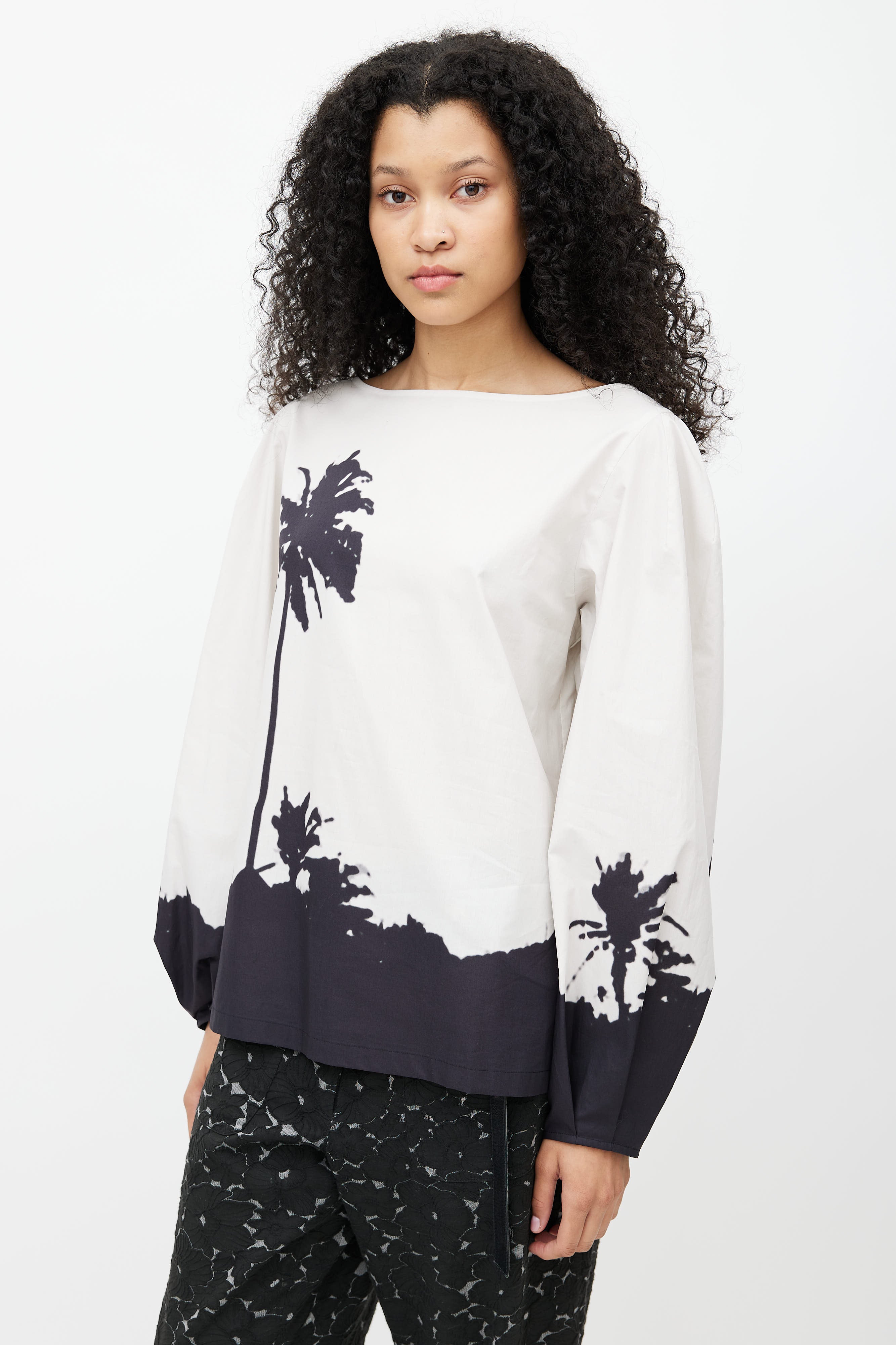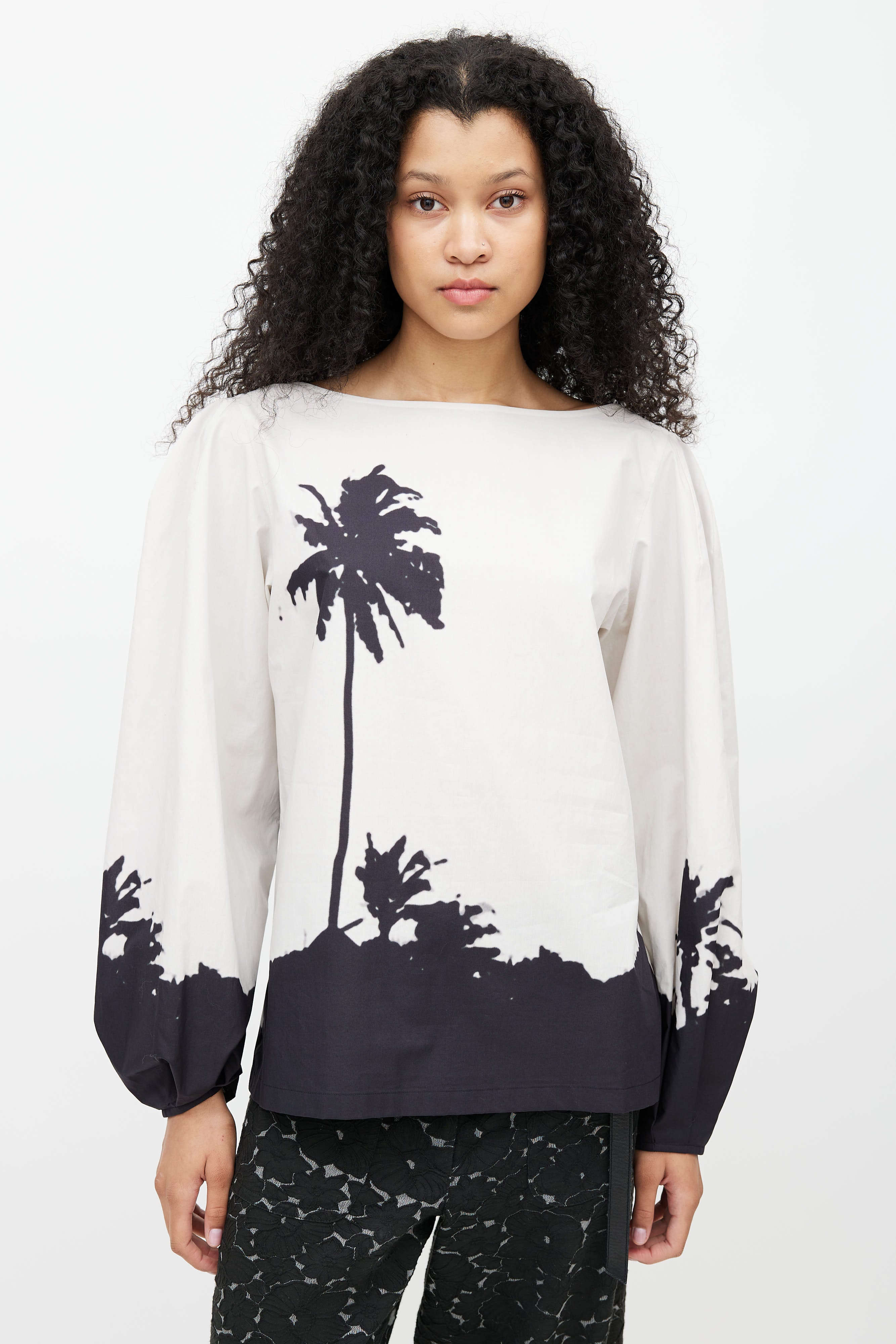 Pre-owned SS 2021 Dries Van Noten x Len Lye grey blouse featuring black palm tree print, boat neckline, and bishop sleeves.