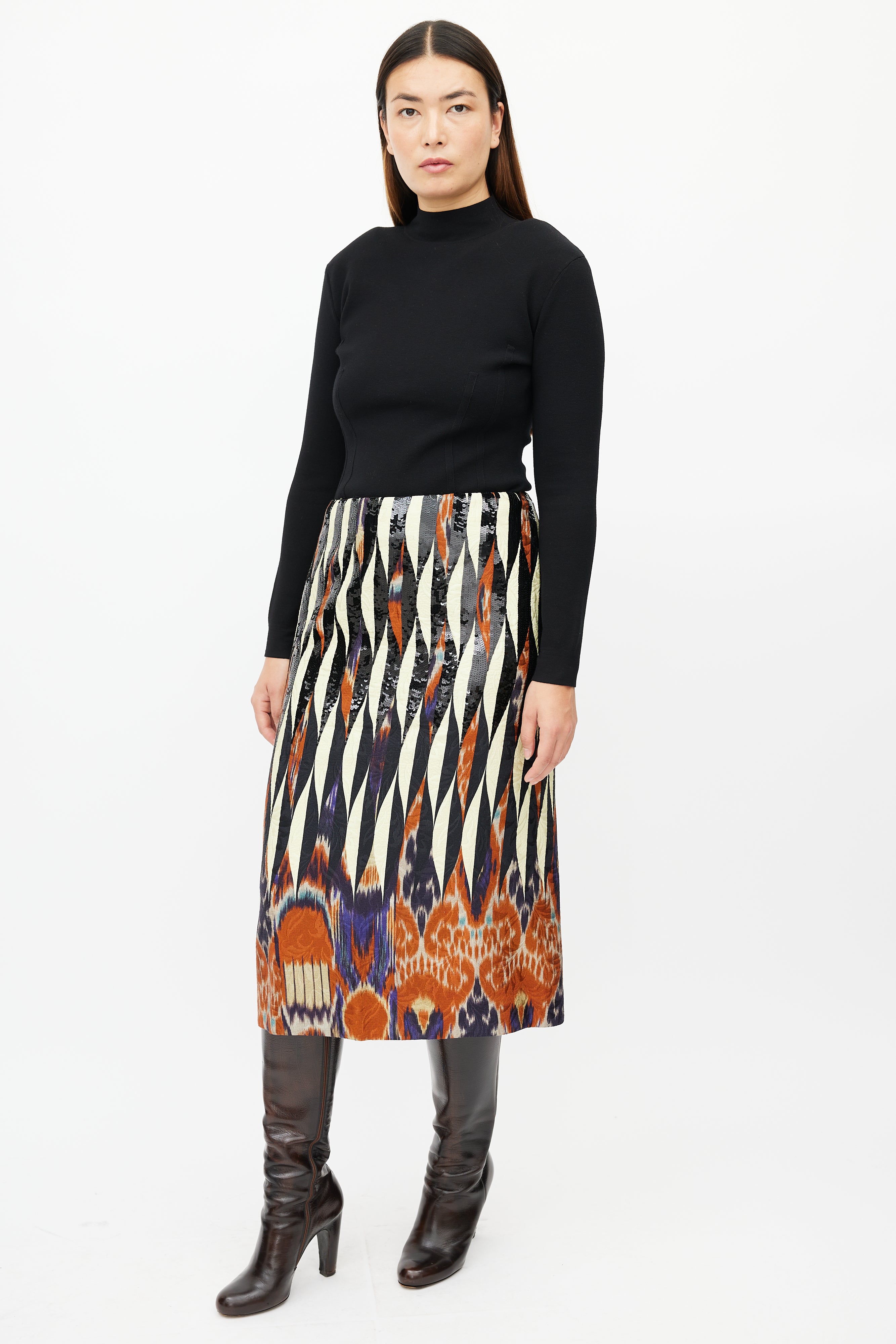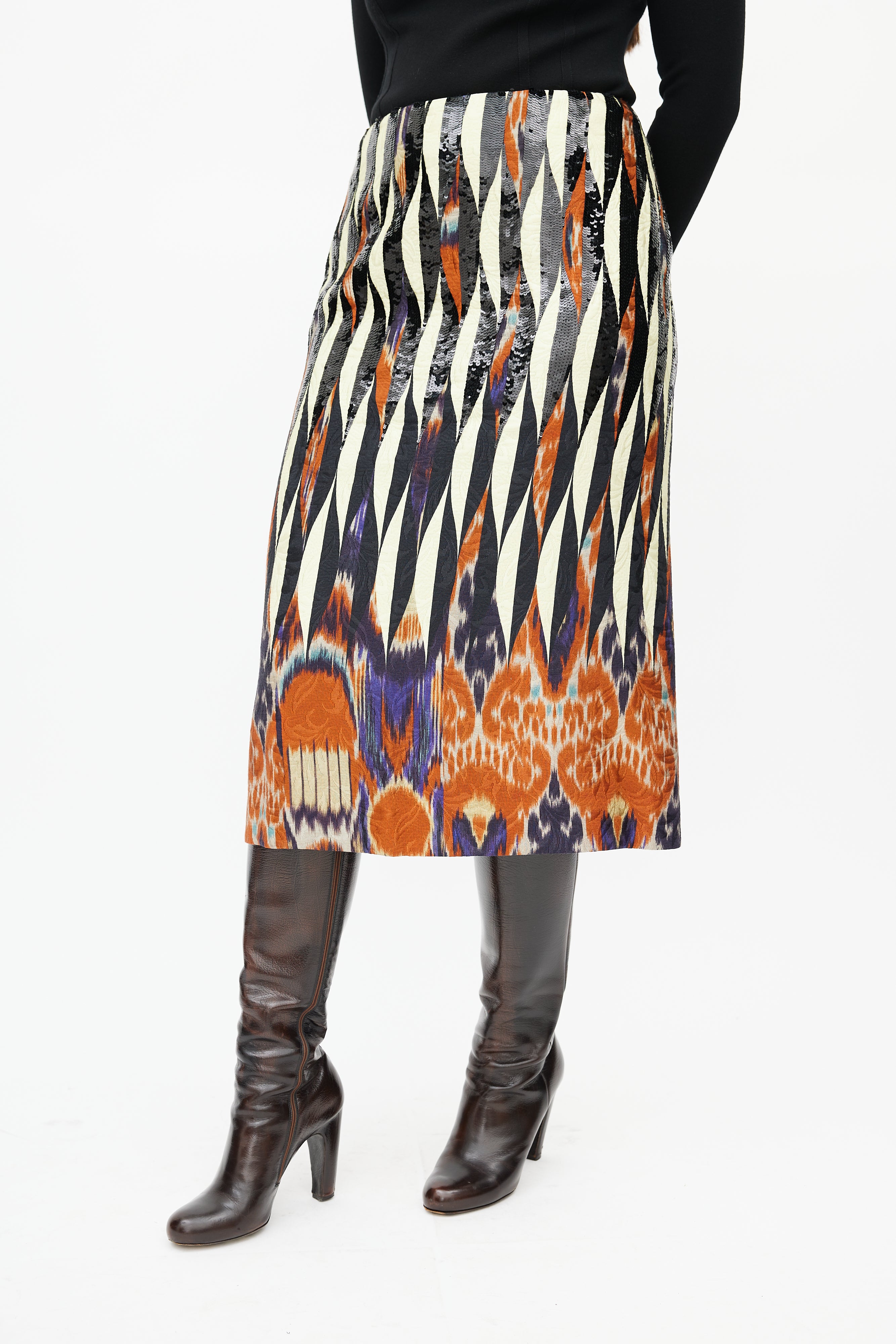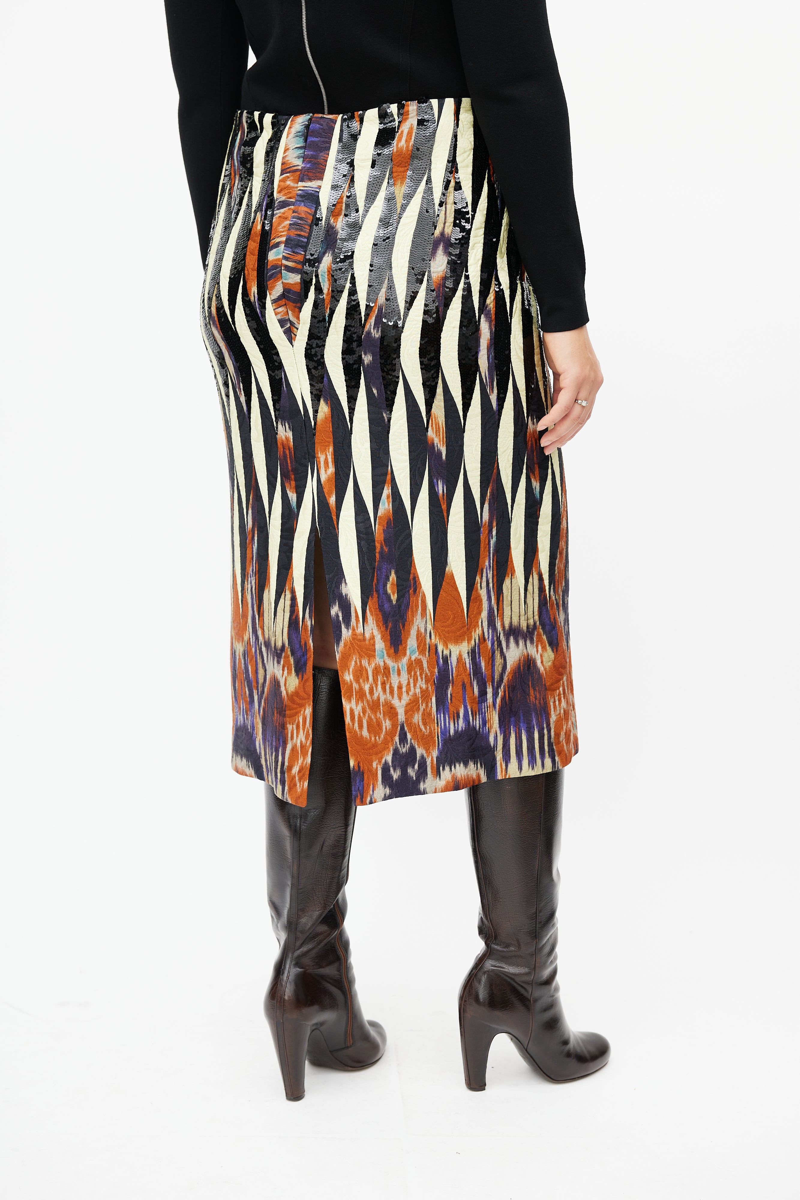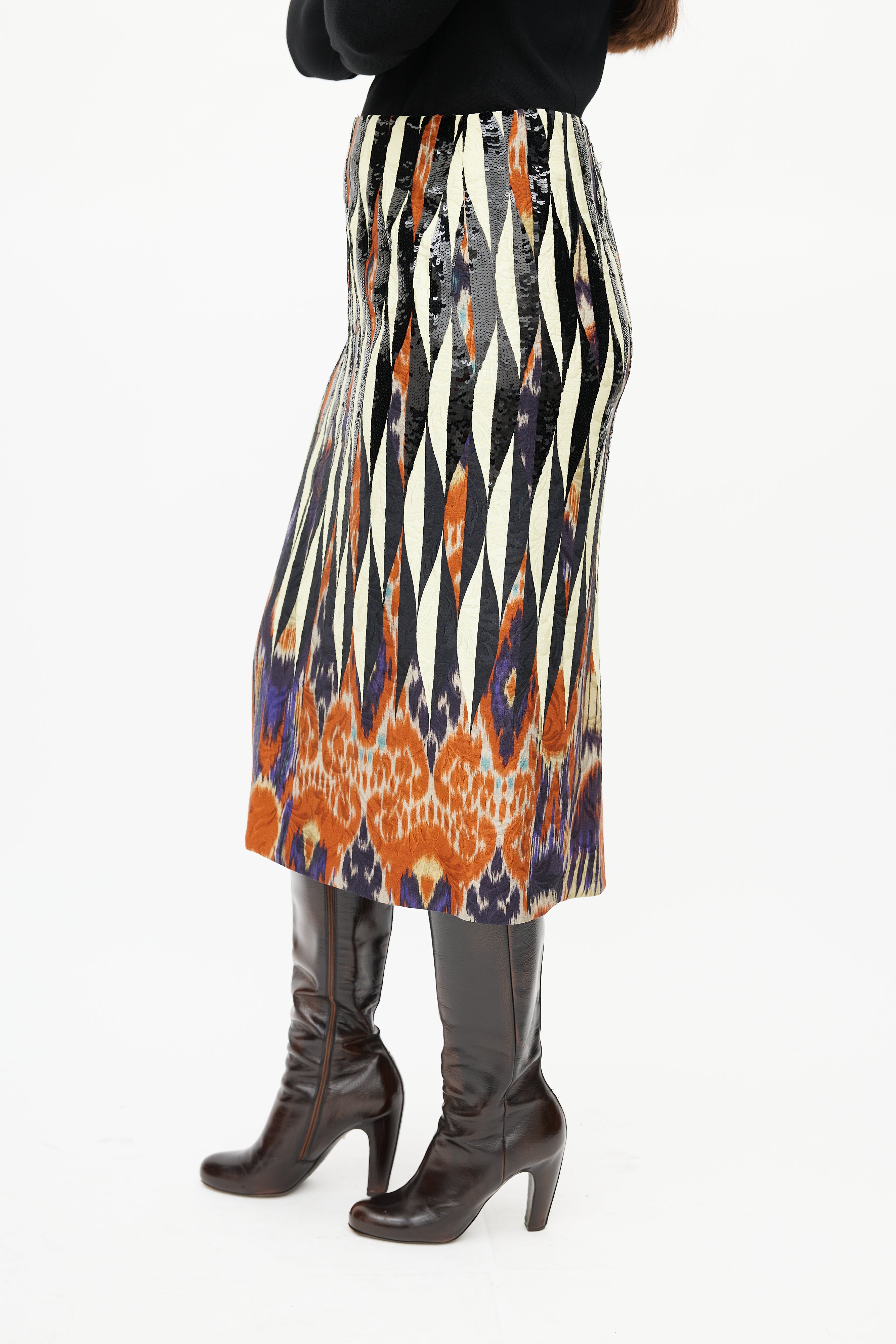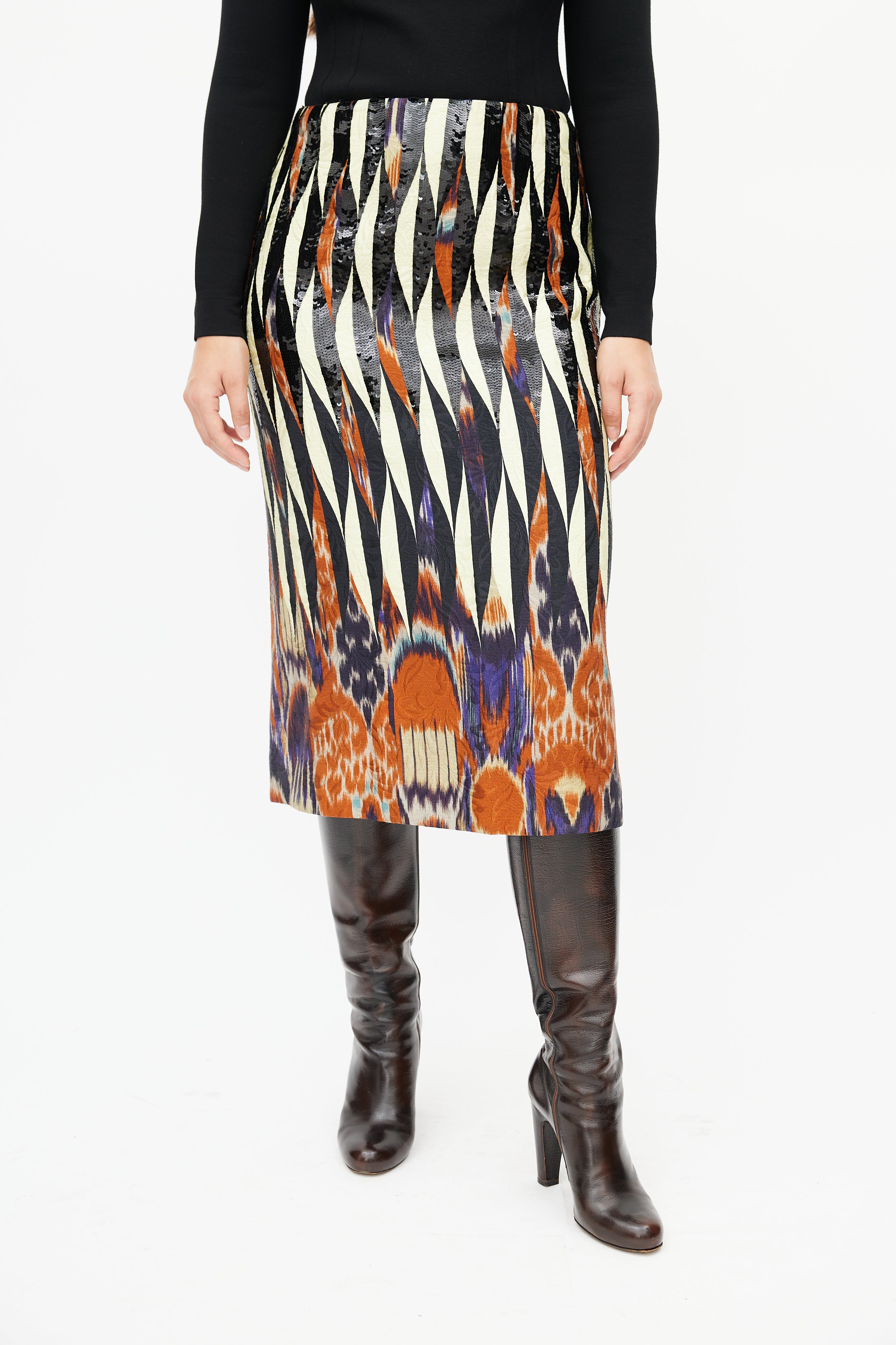 Pre-owned Dries Van Noten yellow skirt featuring a multicolour pattern throughout, sequin detailing, slit at hem, and zip at back with hook and eye closure. Lined. Clipped to fit model.
