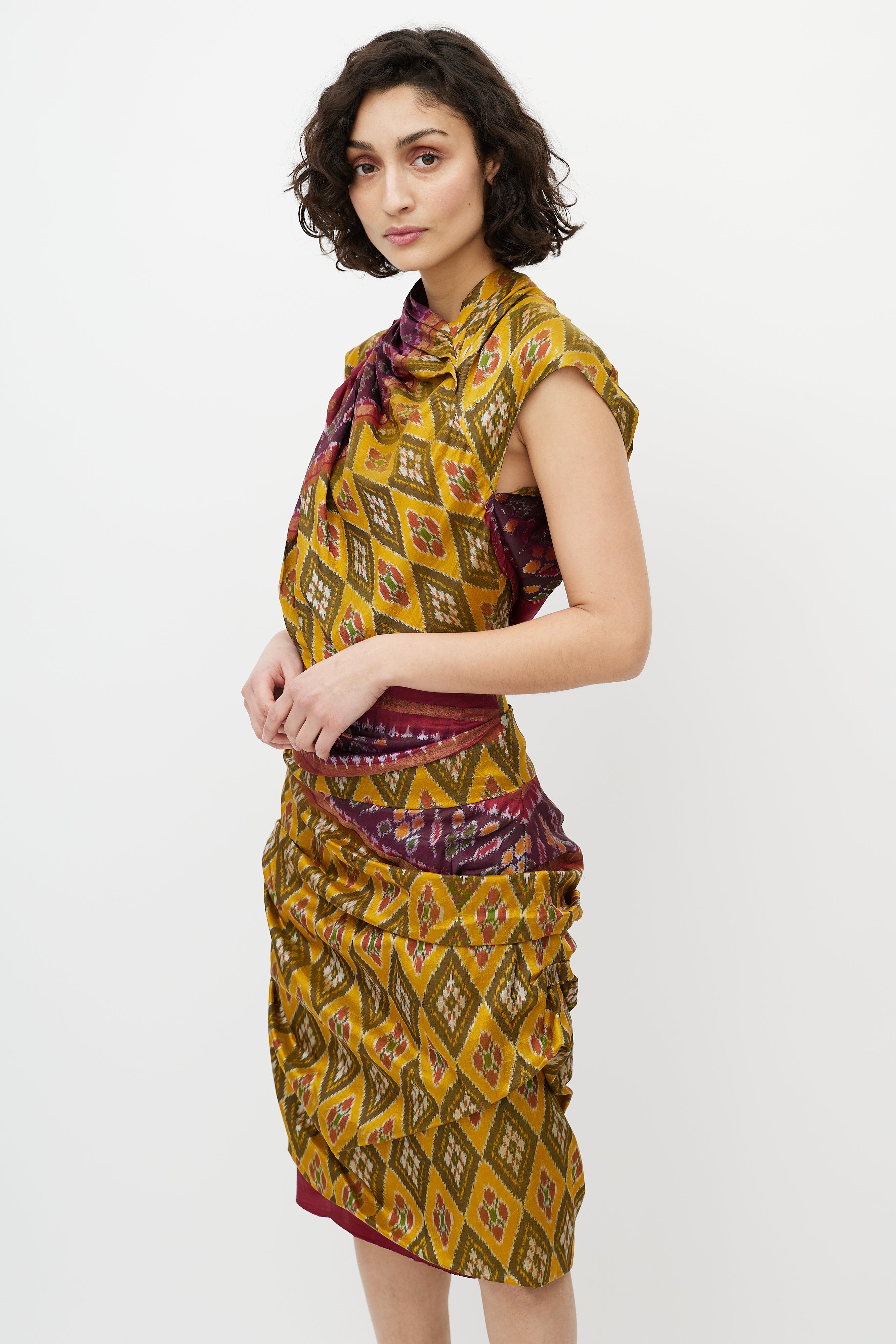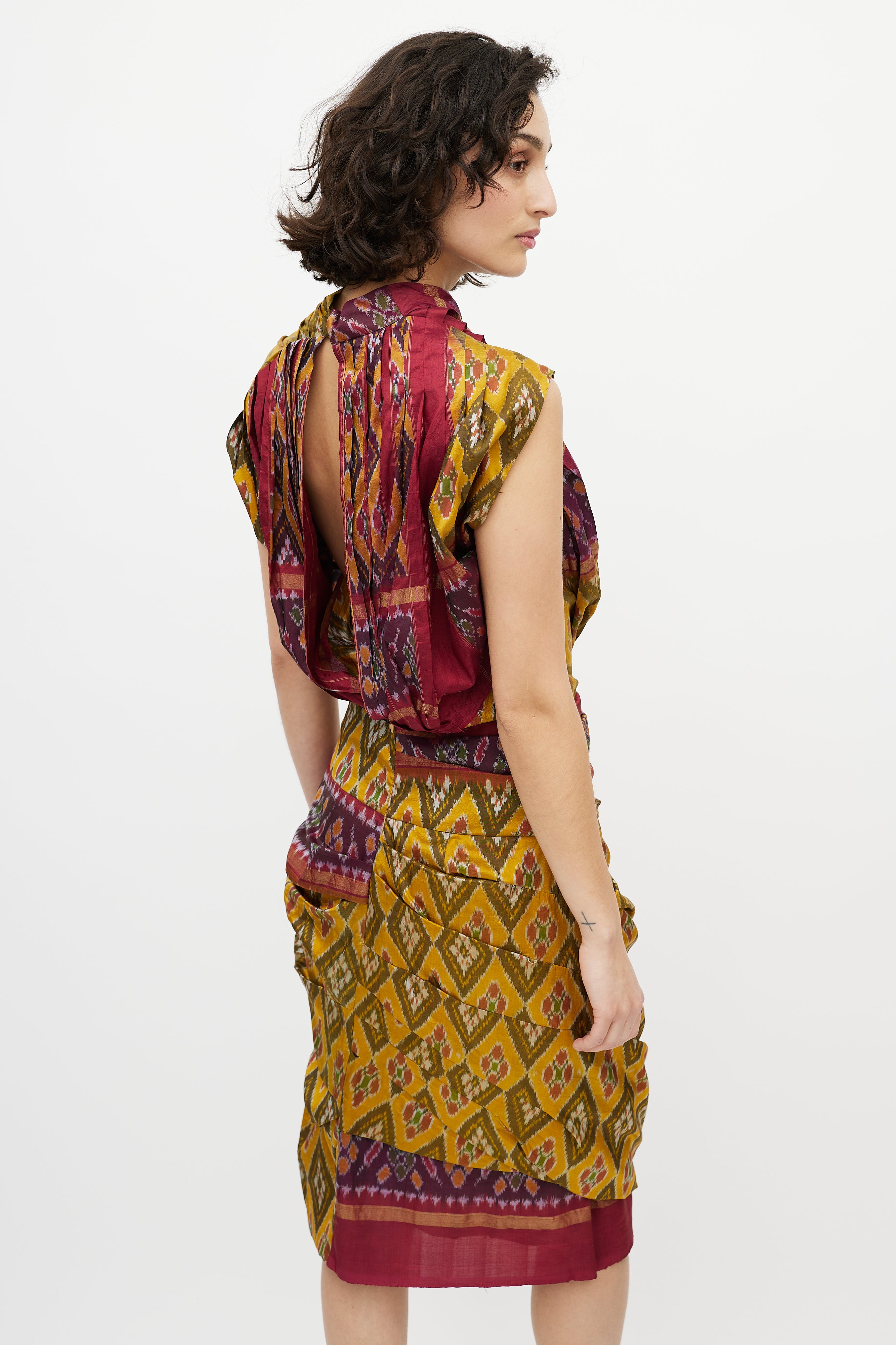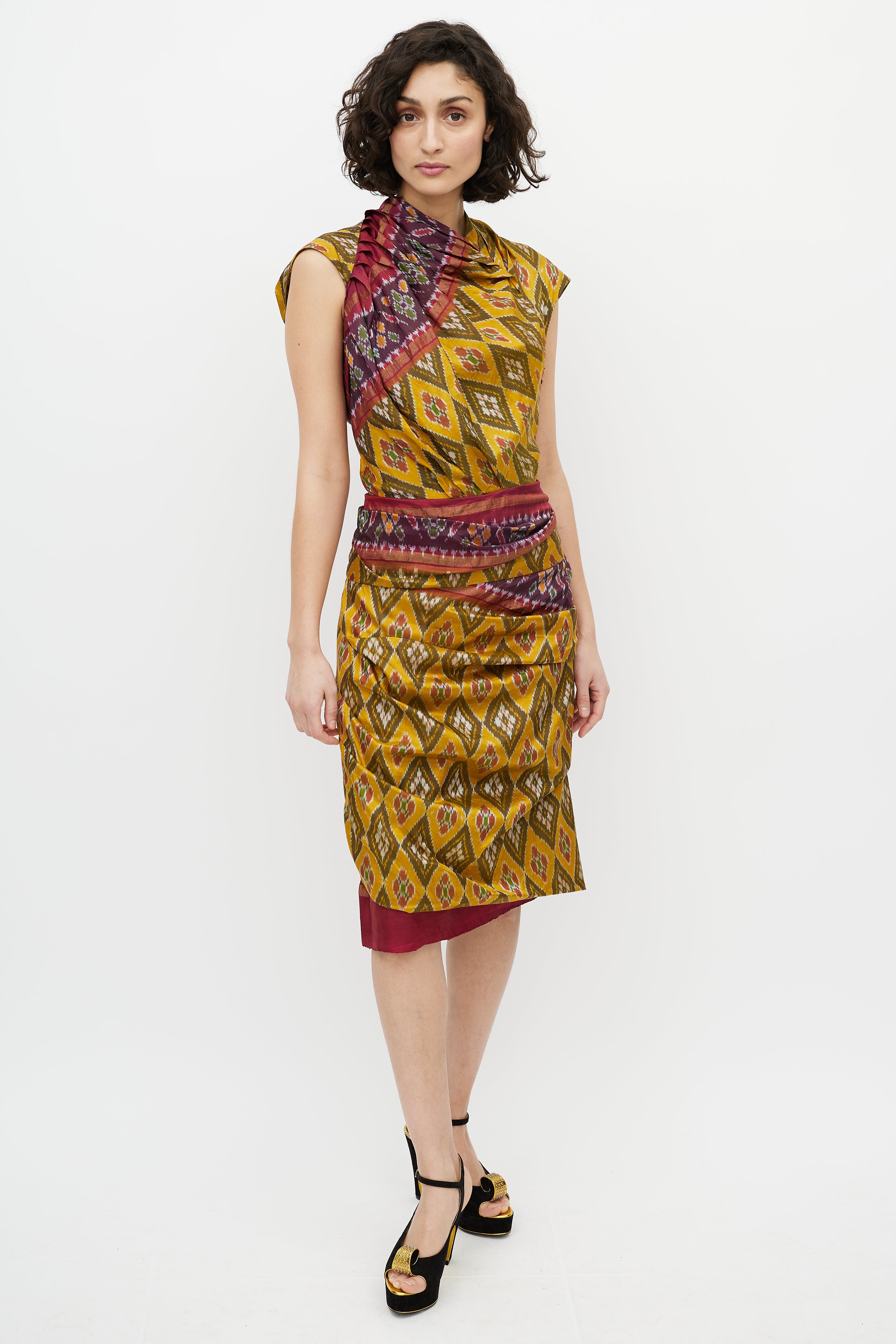 Pre-owned Dries Van Noten red and yellow silk dress featuring a tonal geometric pattern, round neckline, pleated detailing throughout, short cap sleeves, and zip at back with hook and eye closure. Lined.