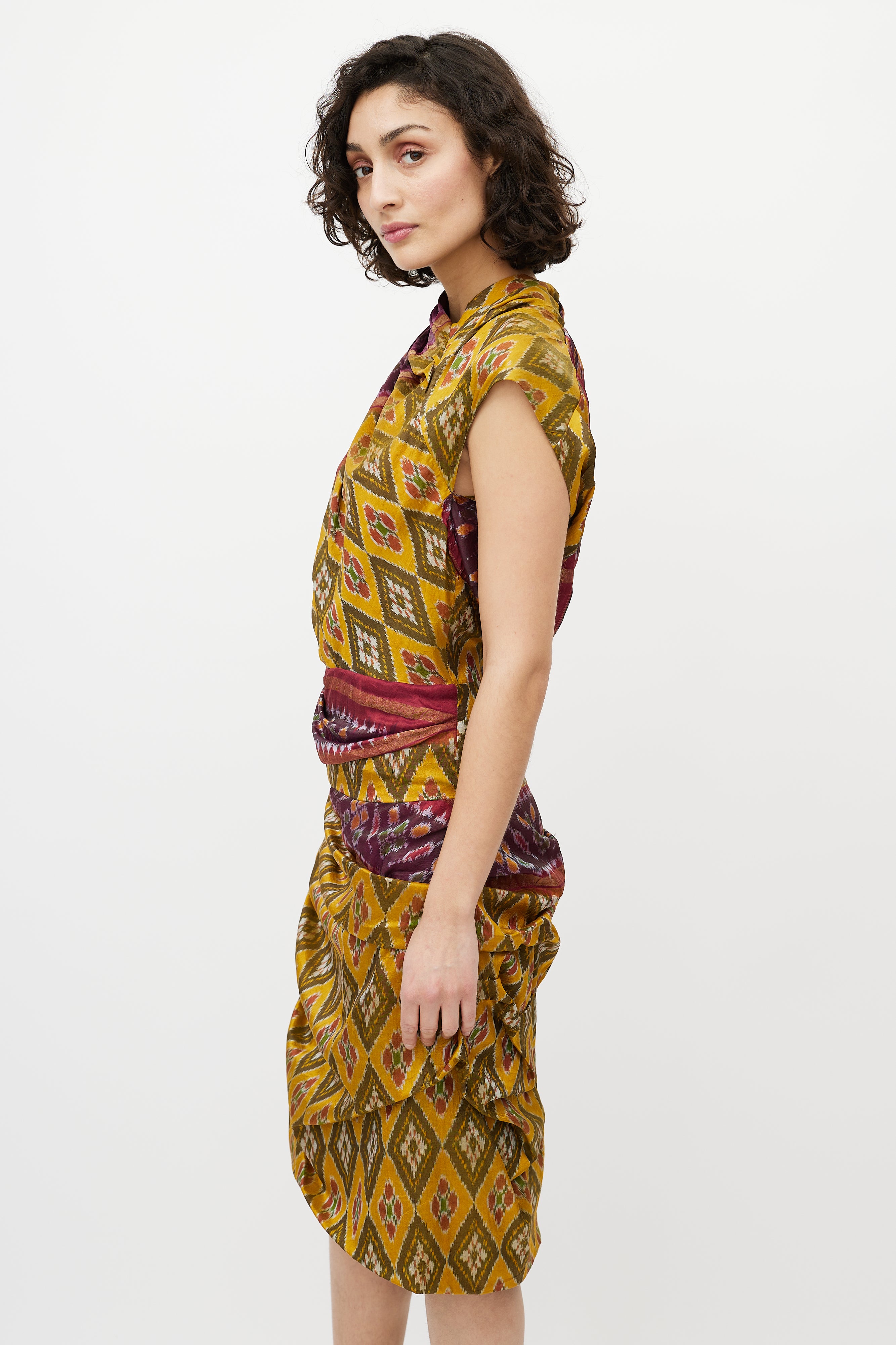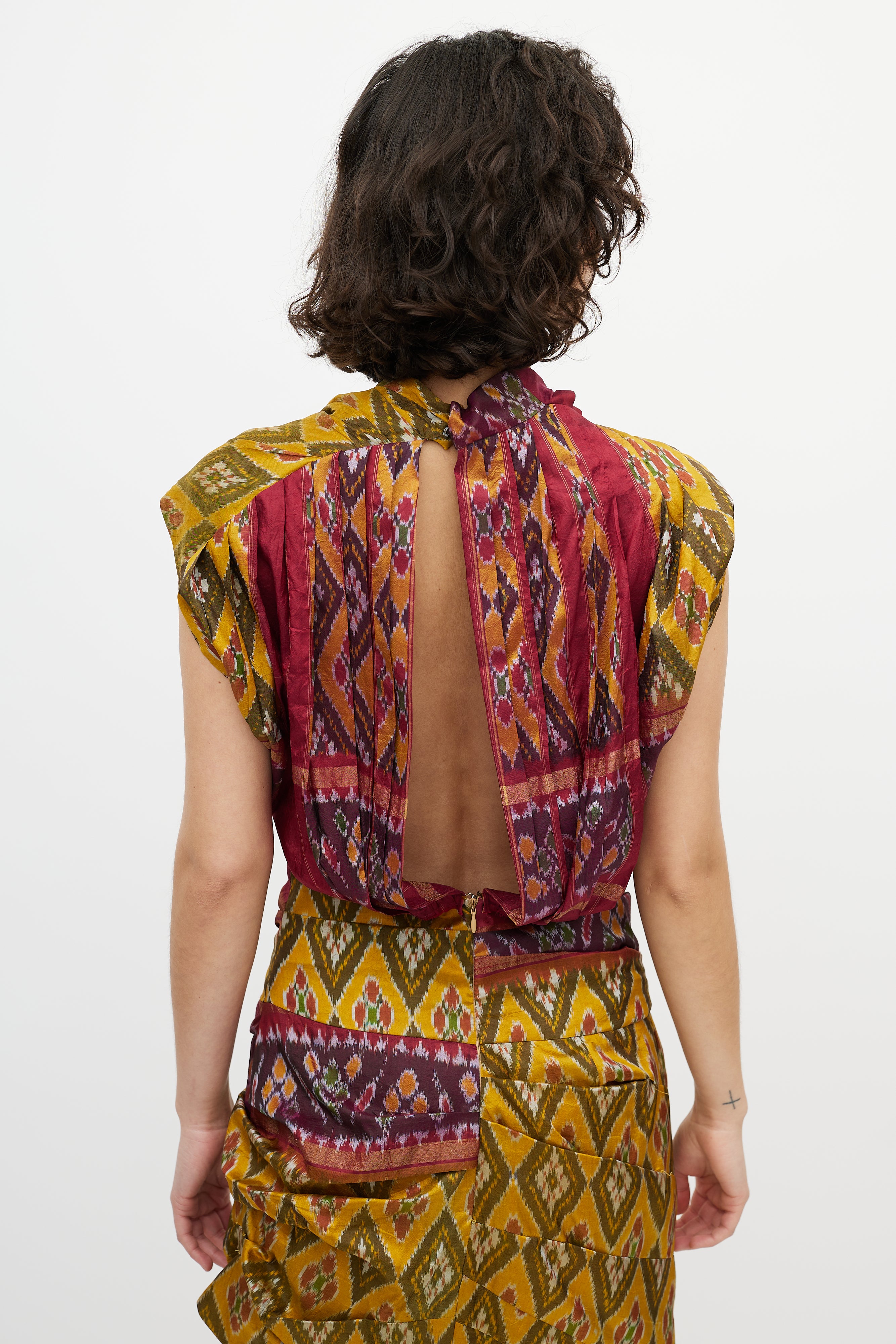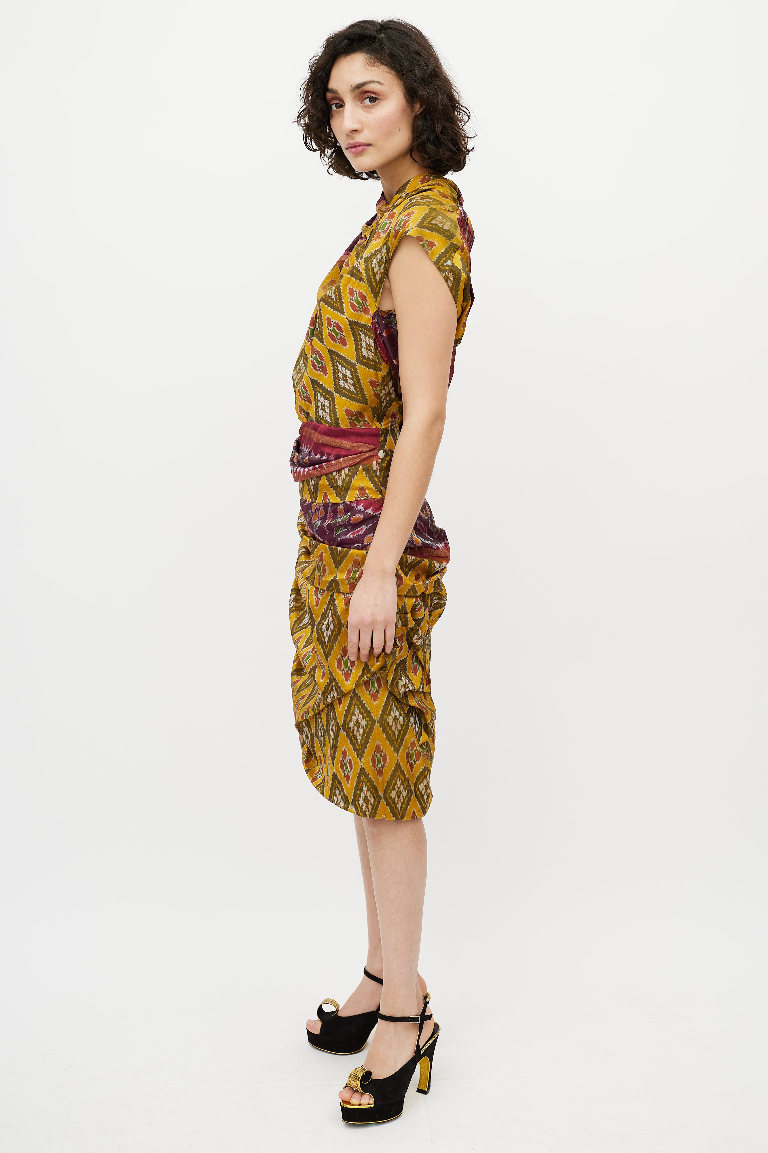 Pre-owned Dries Van Noten red and yellow silk dress featuring a tonal geometric pattern, round neckline, pleated detailing throughout, short cap sleeves, and zip at back with hook and eye closure. Lined.