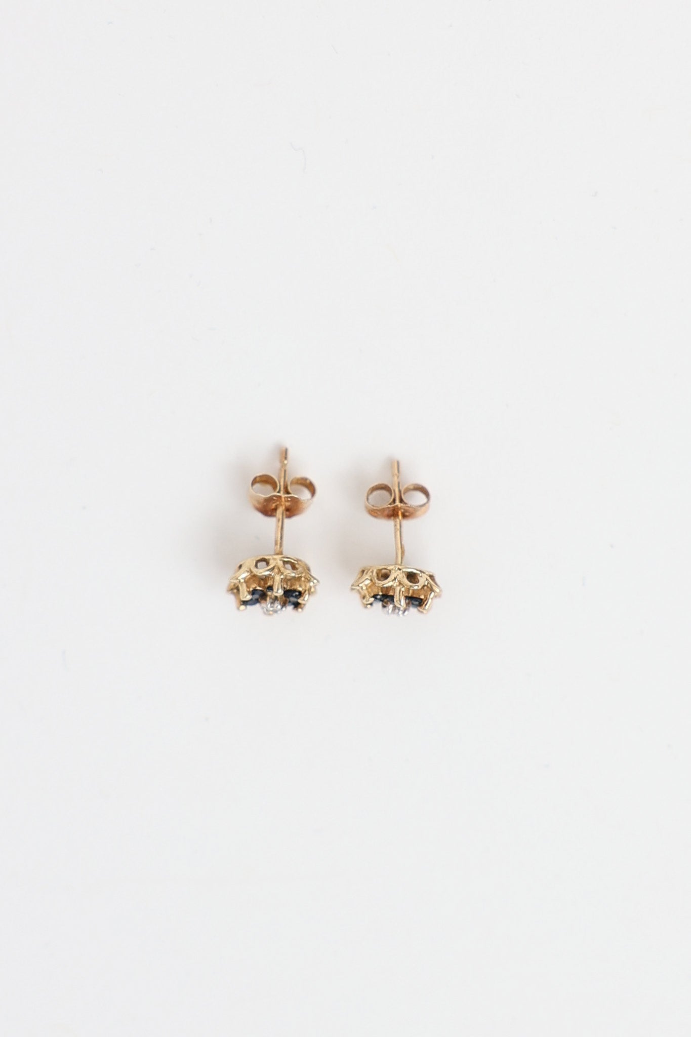 Pre-owned Fine Jewelry 10K yellow gold flower stud earrings featuring channel set style single cut diamond, claw set style round brilliant cut dark blue Sapphires, butterfly backs, and stamped "10K".