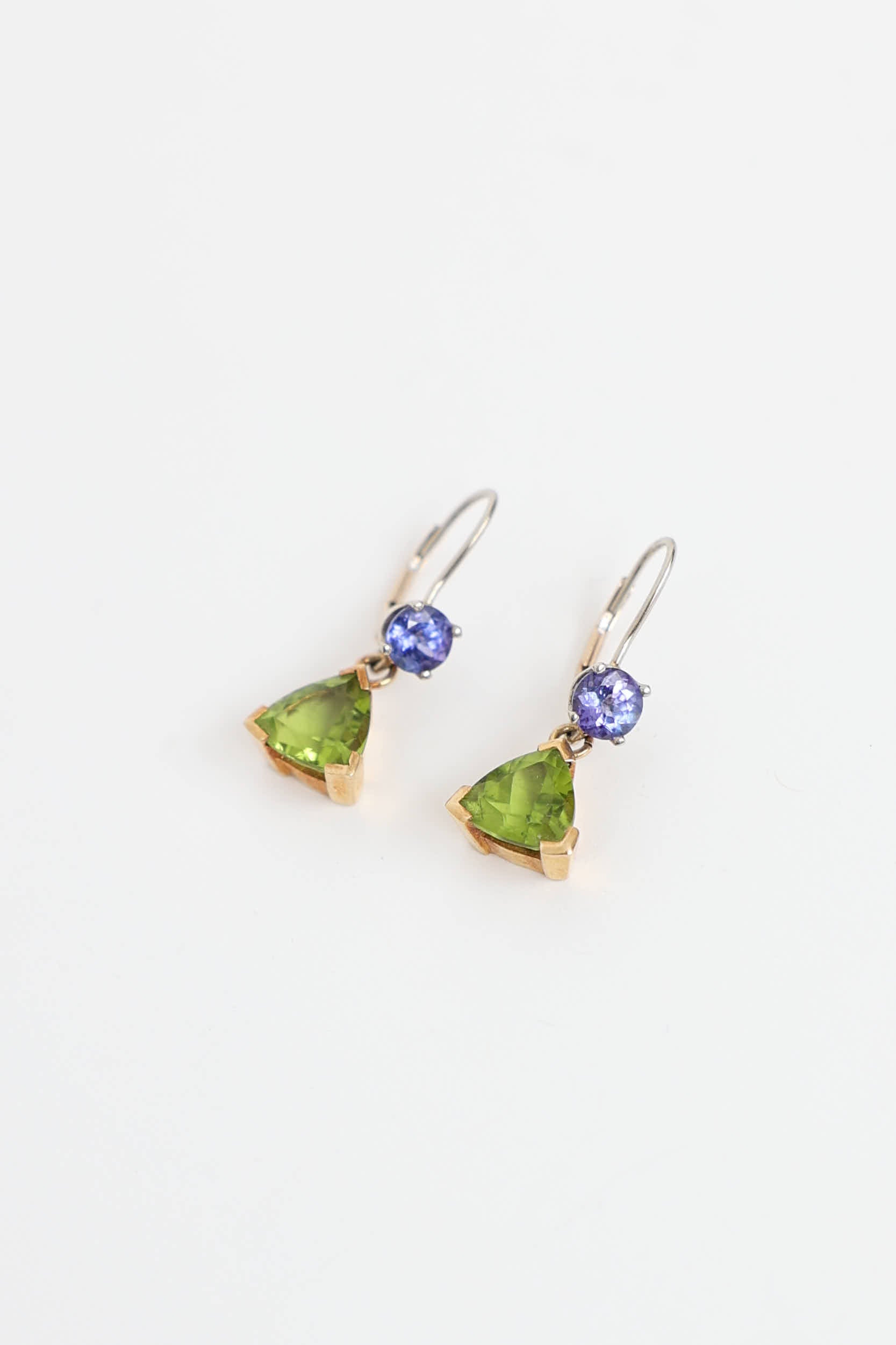 Pre-owned Fine Jewelry 14K yellow and white gold peridot and tanzanite earrings featuring drop dangle lever backing, claw set styling and stamped with "14K".