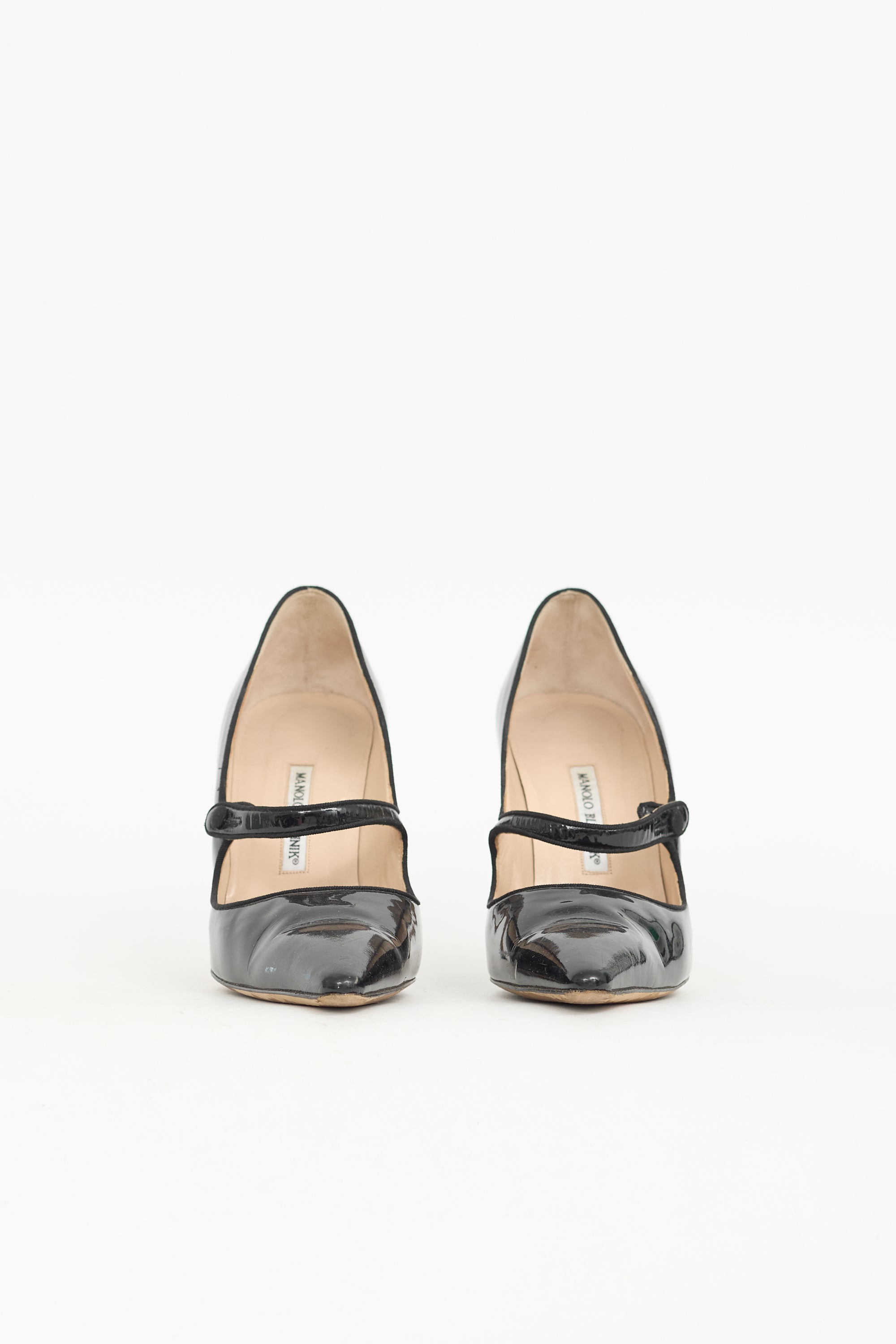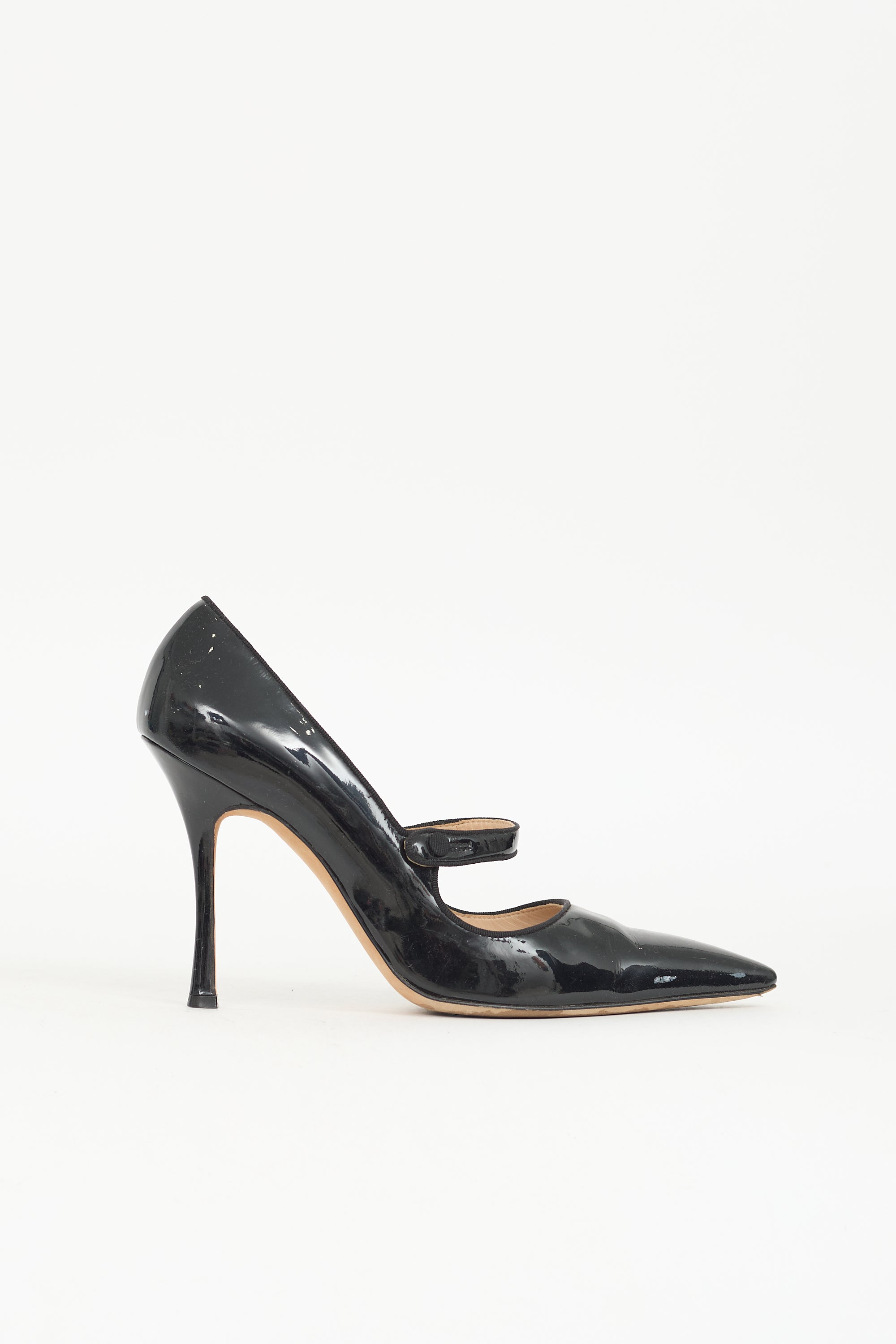 Pre-owned Manolo Blahnik black patent leather Camparinew Mary Jane pumps featuring pointed toe, elasticized instep strap, and covered continental heel. Comes with original dust bag.