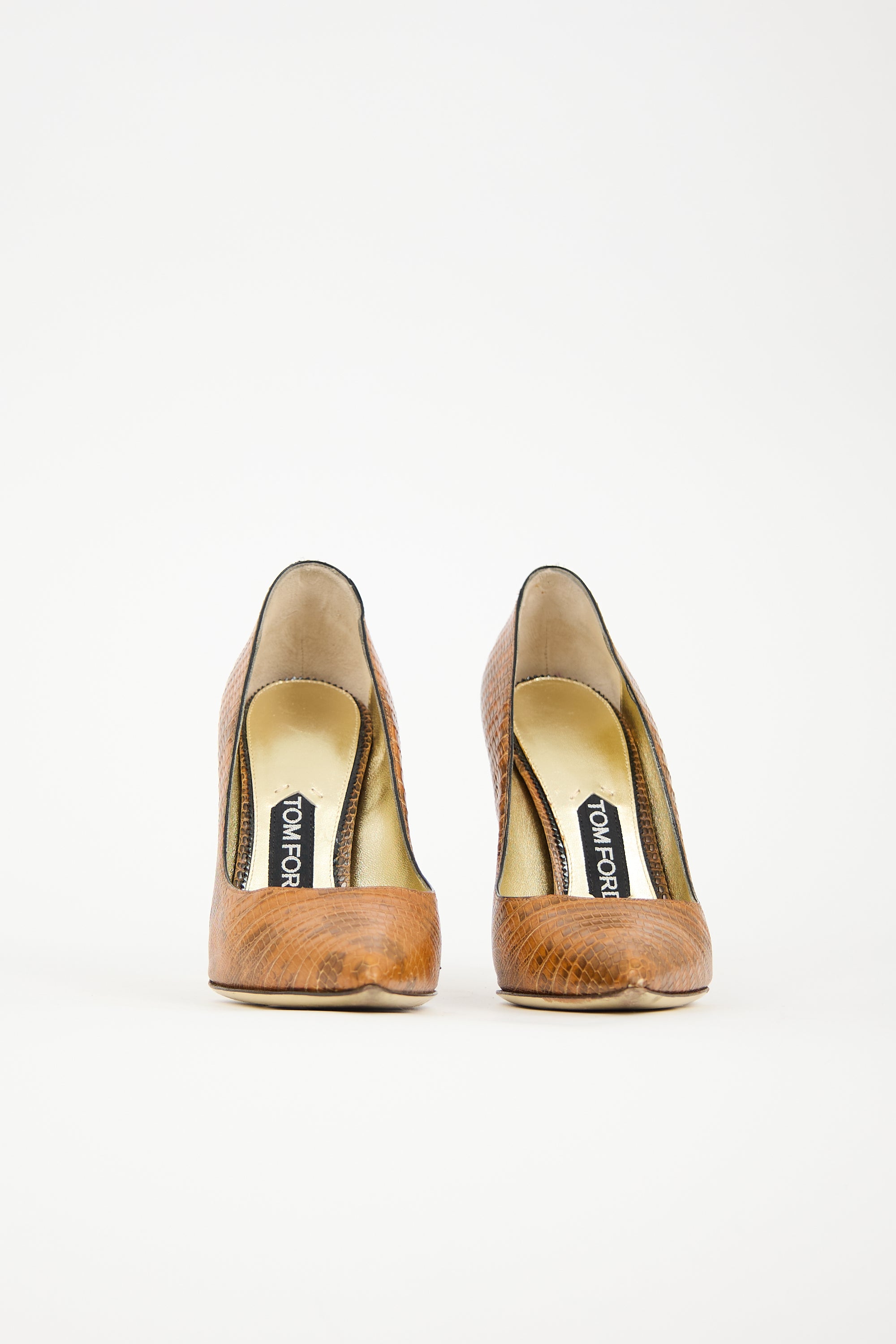 Pre-owned Tom Ford brown leather pumps featuring pointed toe, embossed and printed upper, and covered stiletto heel. Comes with original dust bags and spare heel tips.