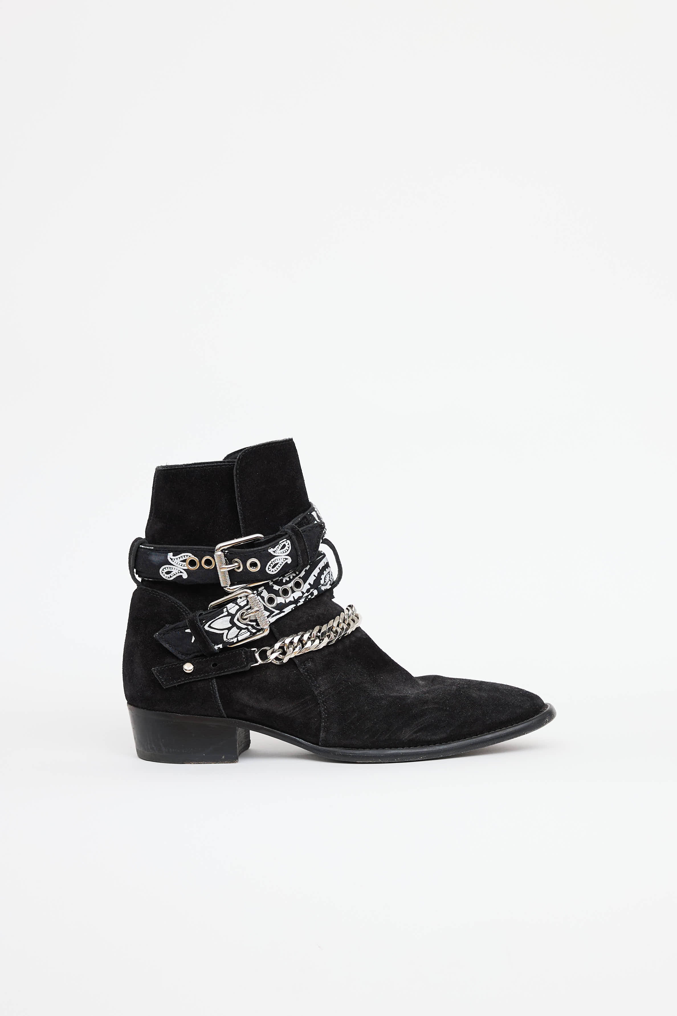 Pre-owned Amiri black suede western ankle boot featuring almond toe, stacked heel, chain at vamp, silver tone hardware, and adjustable straps at ankle.