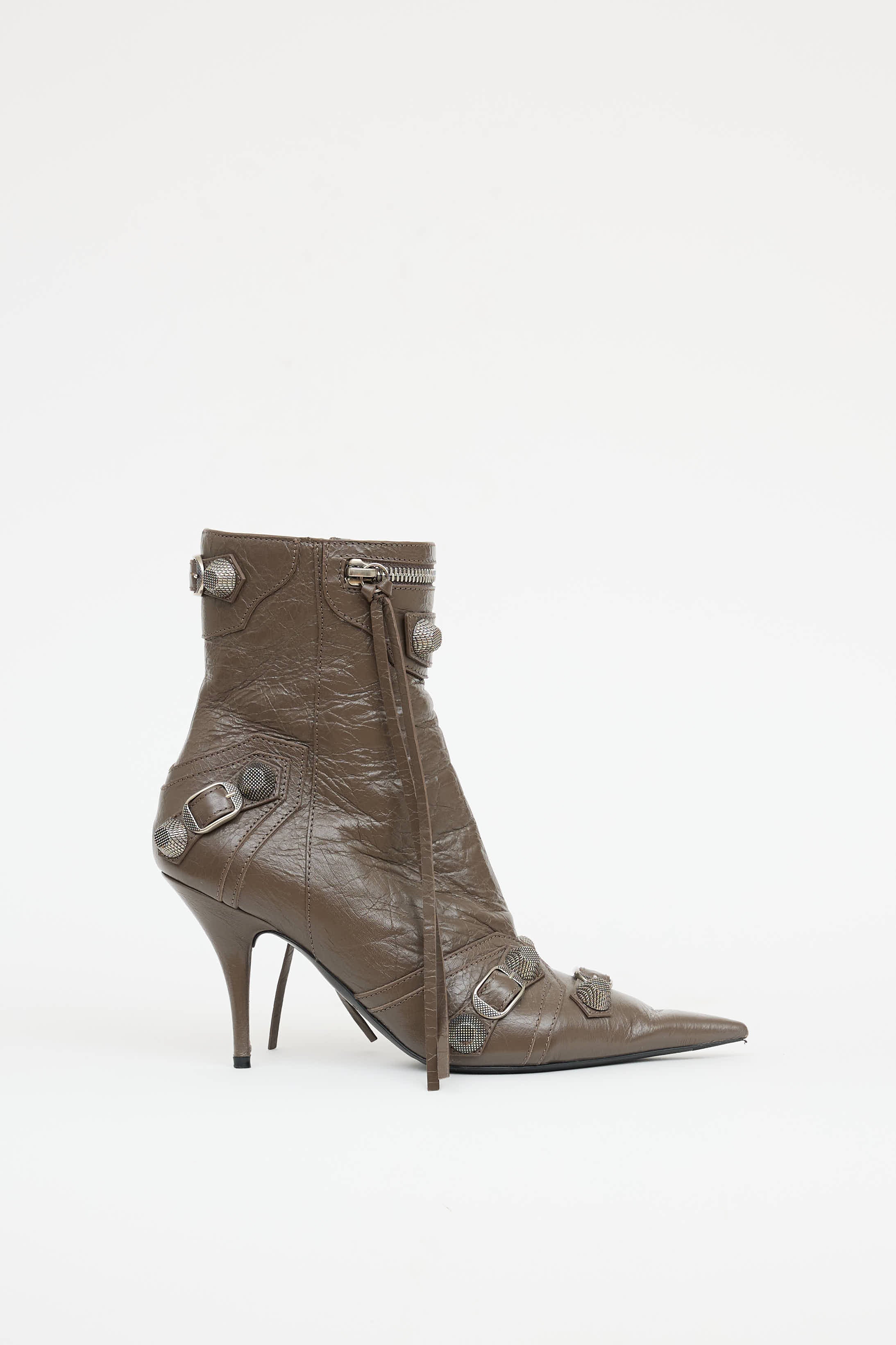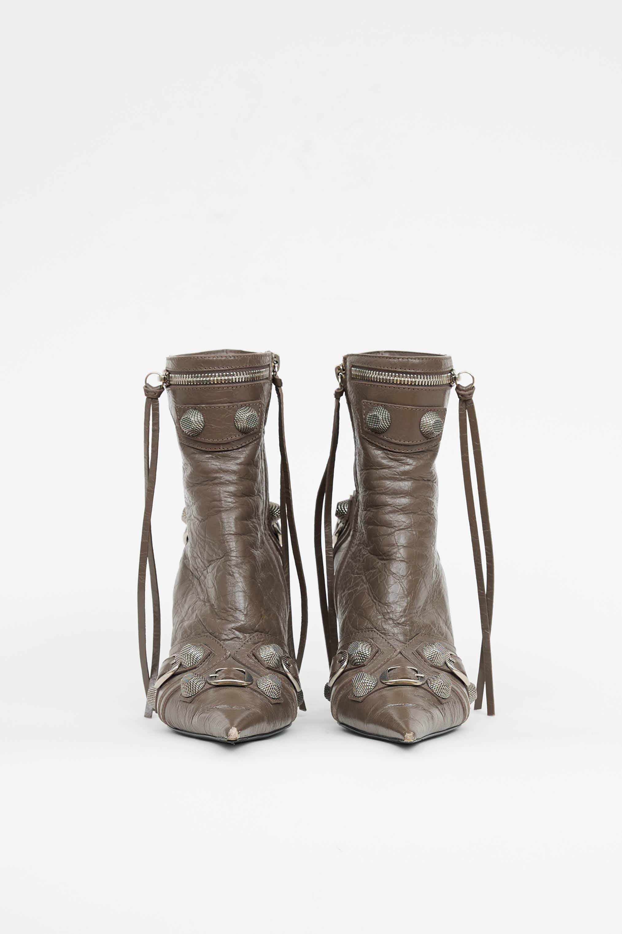 Pre-owned Balenciaga brown Arena Cagole ankle boots featuring silver tone studs, pointed toe, intentional creased leather, zipper detail at front and zip closure at side and short stiletto heel.