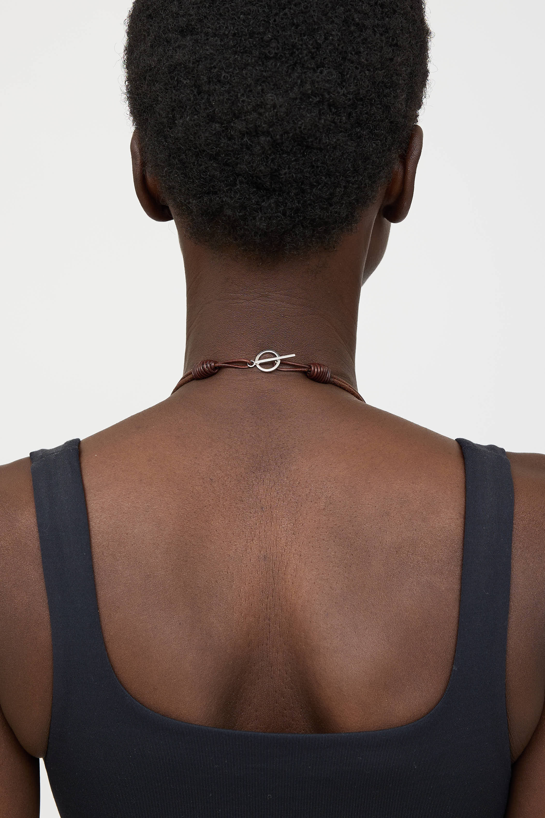 Pre-owned Brunello Cucinelli sterling silver necklace featuring grey circular stone ball beads, brown braided leather trim, "925" stamping at pendant, and toggle clasp closure.